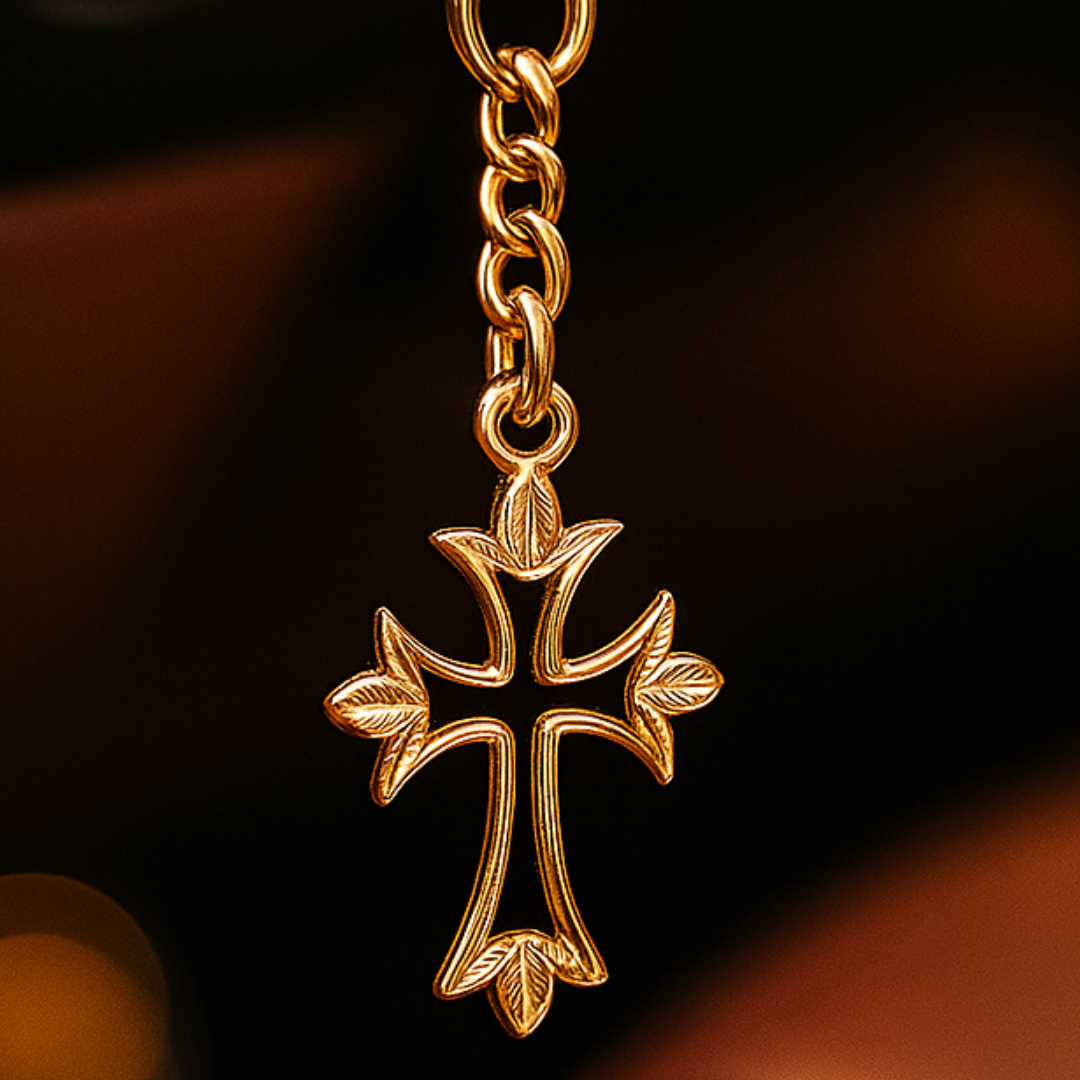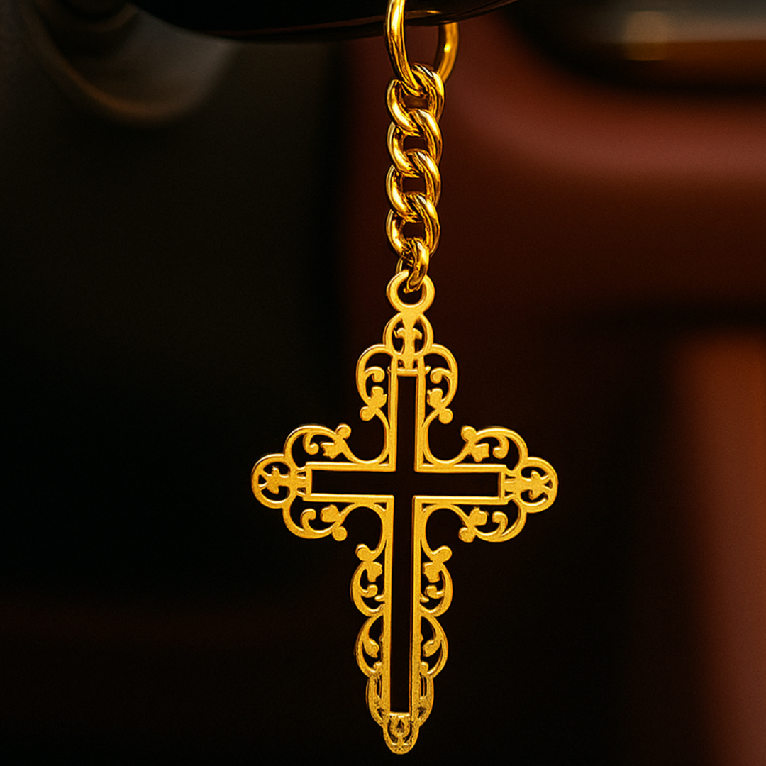 Elita Decorative Cross Keychain with Chain Link, Gold-Tone Brass, Ornate Design With Gold Plated Finish