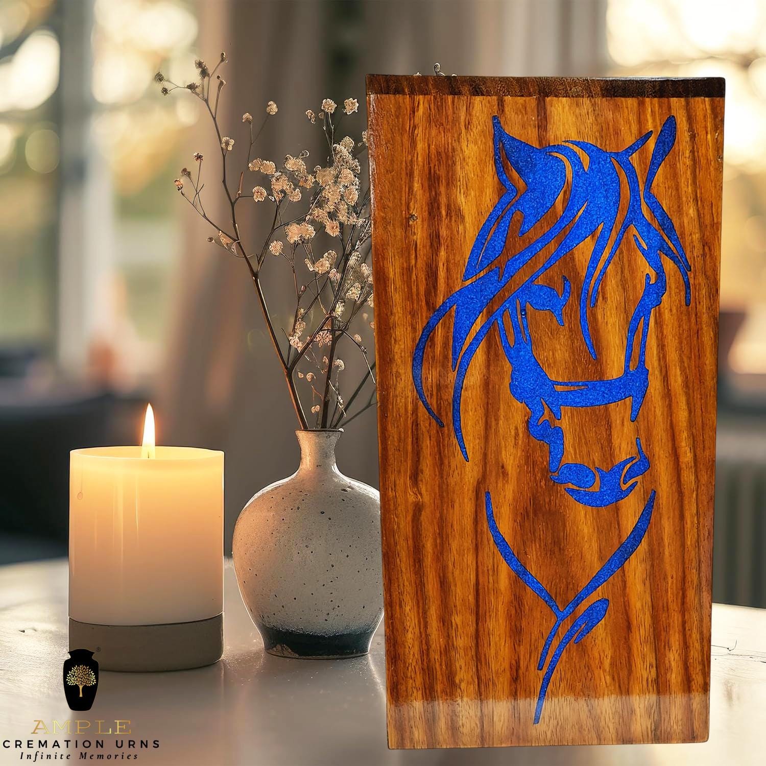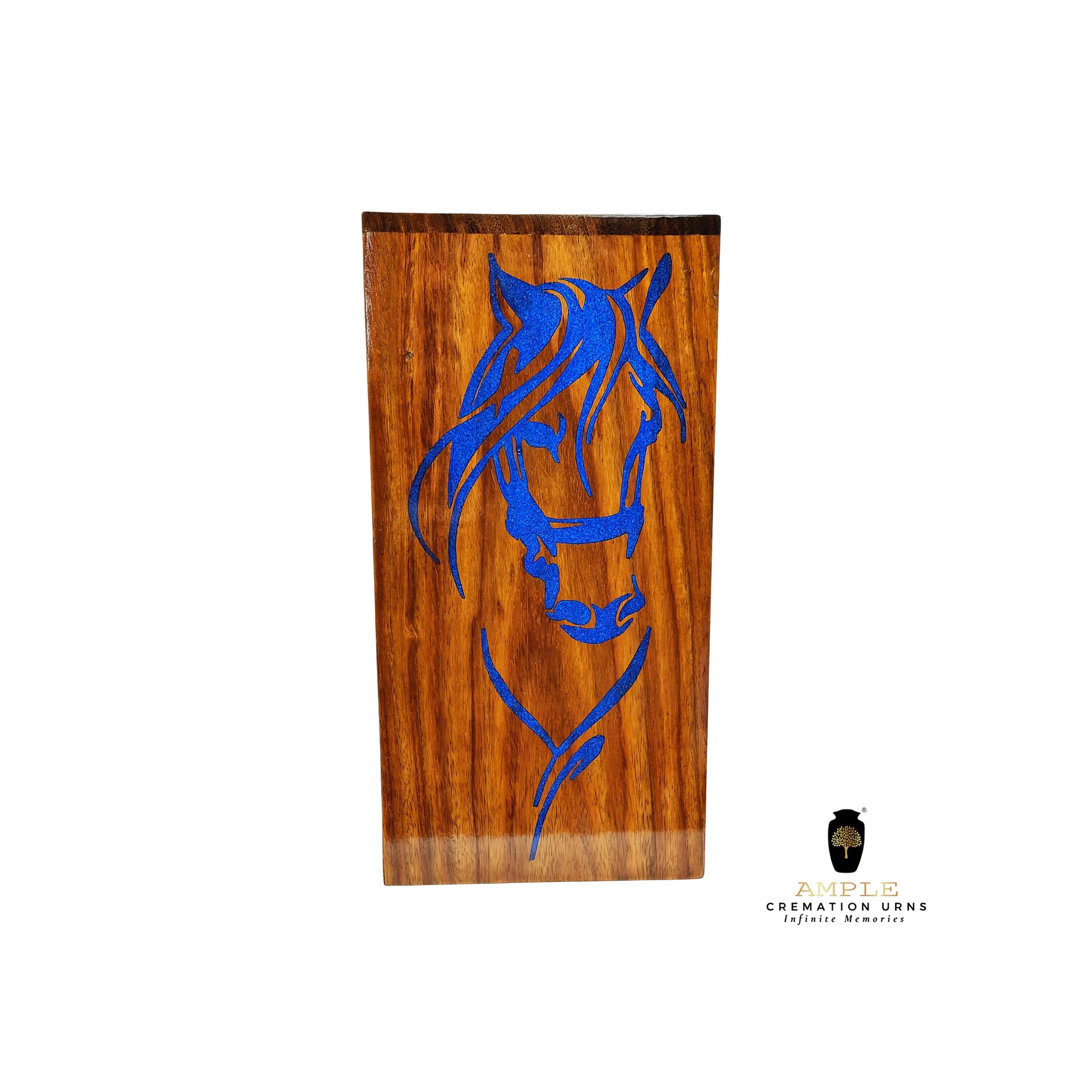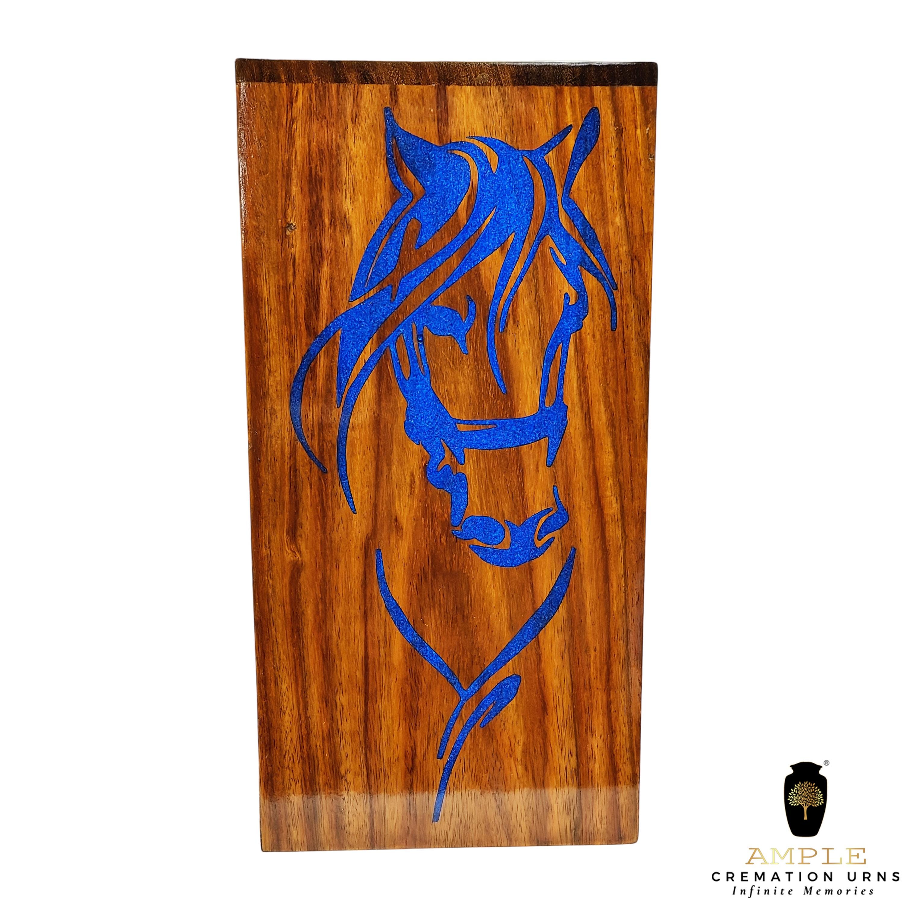 Honor the spirit of your beloved horse with this handcrafted wooden cremation urn, featuring a striking blue inlay of a majestic horse silhouette. This elegant box is perfect for preserving ashes or keepsakes in a meaningful and artistic way. 🐴💙