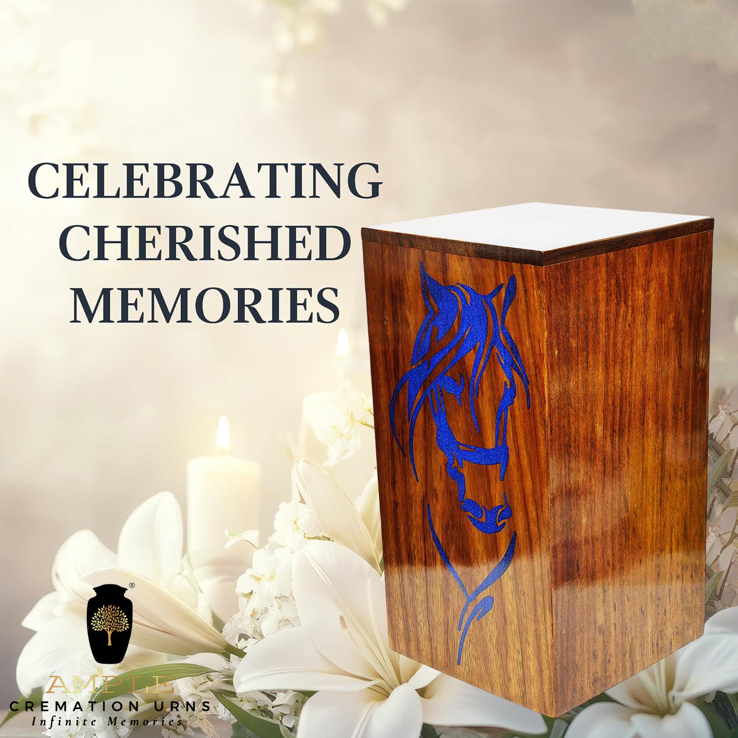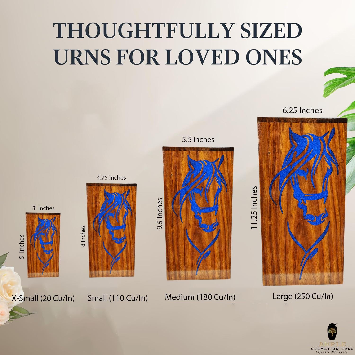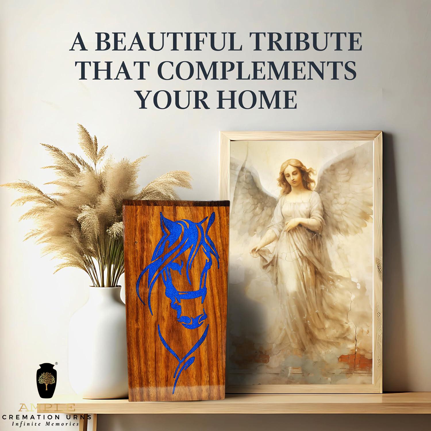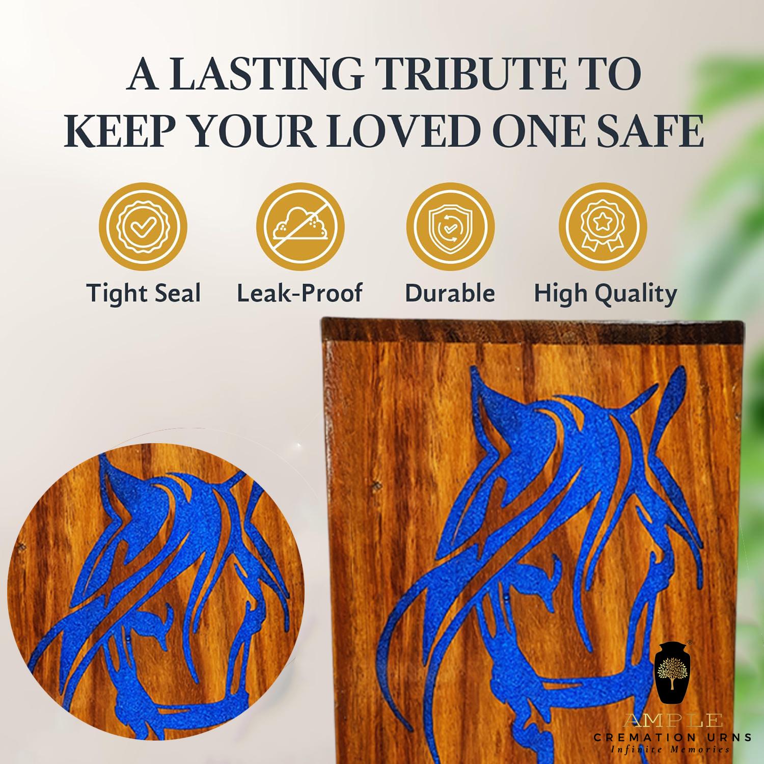 Honor the spirit of your beloved horse with this handcrafted wooden cremation urn, featuring a striking blue inlay of a majestic horse silhouette. This elegant box is perfect for preserving ashes or keepsakes in a meaningful and artistic way. 🐴💙