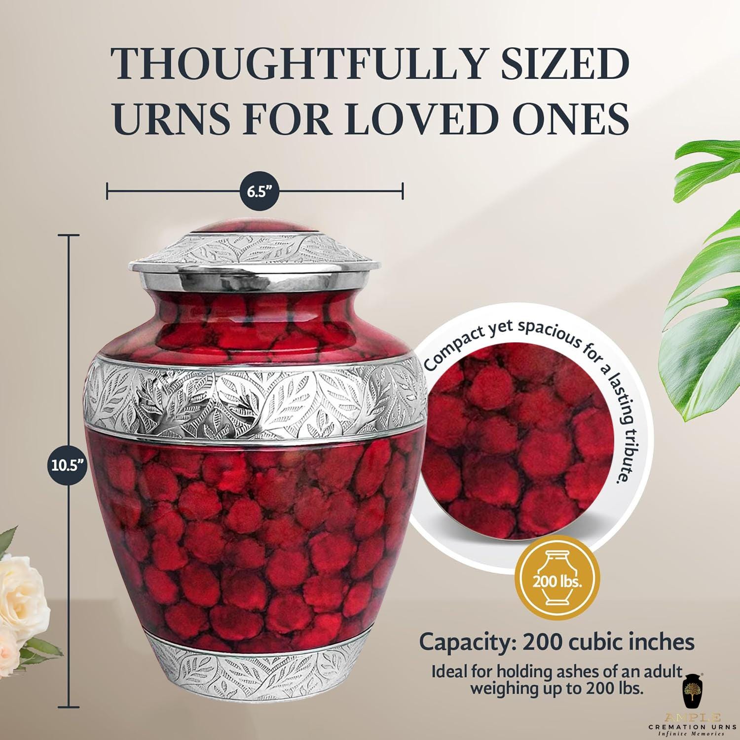 • Adult Urn (200 cu in): Designed to hold ashes for individuals up to 200 lbs