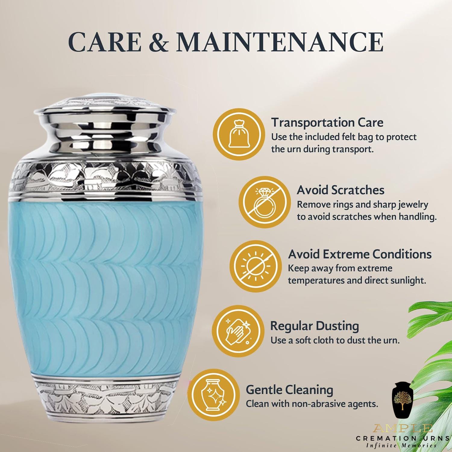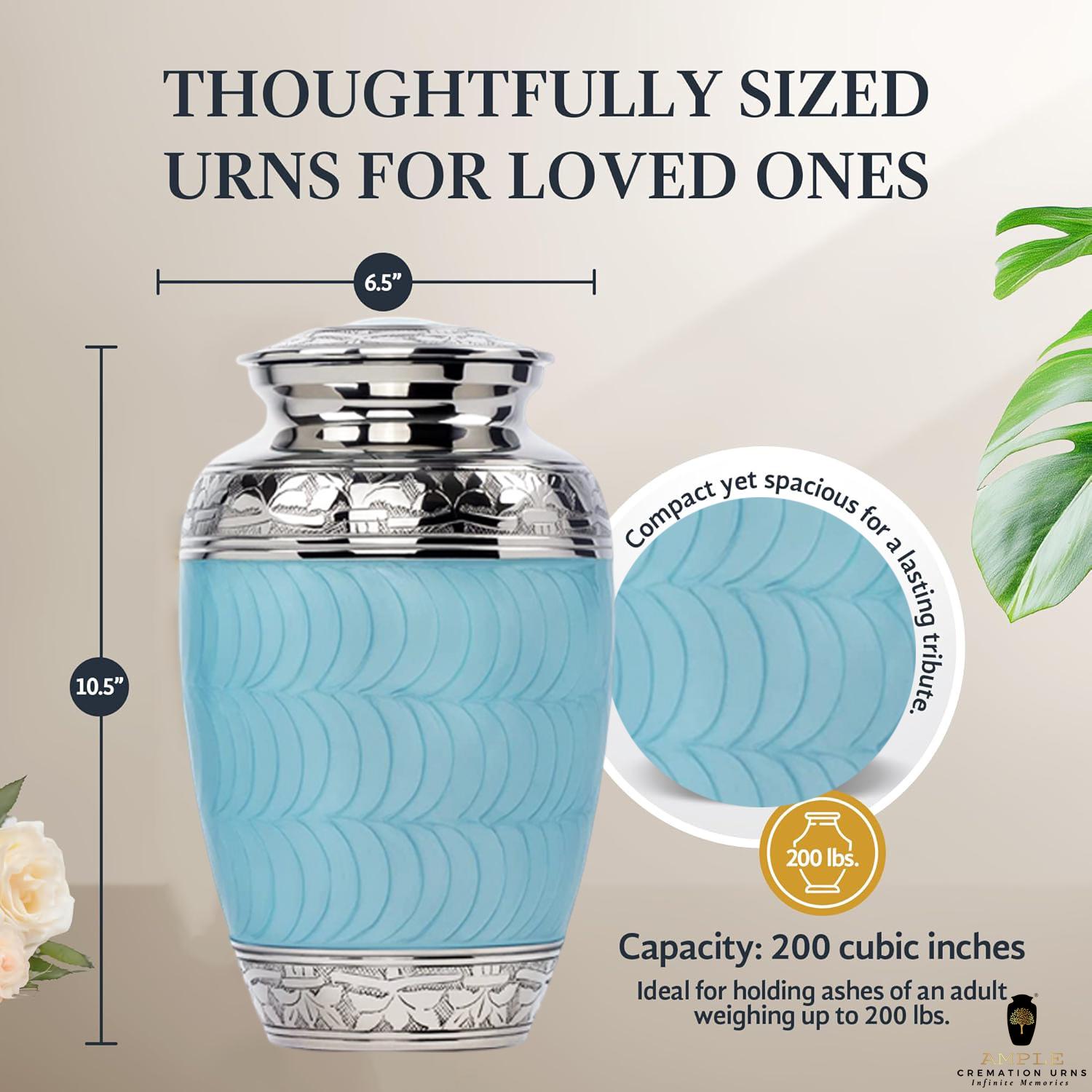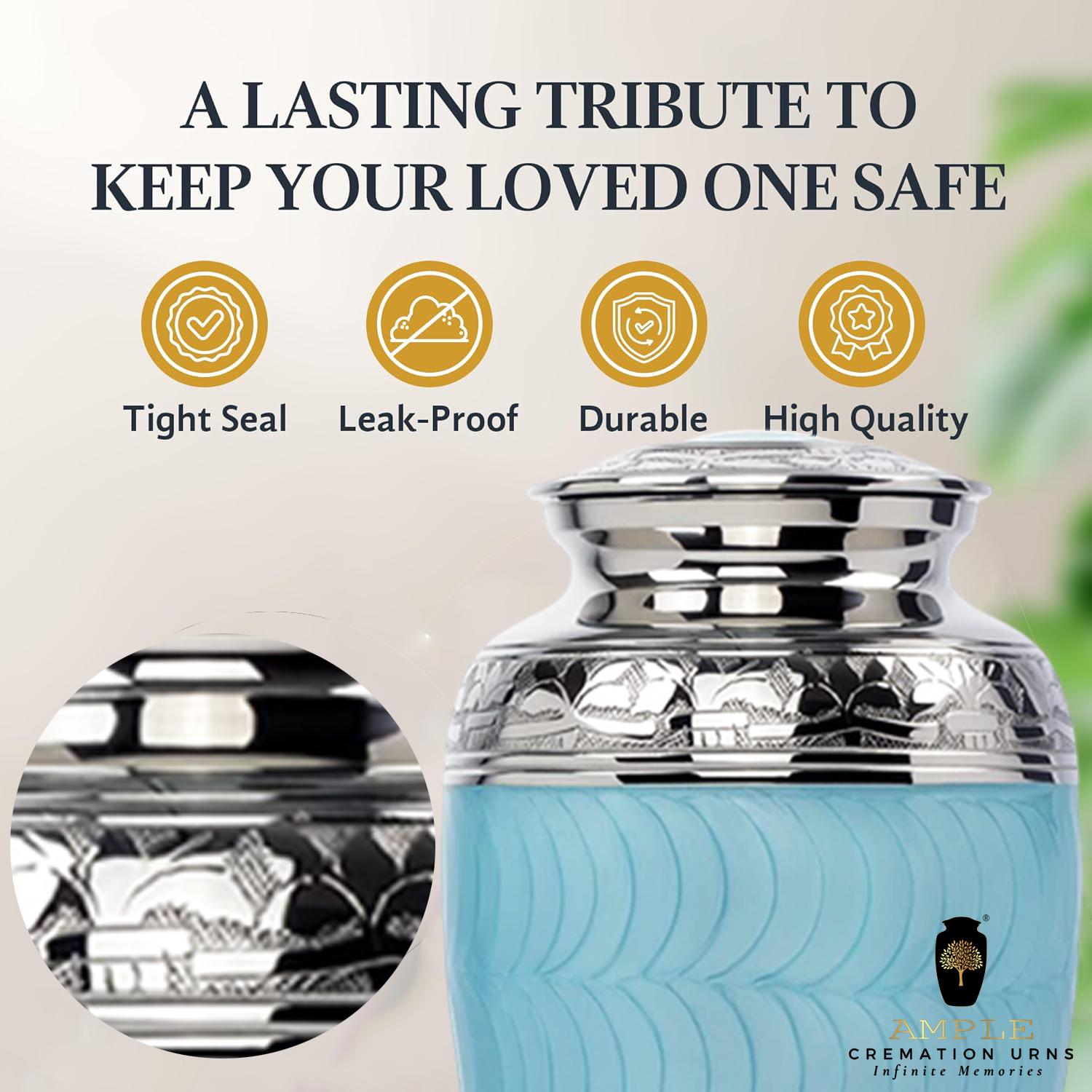 Honor your loved one with our Ample Cremation Urns, thoughtfully designed to celebrate cherished memories. These premium aluminum urns (6.5" × 10.5") combine elegant craftsmanship with practical functionality, featuring a secure leak-proof seal and timeless design that beautifully complements any home decor while safely holding ashes of adults up to 200 lbs (200 cubic inch capacity).