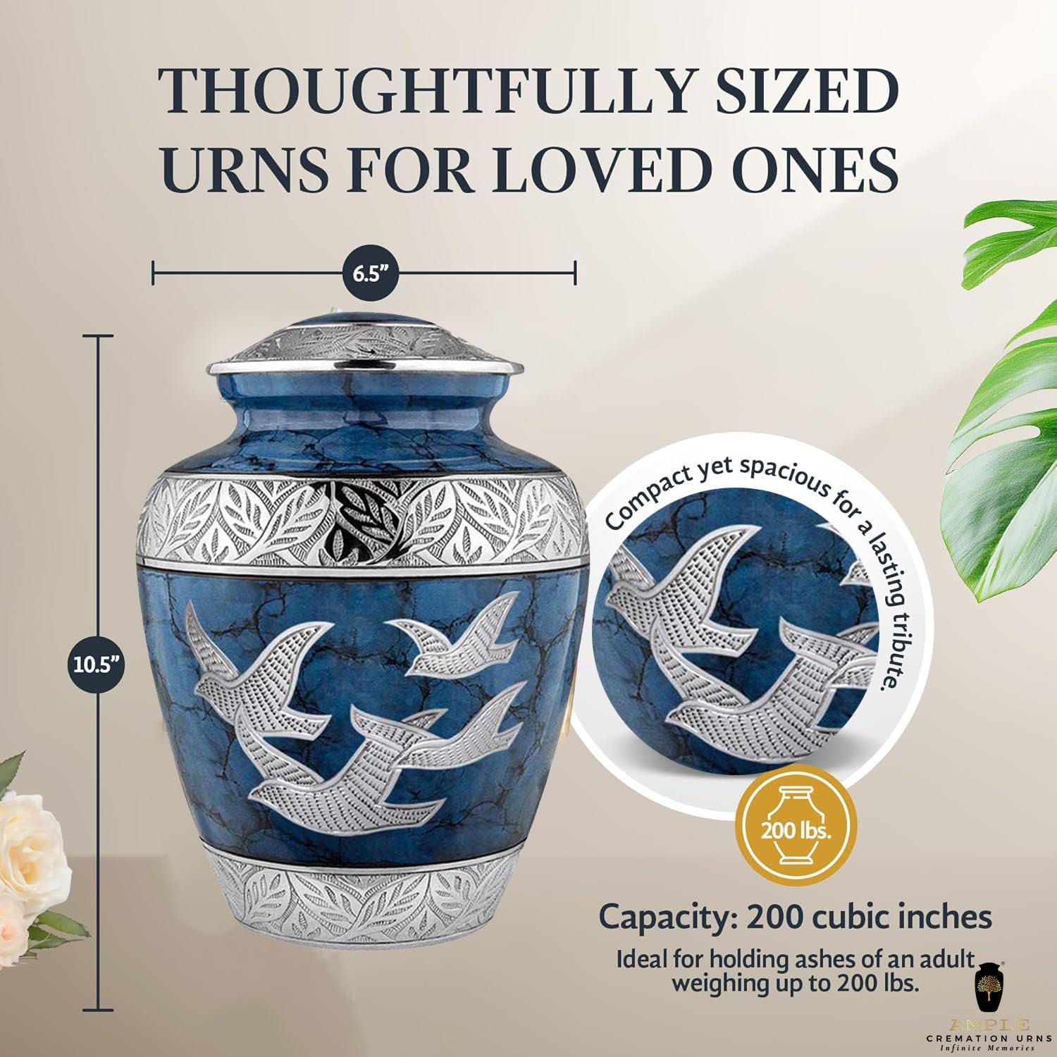 • Large Adult Urn (220 cu in) - Holds ashes for adults up to 200 lbs (6.5"×10.5")