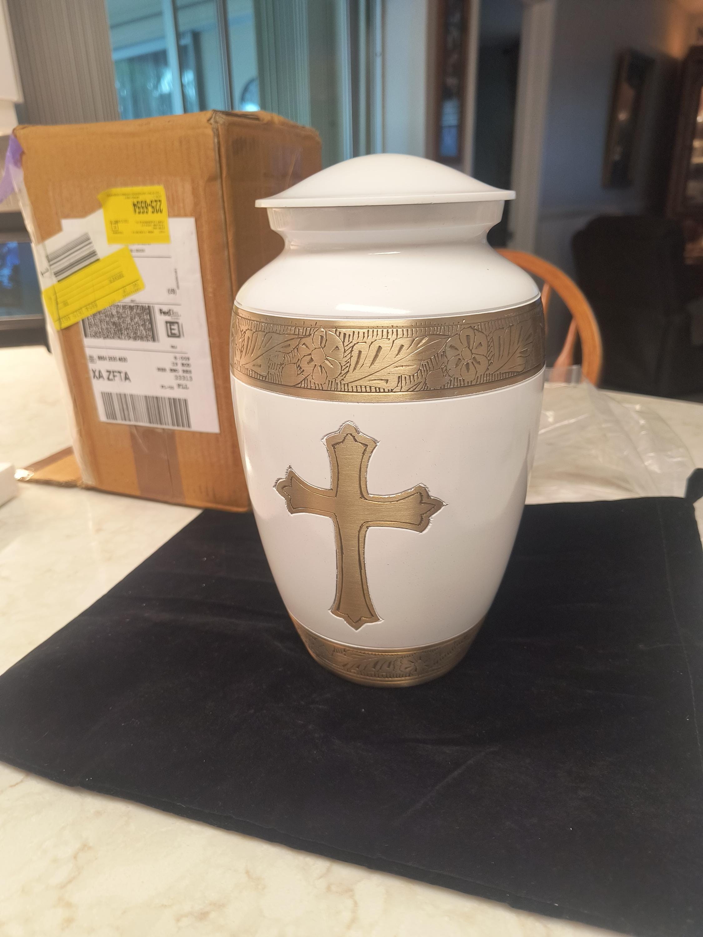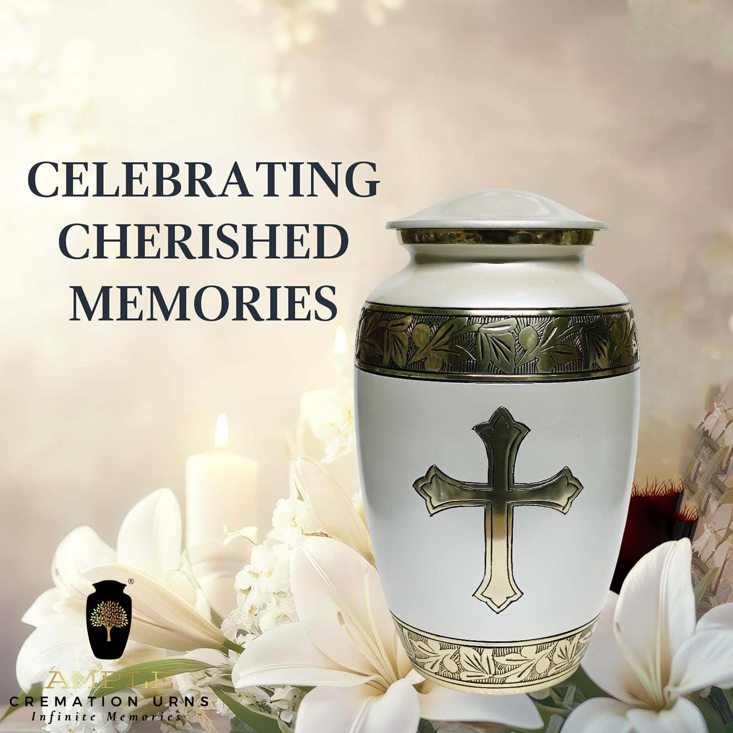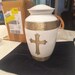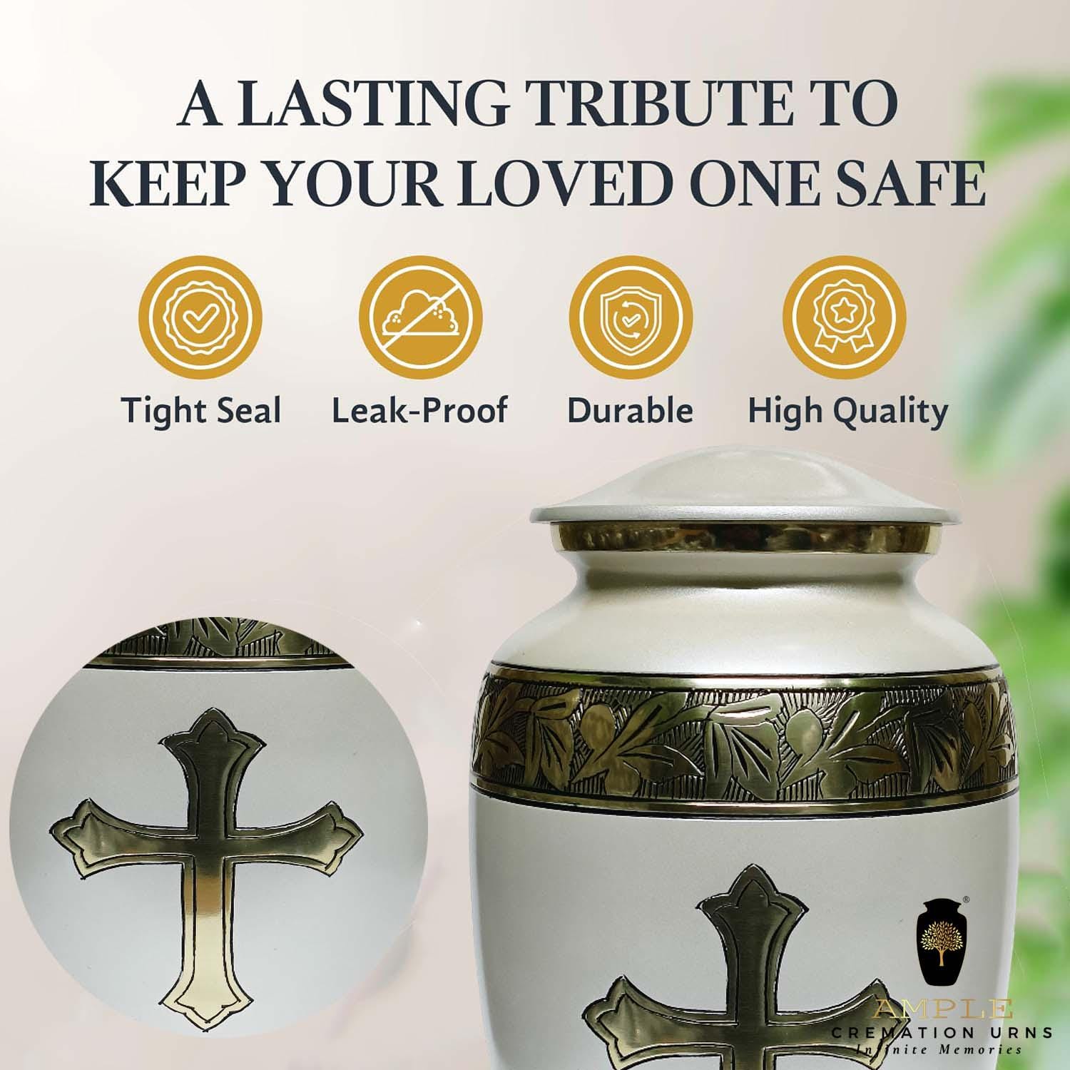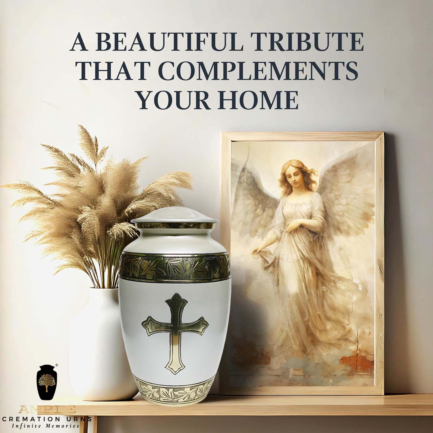 Celebrate the life and faith of a loved one with this beautifully crafted cremation urn featuring a gold Christian cross on a smooth pearl-white body. Measuring 6.5 x 6.5 x 10.5 inches, this urn is sized to hold the ashes of one adult, making it an ideal choice for home memorials or final resting places.