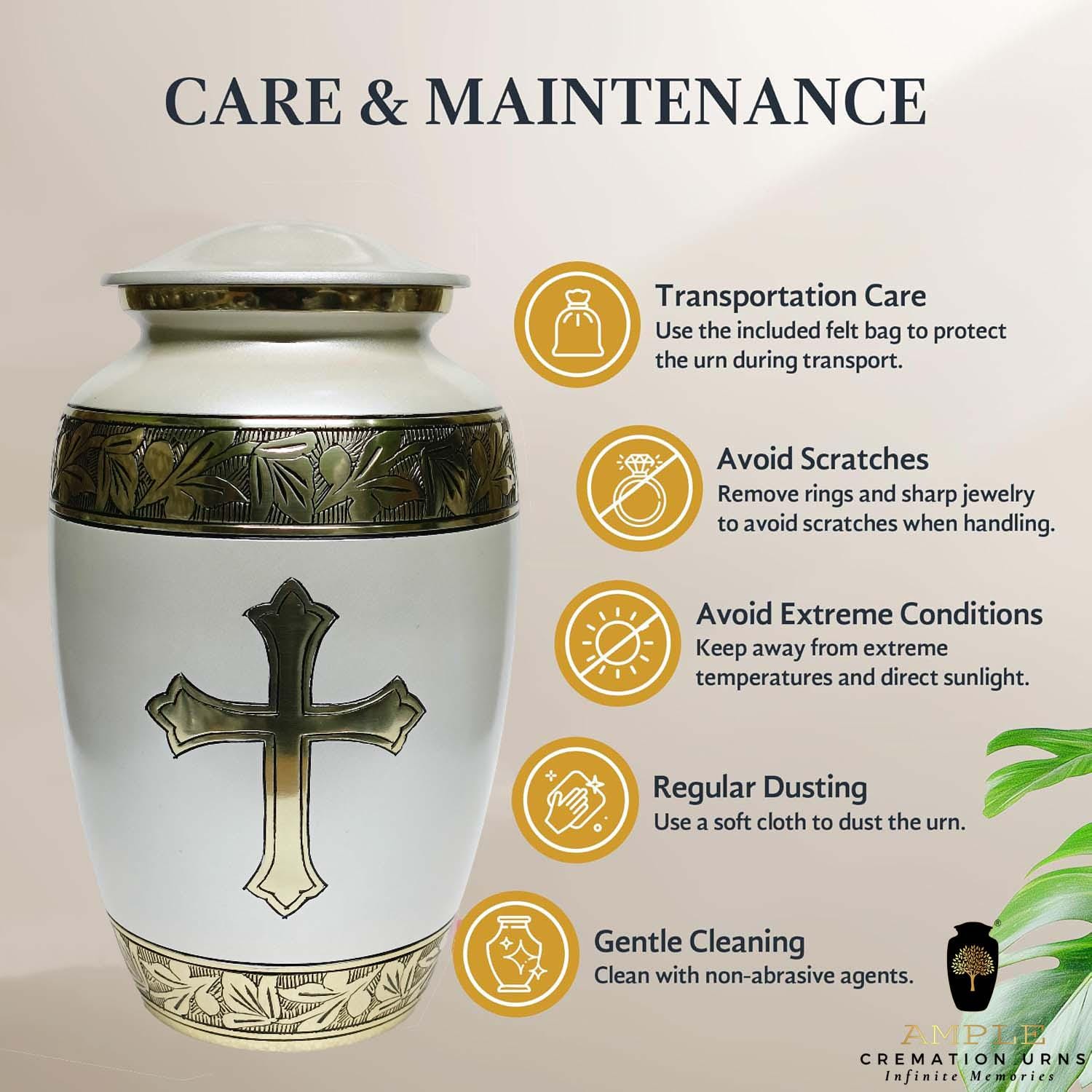 The urn is further adorned with finely engraved gold-tone leaf patterns on both the upper and lower bands, adding elegance and grace to its design. Crafted from high-quality metal, this urn offers durability, dignity, and a peaceful presence.