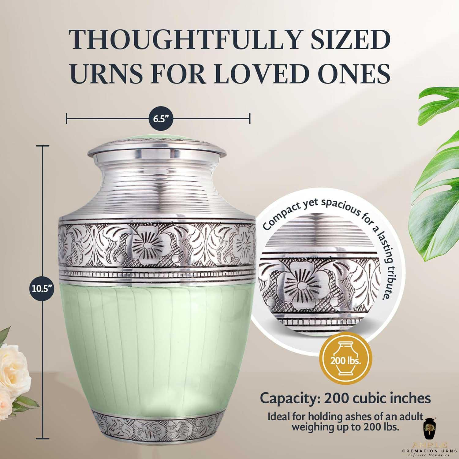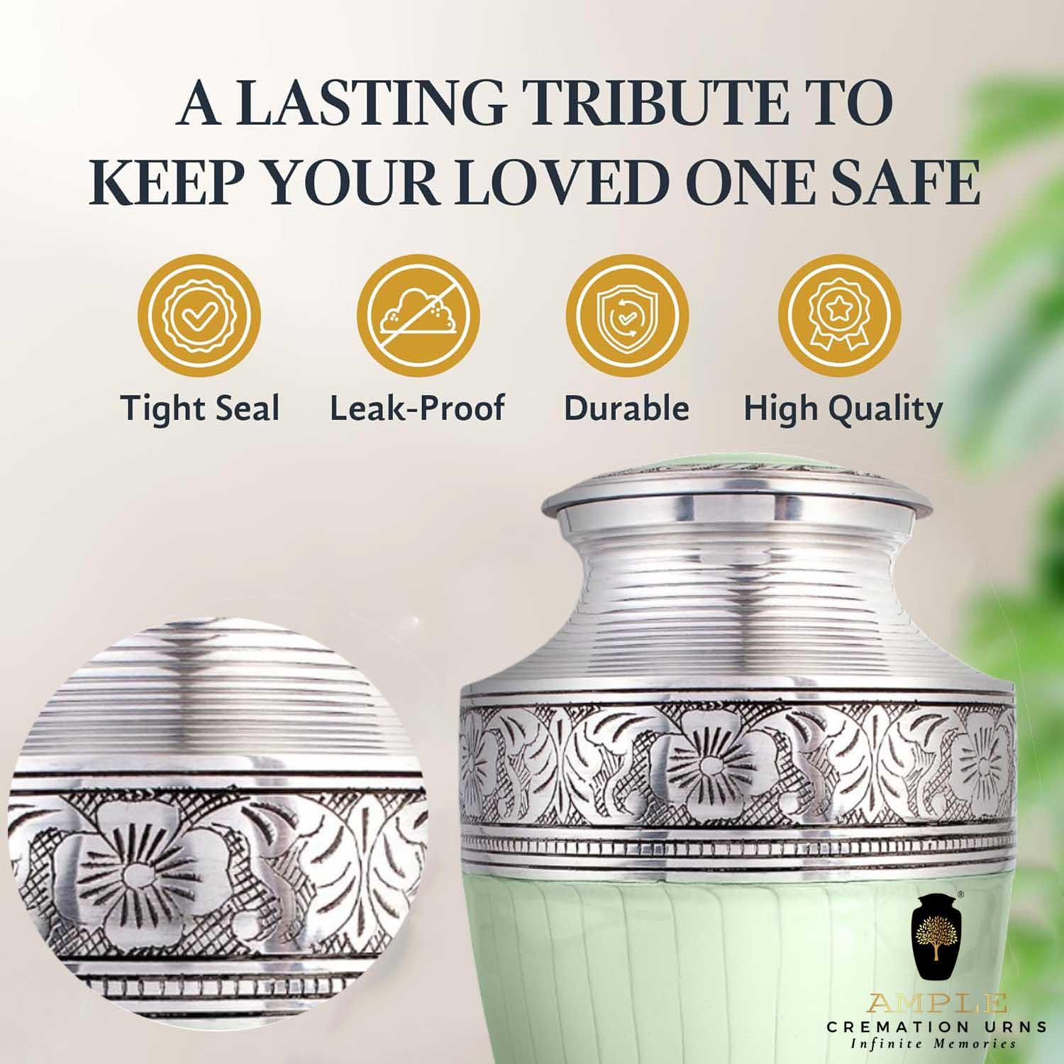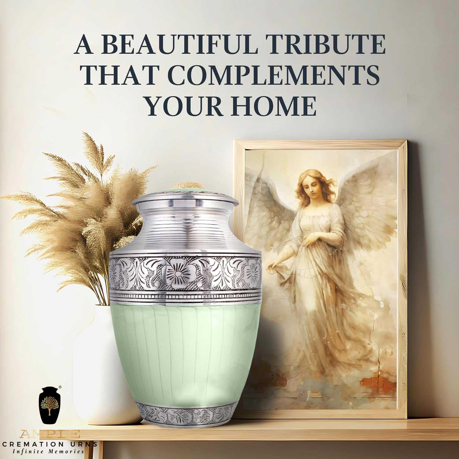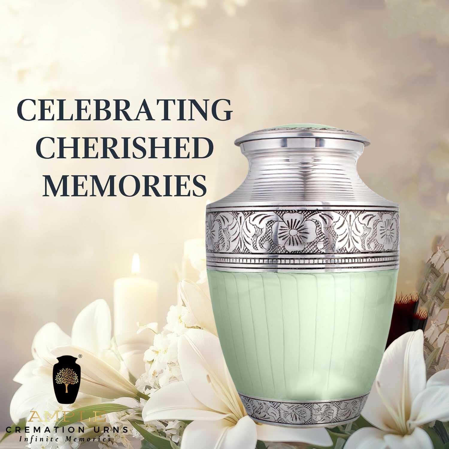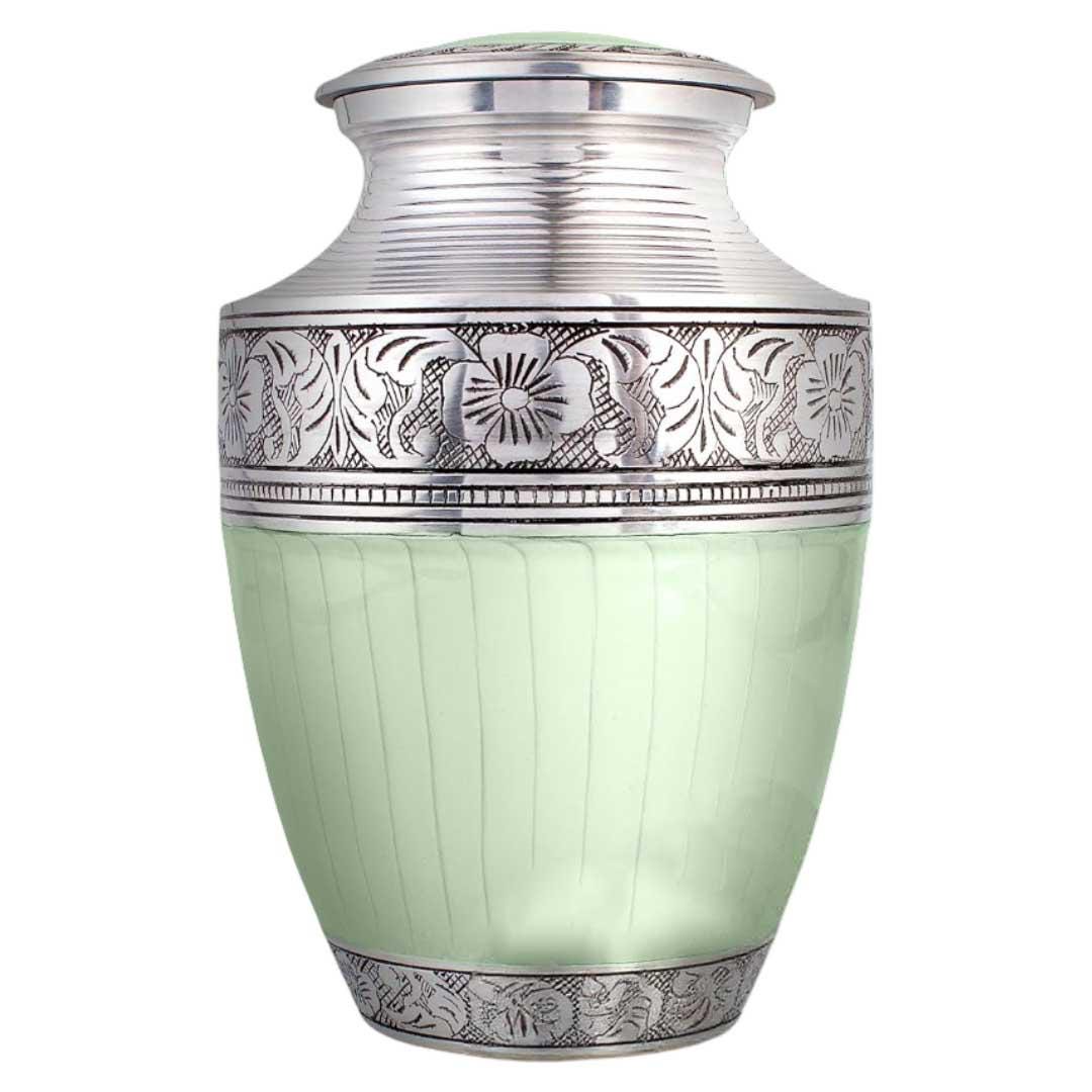 Celebrate your loved one's memory with this stunning mint green and silver cremation urn. Handcrafted with care, this urn features an elegant mint green finish paired with intricate silver floral engravings on the lid, upper, and lower bands, offering a peaceful and graceful aesthetic.