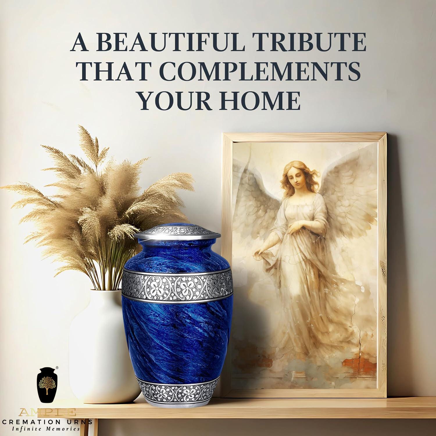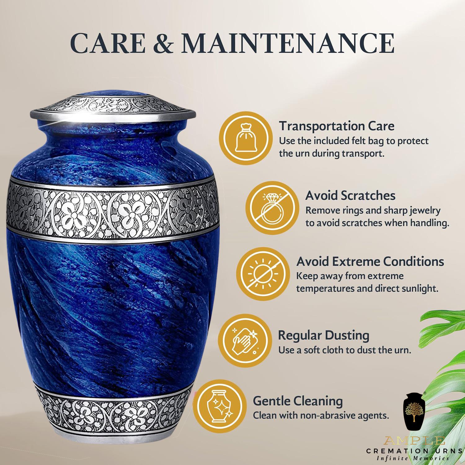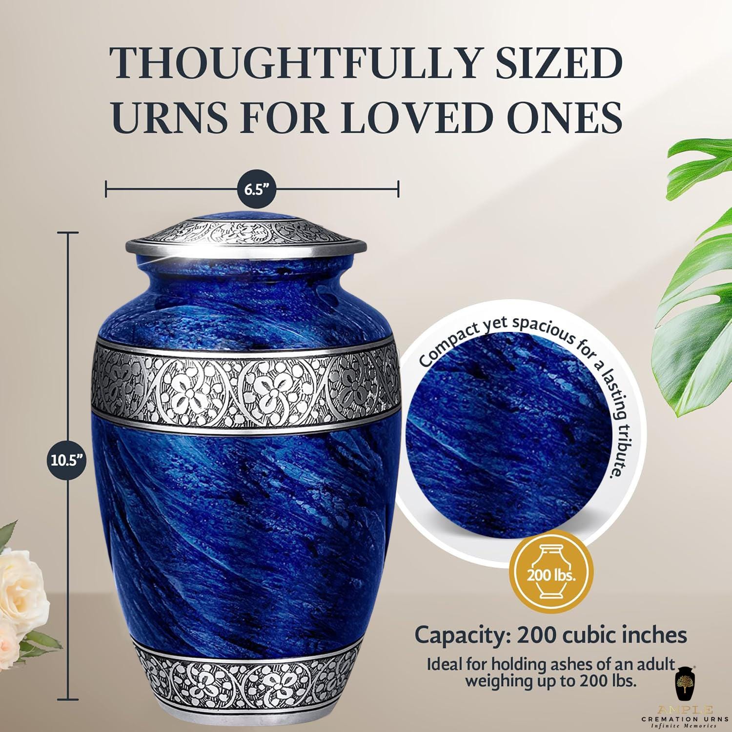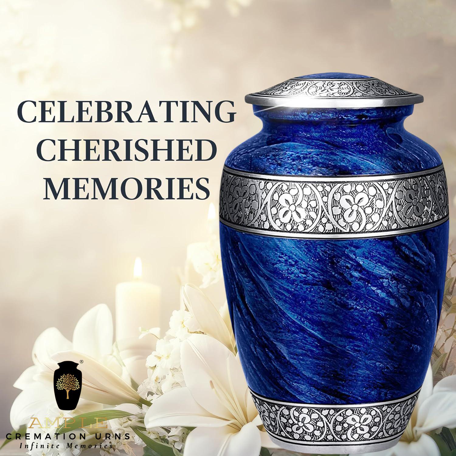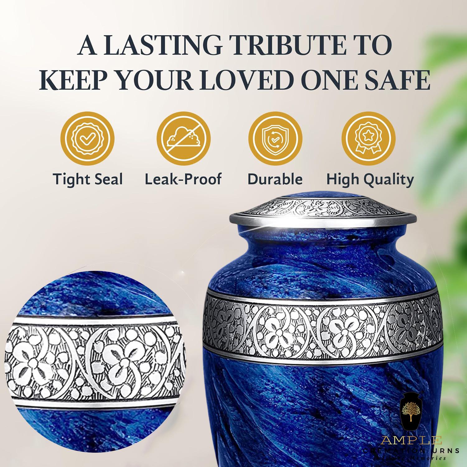 Our Ample Cremation Urns provide a dignified way to honor your loved one's memory. These premium aluminum urns are thoughtfully sized at 10.5" × 6.5" with a 200 cubic inch capacity, designed to hold ashes of adults up to 200 lbs while complementing your home decor with their elegant design.