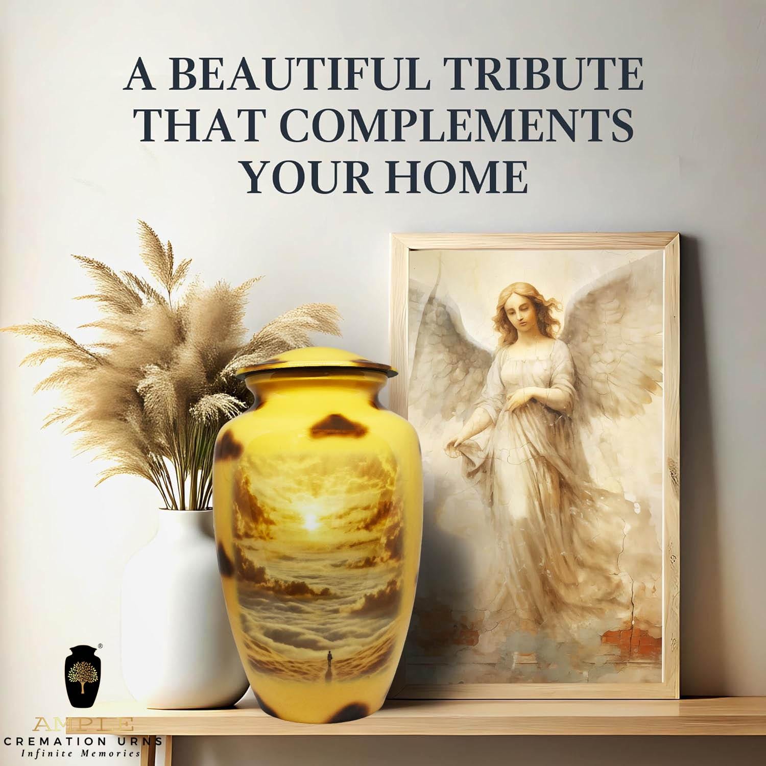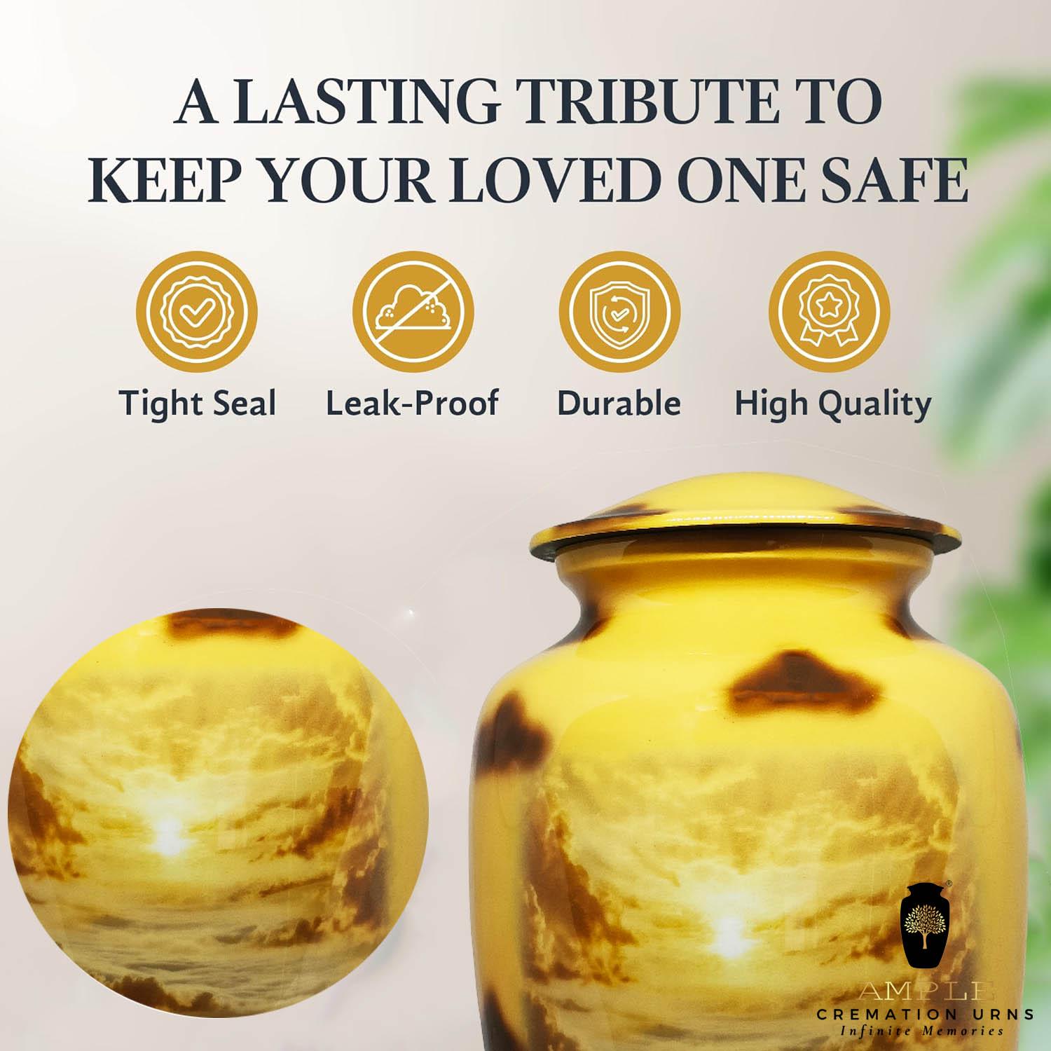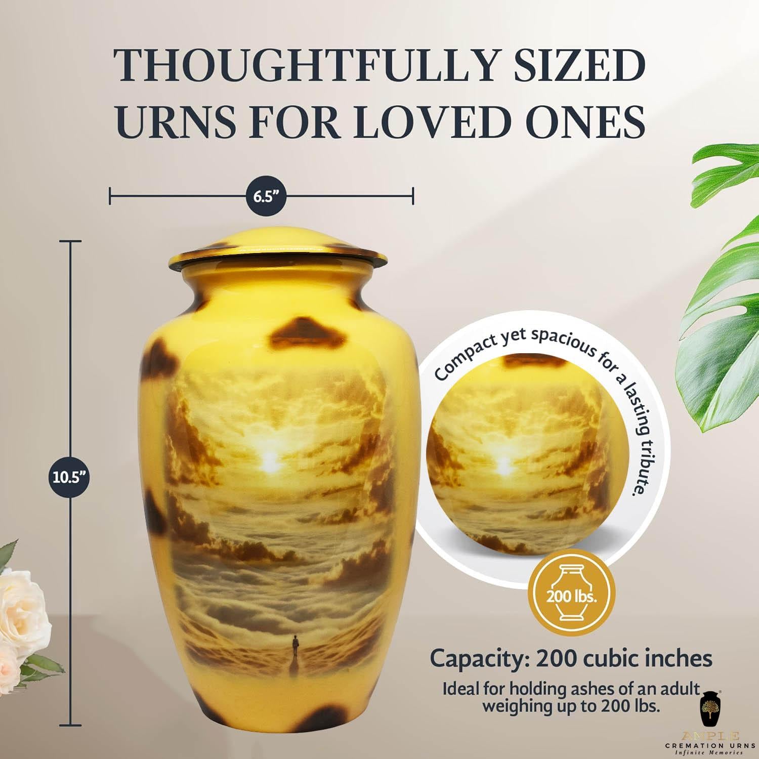 Our Ample Cremation Urns provide a dignified way to honor your loved one's memory. These premium aluminum urns are thoughtfully sized at 10.5" × 6.5" with a 200 cubic inch capacity, designed to securely hold ashes of adults up to 200 lbs while complementing your home decor.