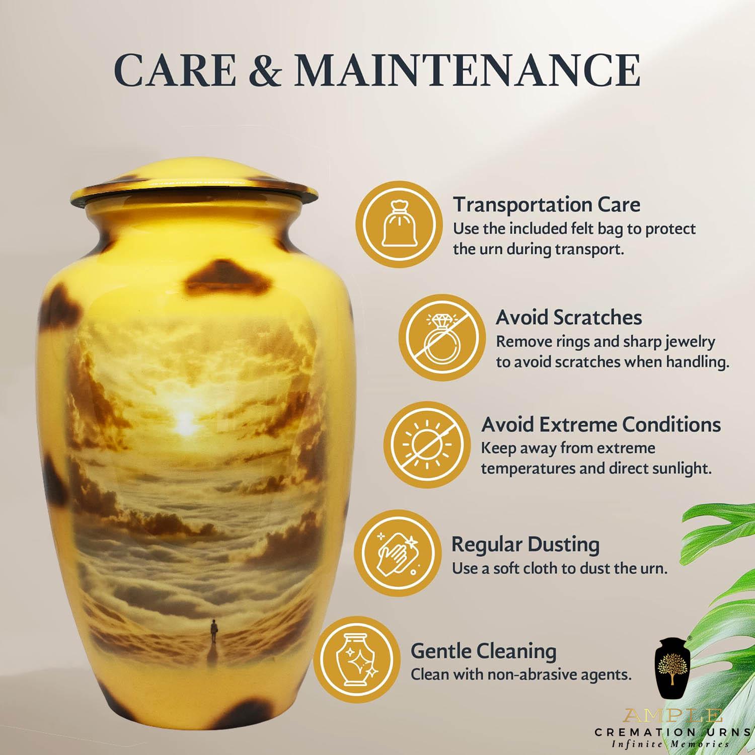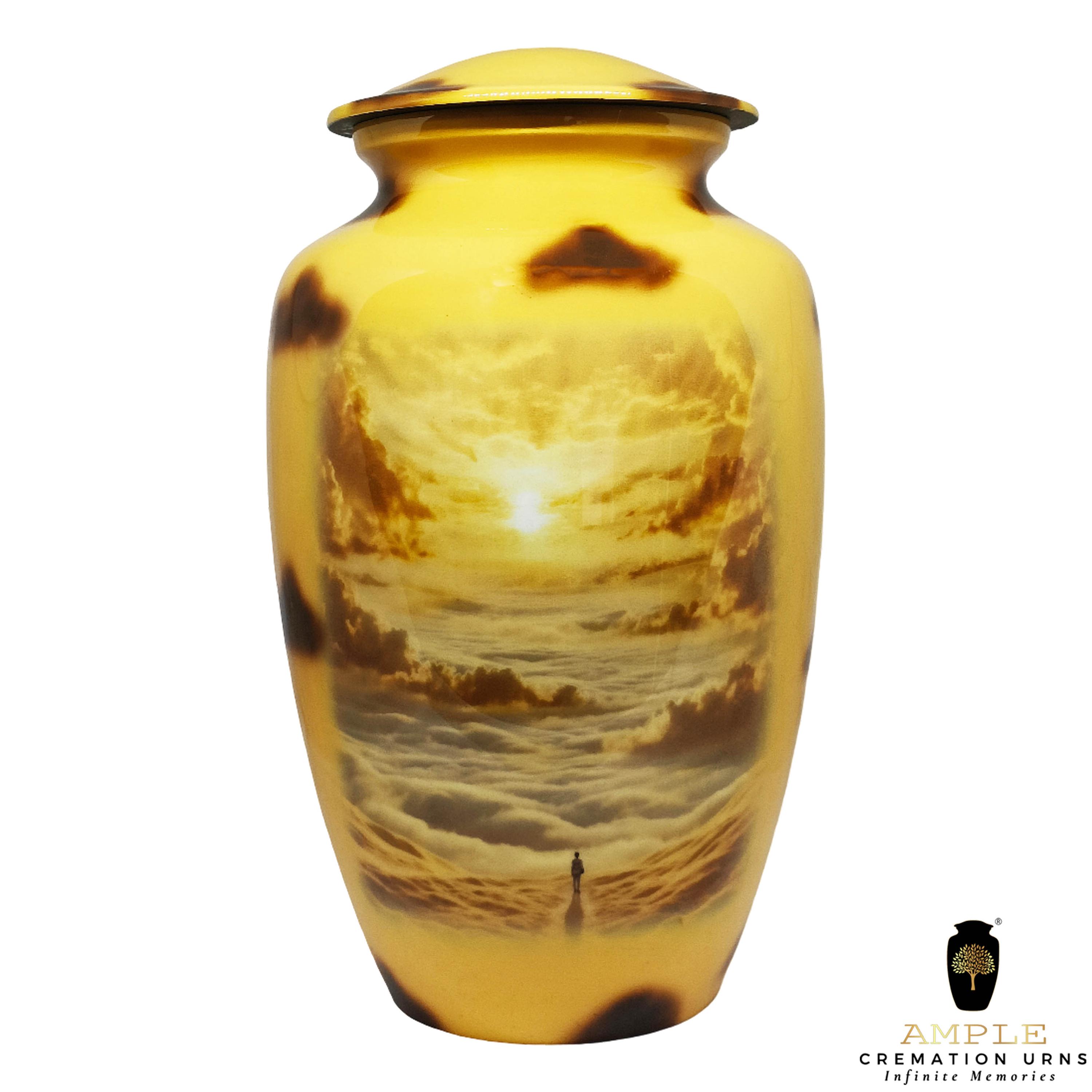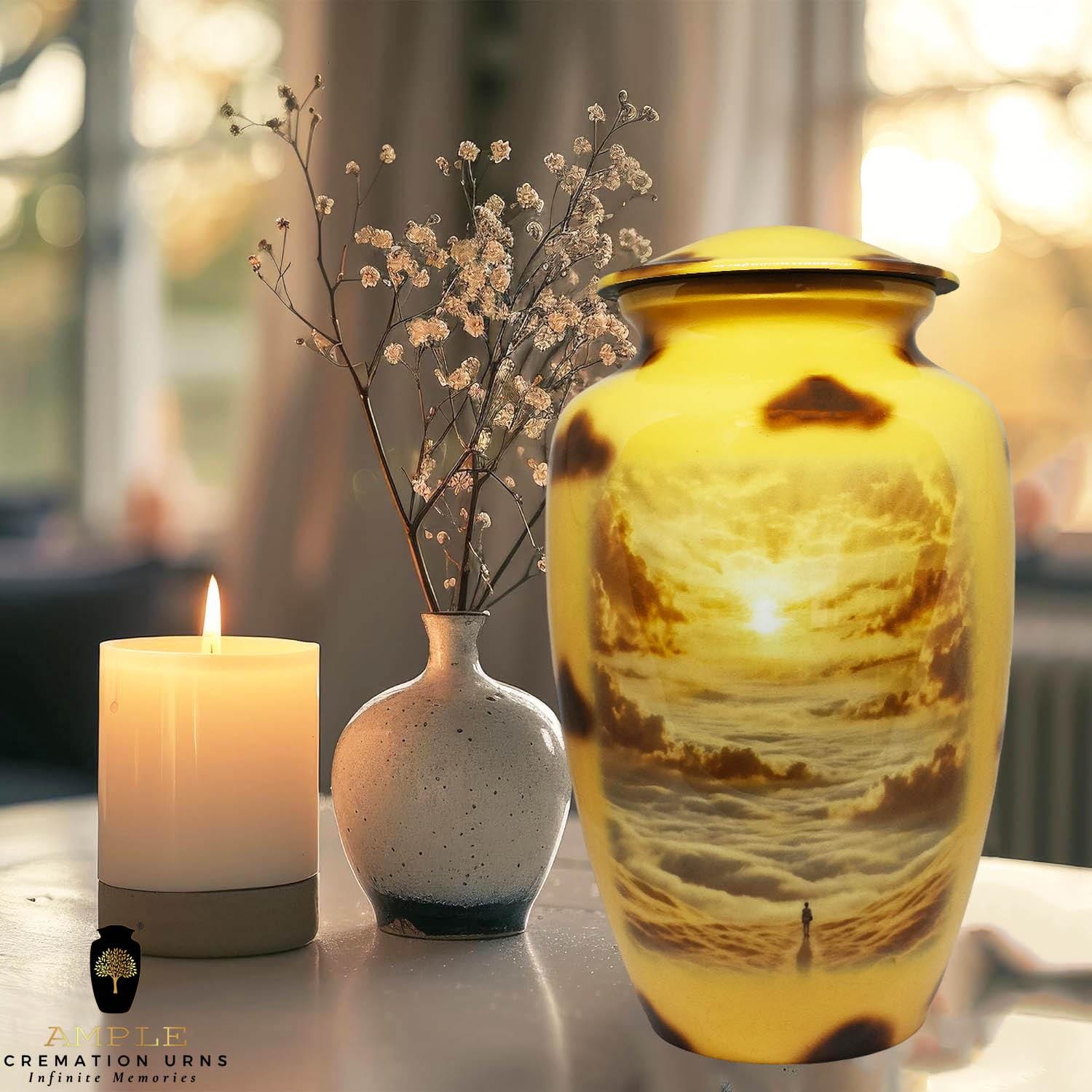 Our Ample Cremation Urns provide a dignified way to honor your loved one's memory. These premium aluminum urns are thoughtfully sized at 10.5" × 6.5" with a 200 cubic inch capacity, designed to securely hold ashes of adults up to 200 lbs while complementing your home decor.
