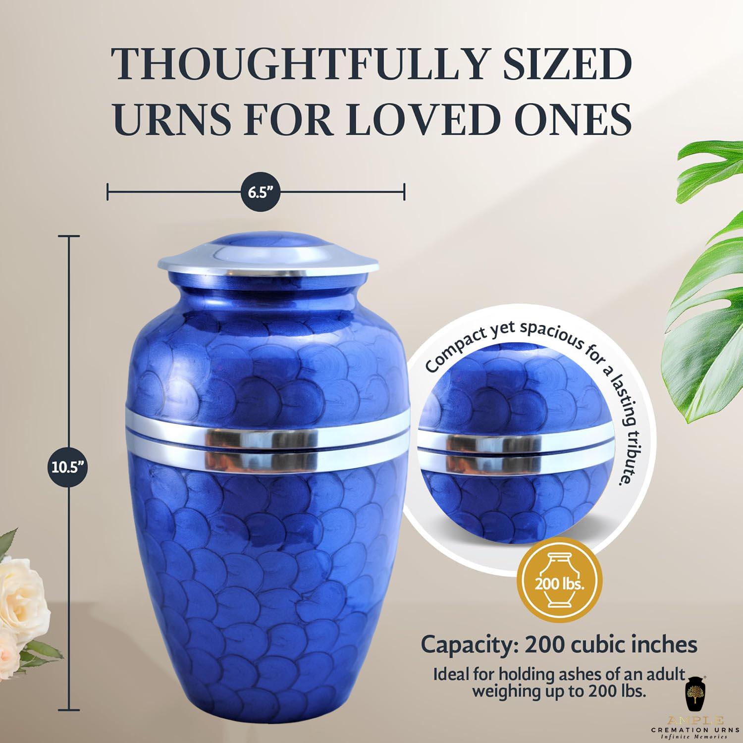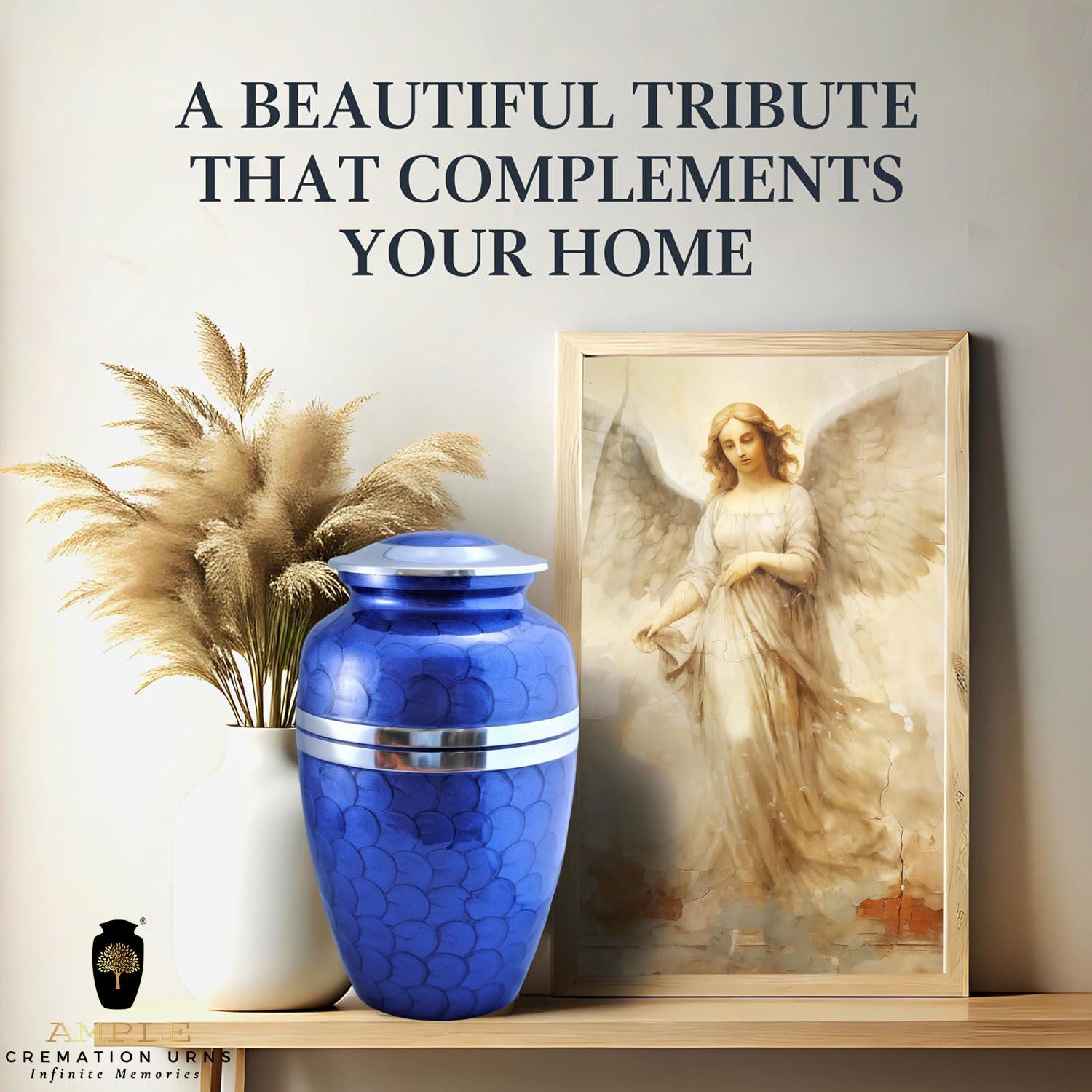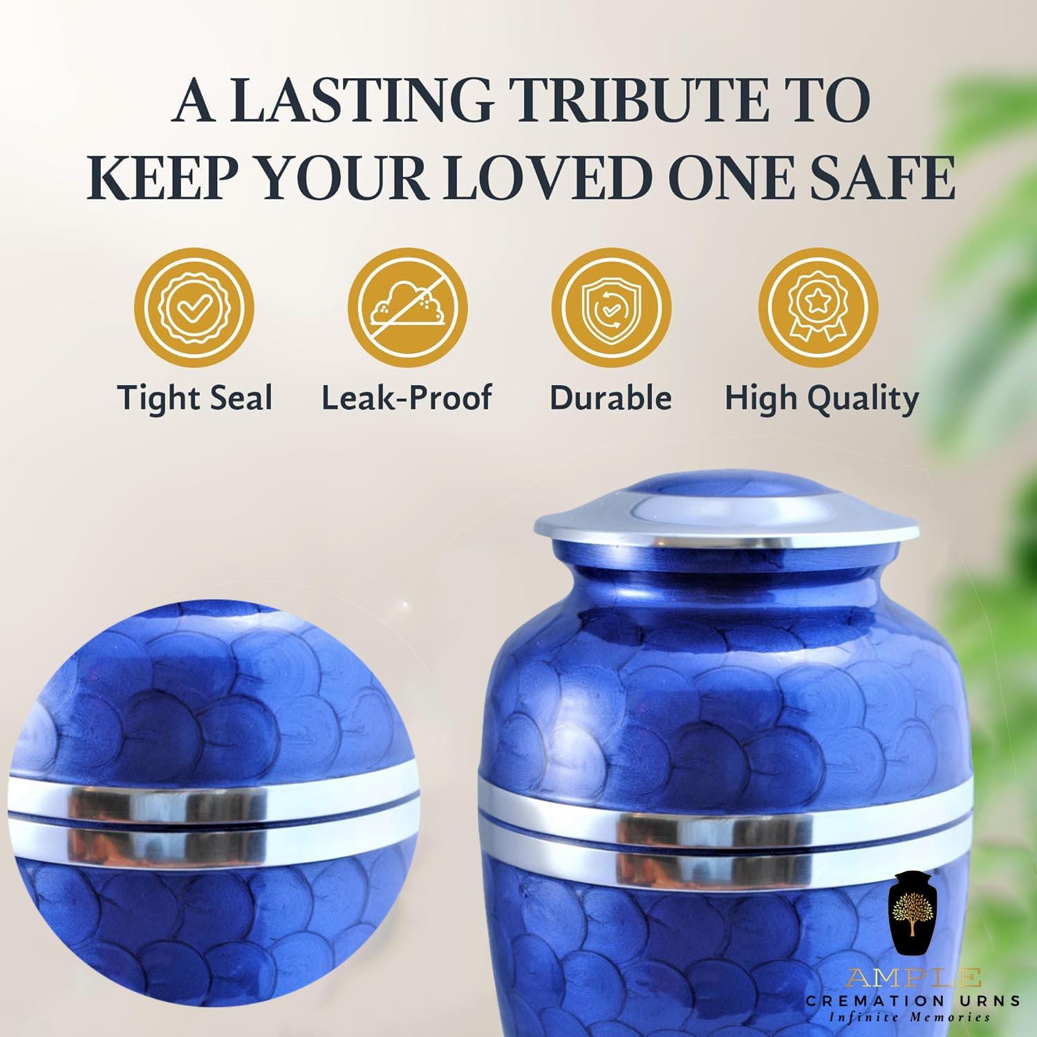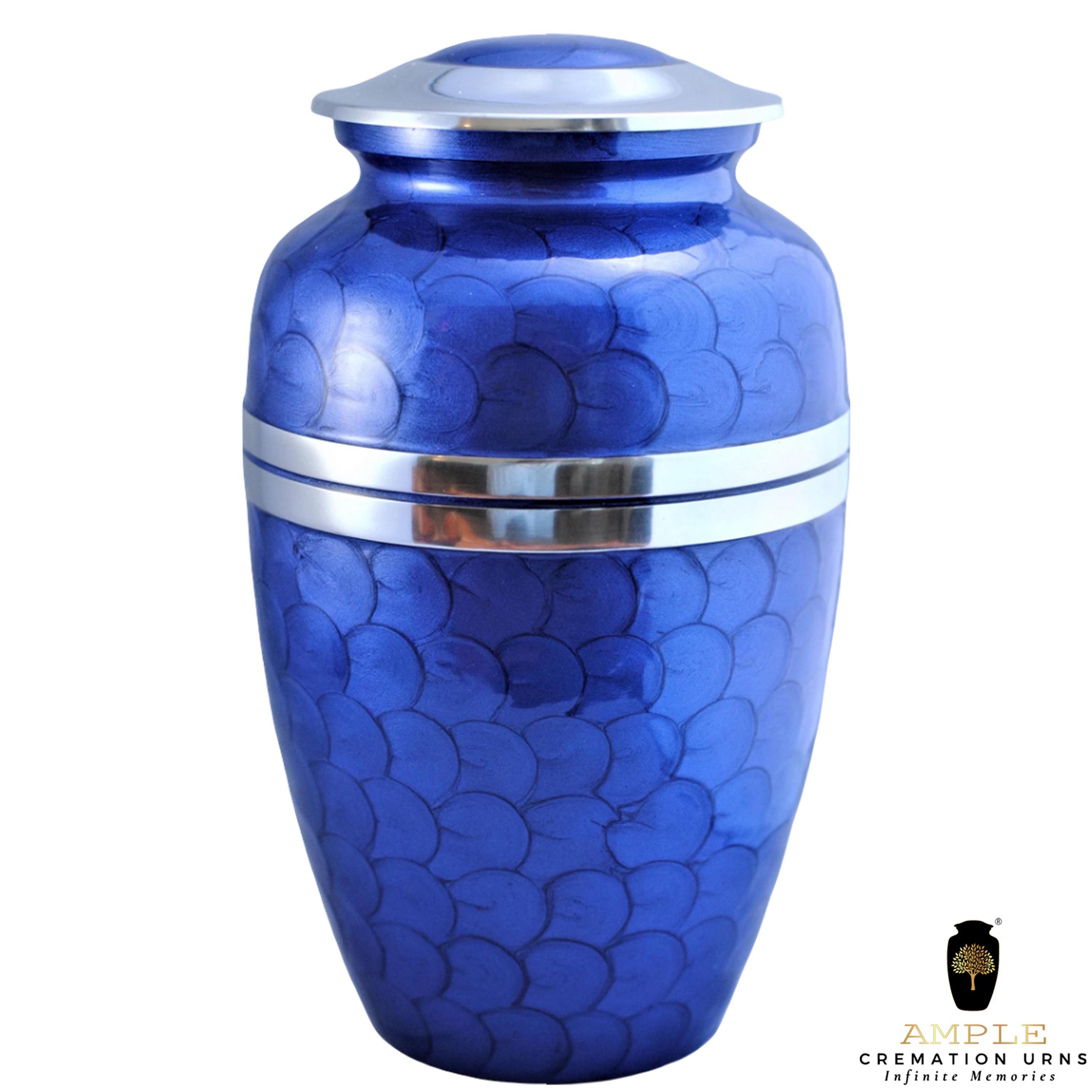 The Ample Cremation Urn provides a beautiful and secure resting place crafted from solid aluminum with a protective Meena coating. This elegant urn features a timeless design with a lustrous metallic finish that maintains its dignified appearance while complementing any home environment.
