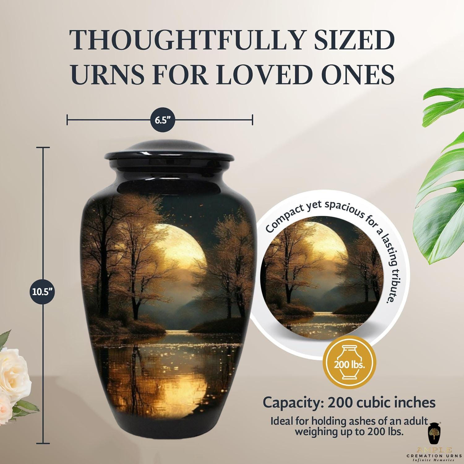 Large Urn: 10.5 x 6.5 inches | Capacity: 220 cubic inches (ideal for adults up to 200 lbs)
