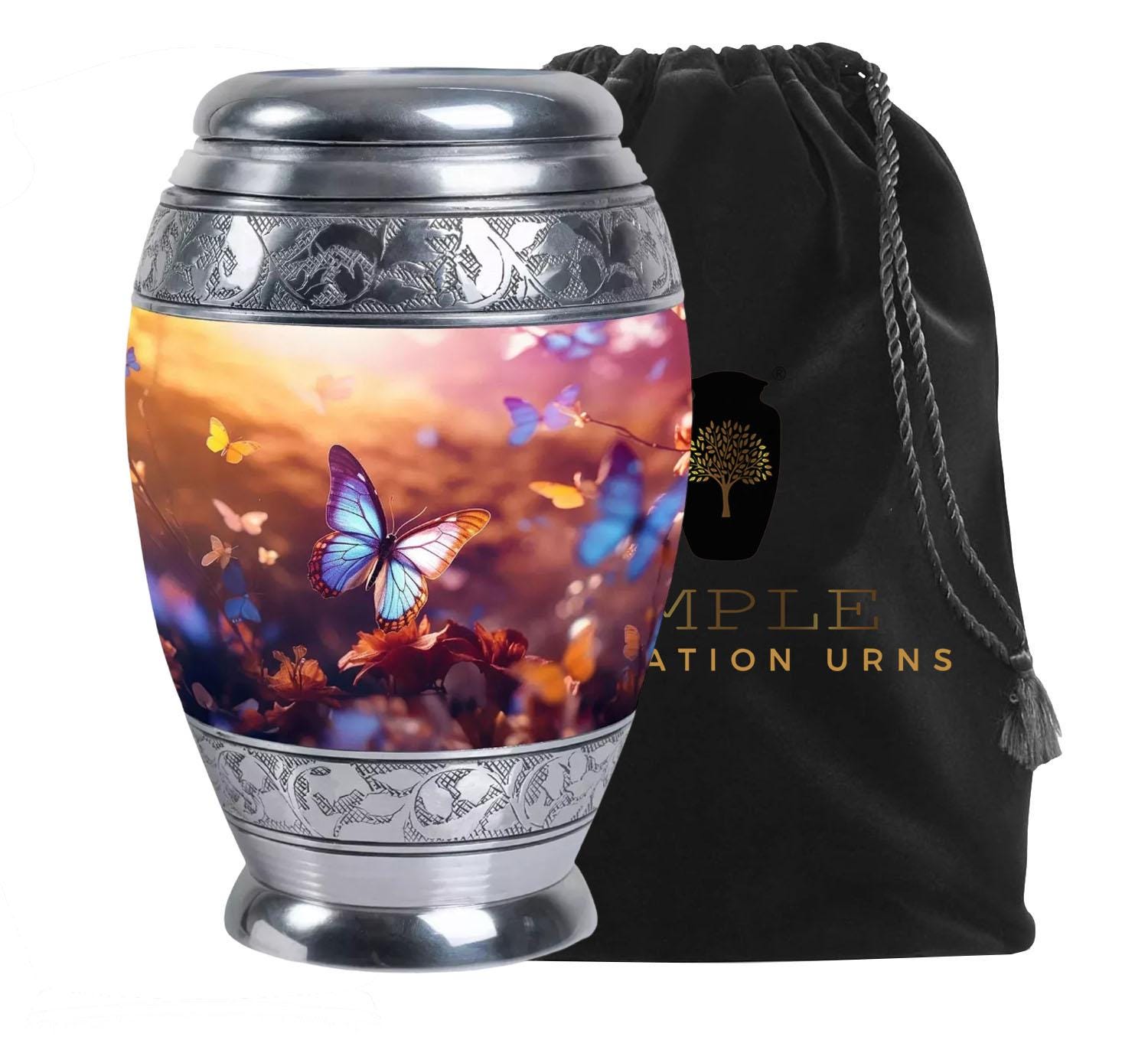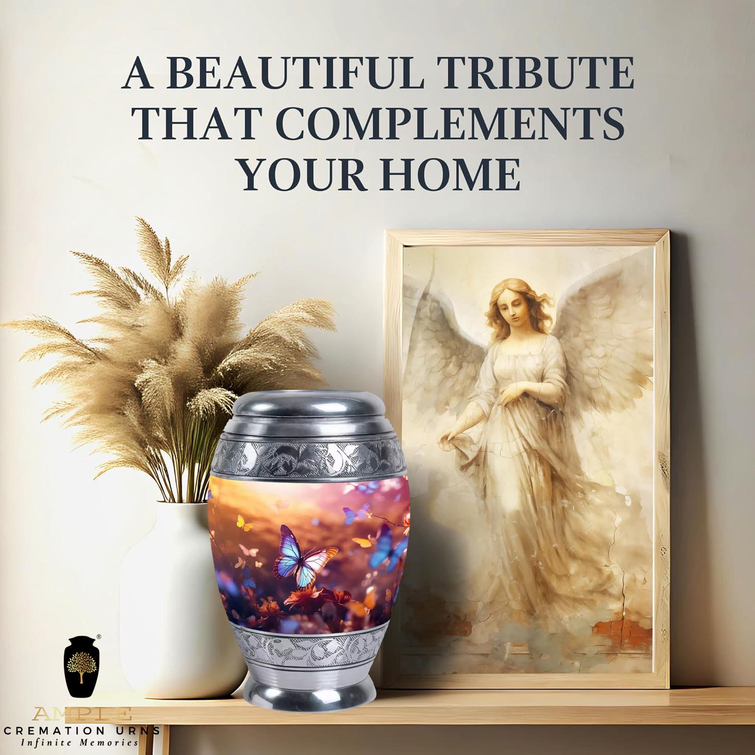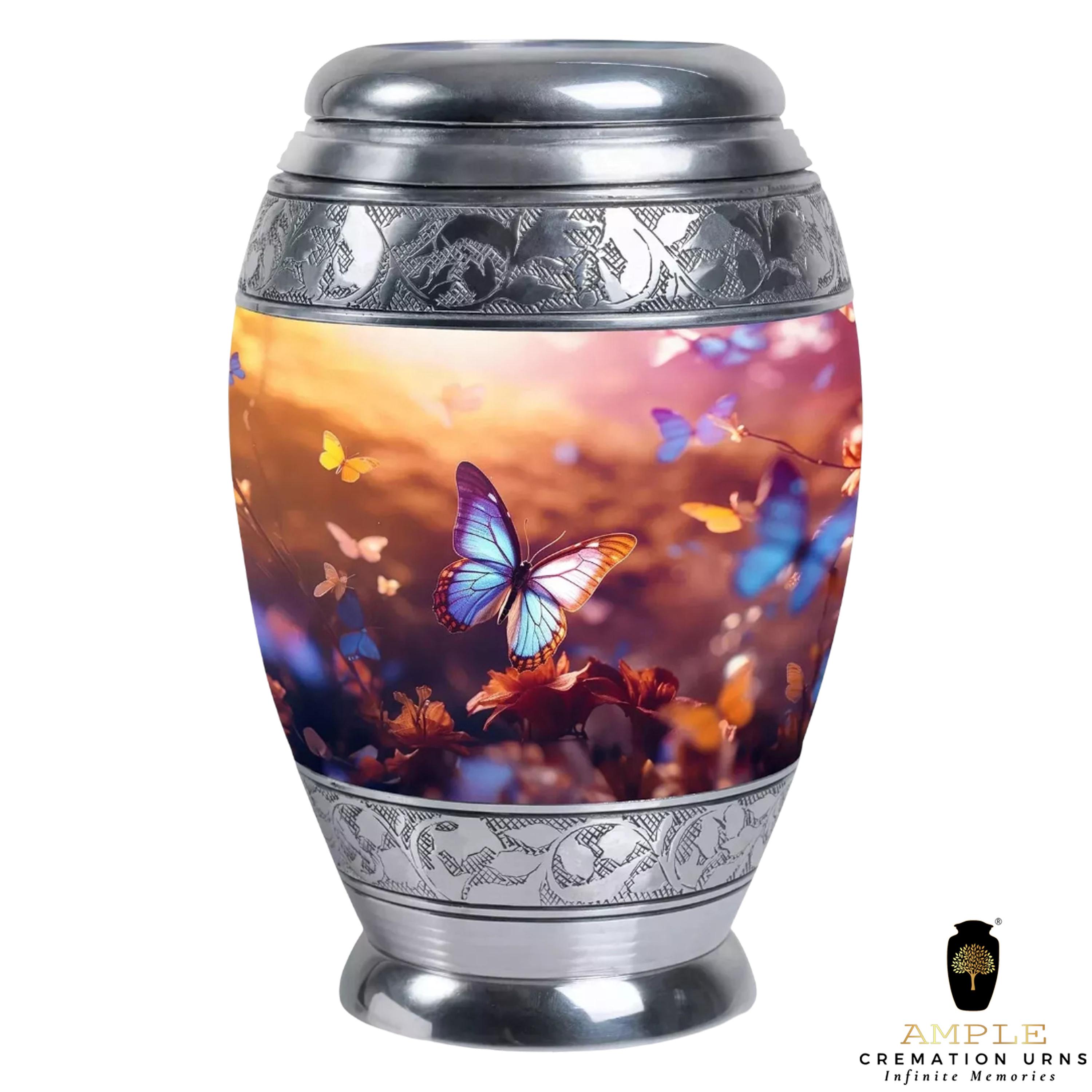 Honor your loved one with the beauty and symbolism of transformation through our Eternal Butterfly Garden Cremation Urn. Featuring vibrant butterflies उड़ते gracefully in a warm sunset garden, this design represents hope, renewal, and the eternal journey of the soul.
