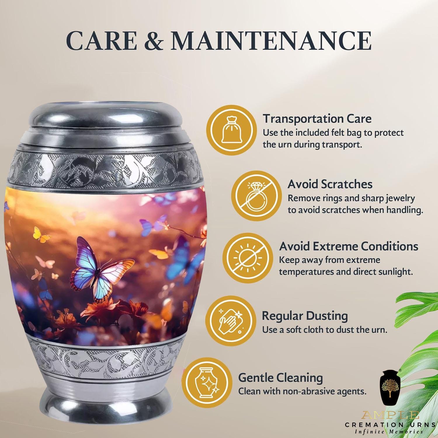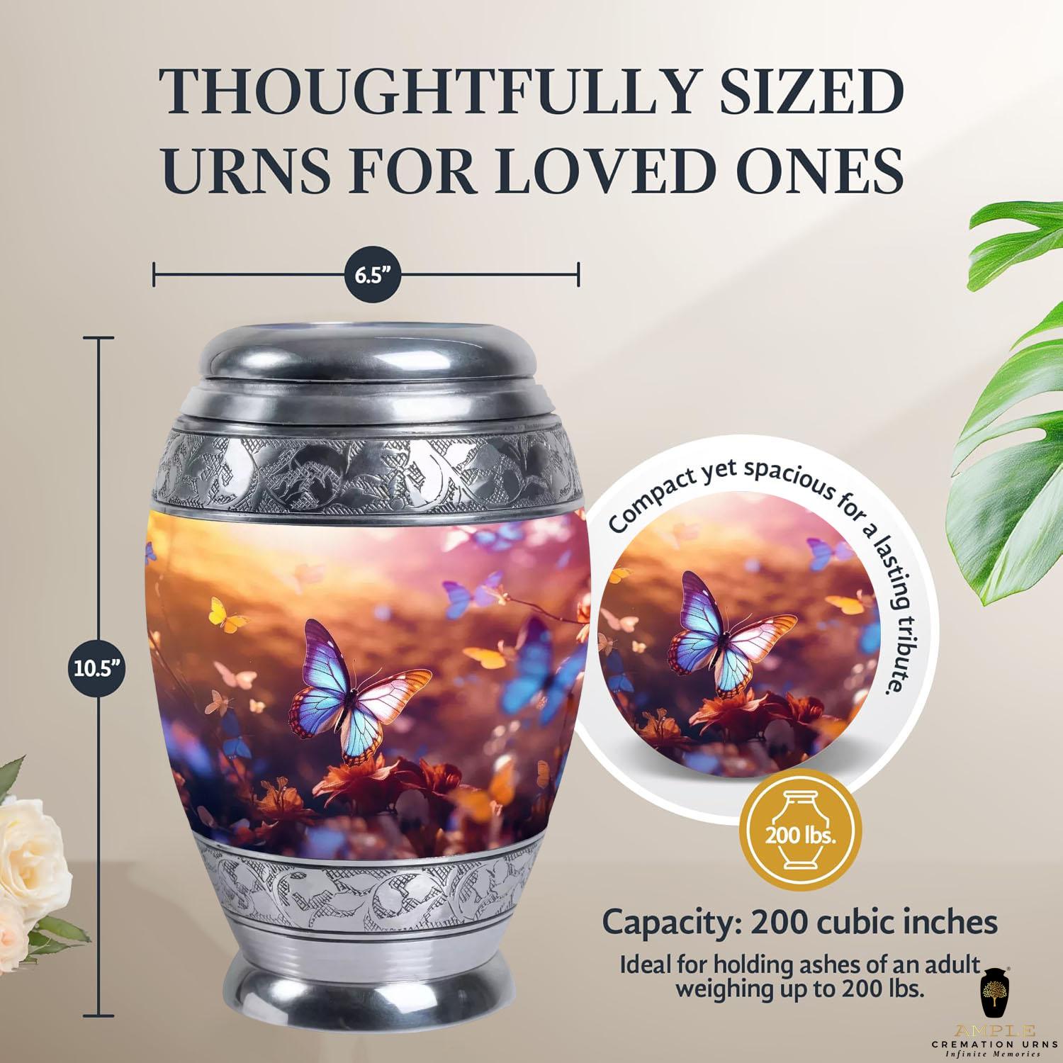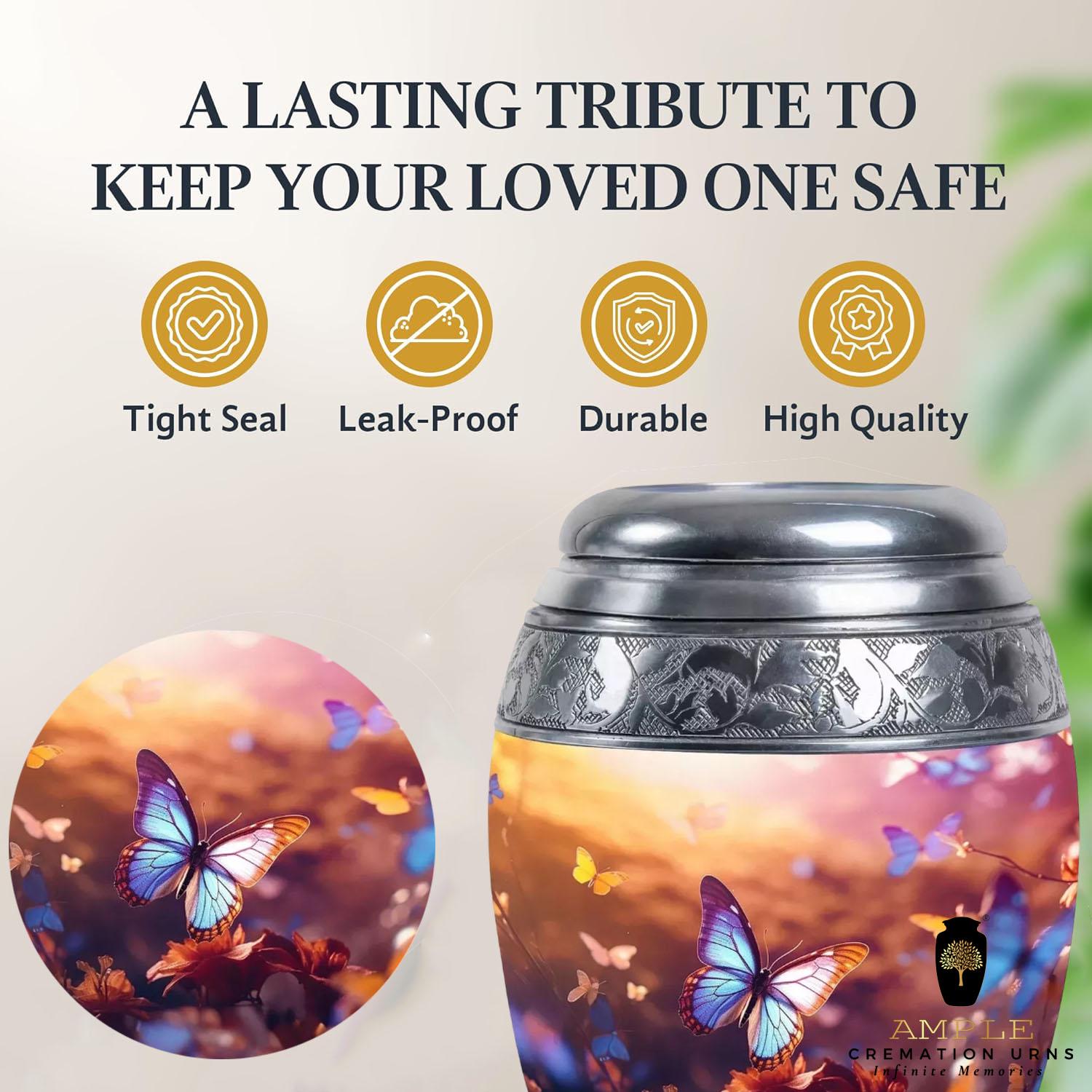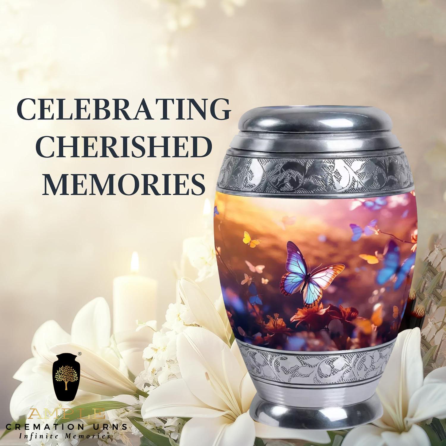 Honor your loved one with the beauty and symbolism of transformation through our Eternal Butterfly Garden Cremation Urn. Featuring vibrant butterflies उड़ते gracefully in a warm sunset garden, this design represents hope, renewal, and the eternal journey of the soul.