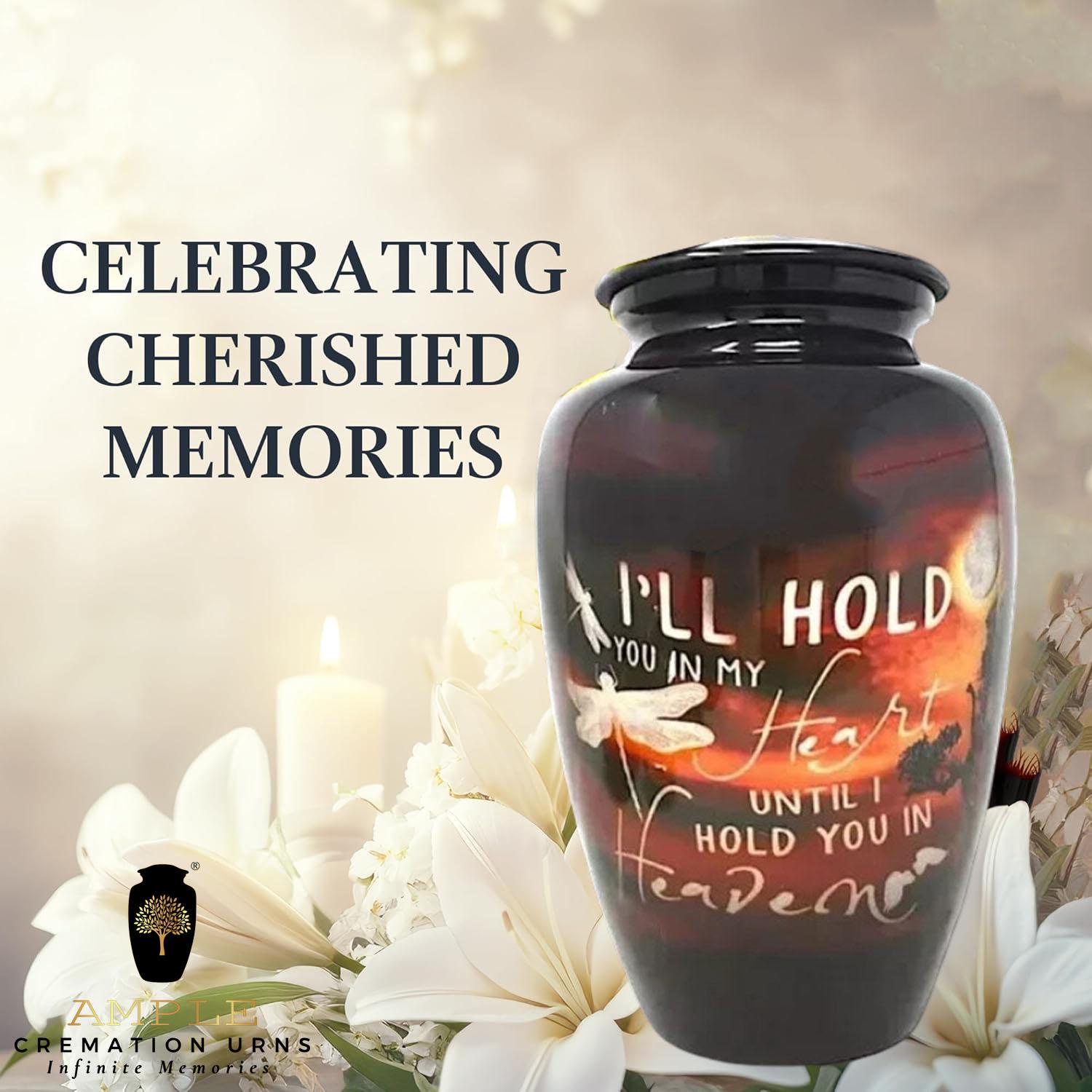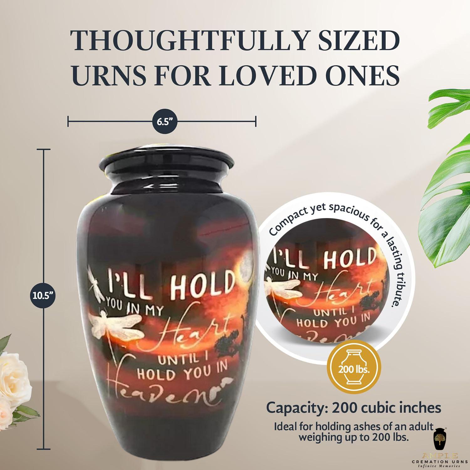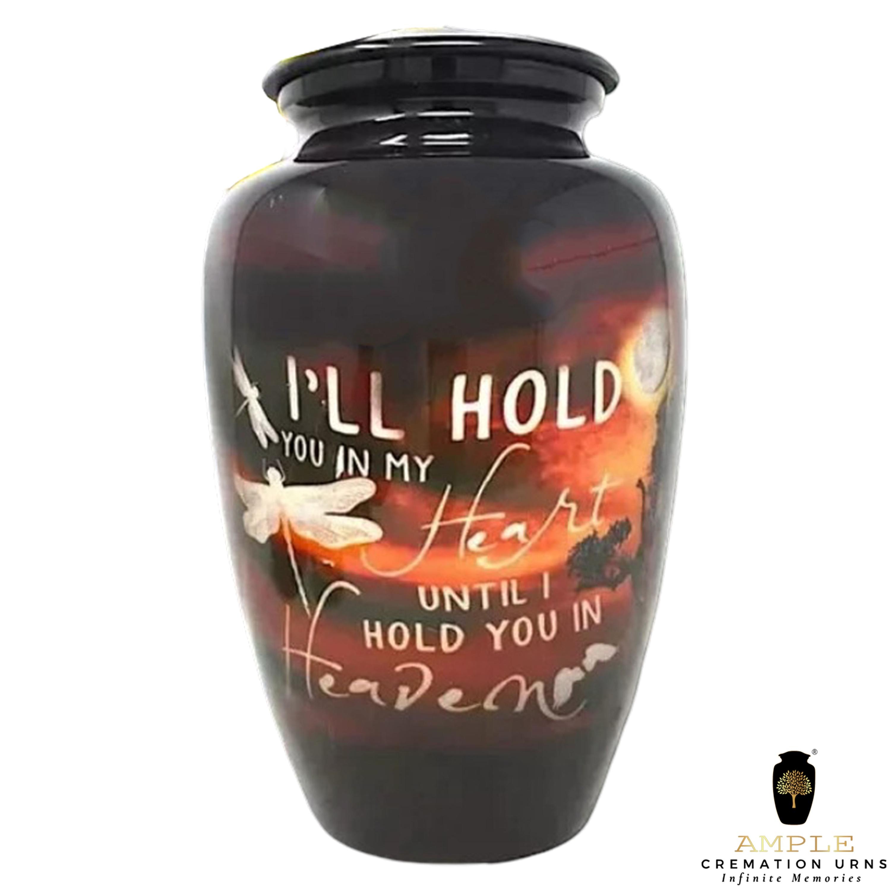 Ample Cremation Urns presents our heartfelt collection featuring the touching tribute: "I'll hold you in my heart until I hold you in heaven." Each urn can be personalized to honor your loved one's memory with this special message or your own custom inscription.