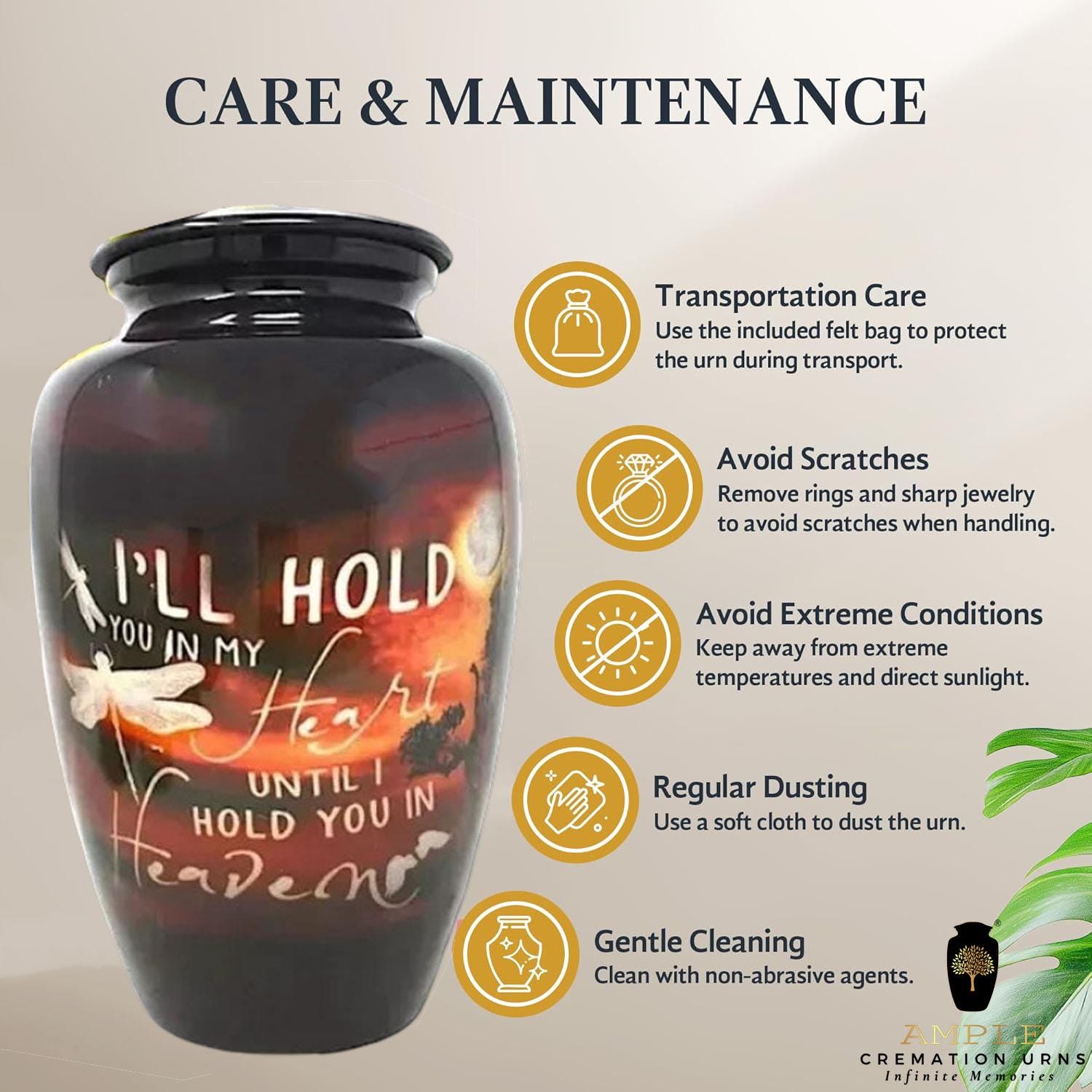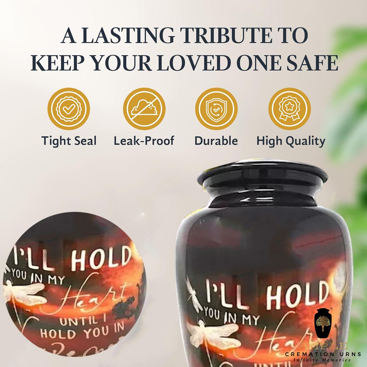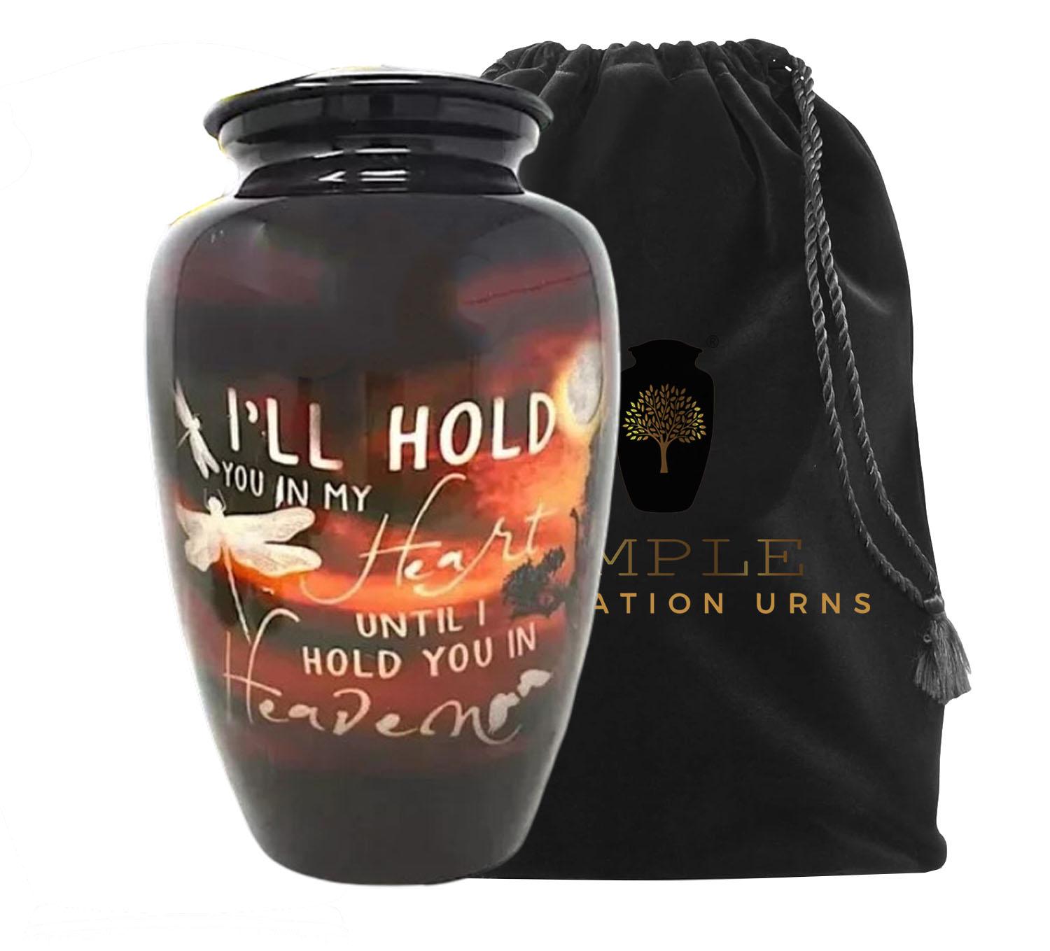 Ample Cremation Urns presents our heartfelt collection featuring the touching tribute: "I'll hold you in my heart until I hold you in heaven." Each urn can be personalized to honor your loved one's memory with this special message or your own custom inscription.