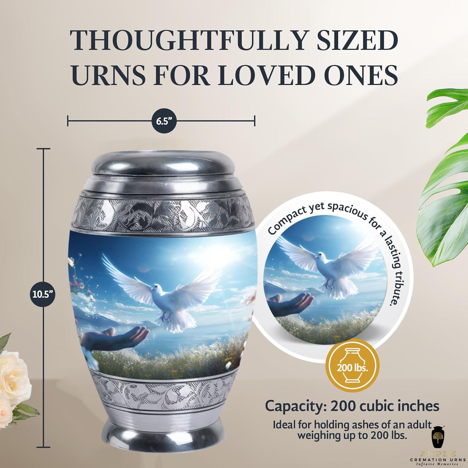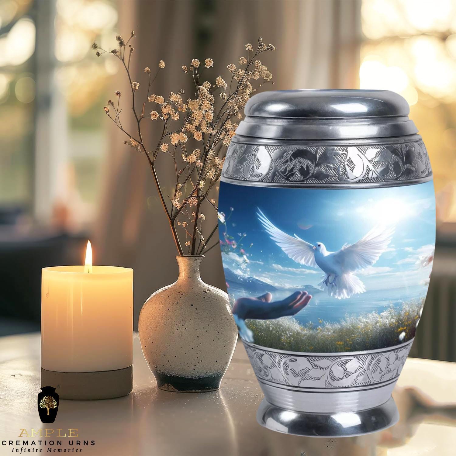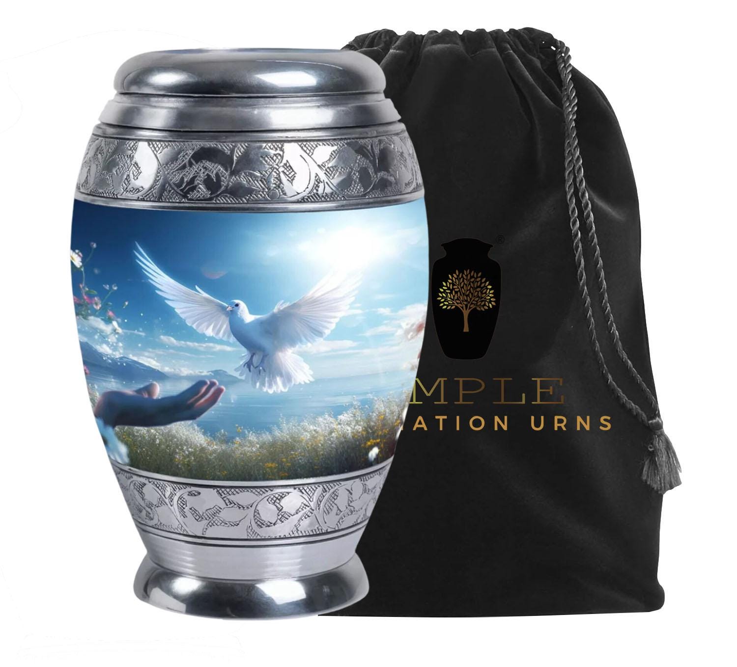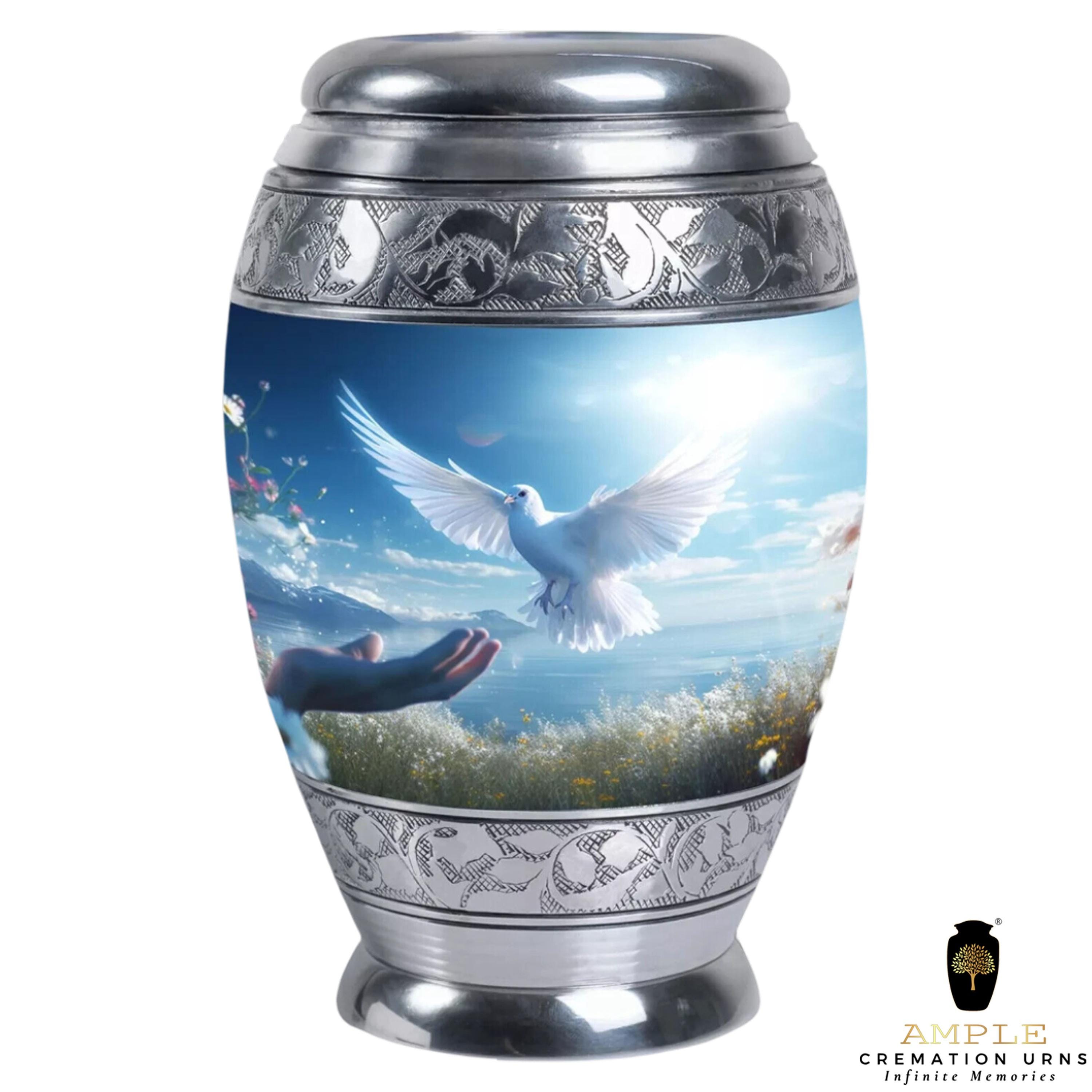 This barrel-style urn features a serene and uplifting scene of a white dove taking flight from an open hand, soaring toward a sunlit sky. The imagery represents the transition of the soul, offering a sense of hope, freedom, and eternal peace. The central artwork is beautifully accented by polished silver-toned bands featuring intricate floral engravings, providing a timeless and dignified frame for this touching tribute.