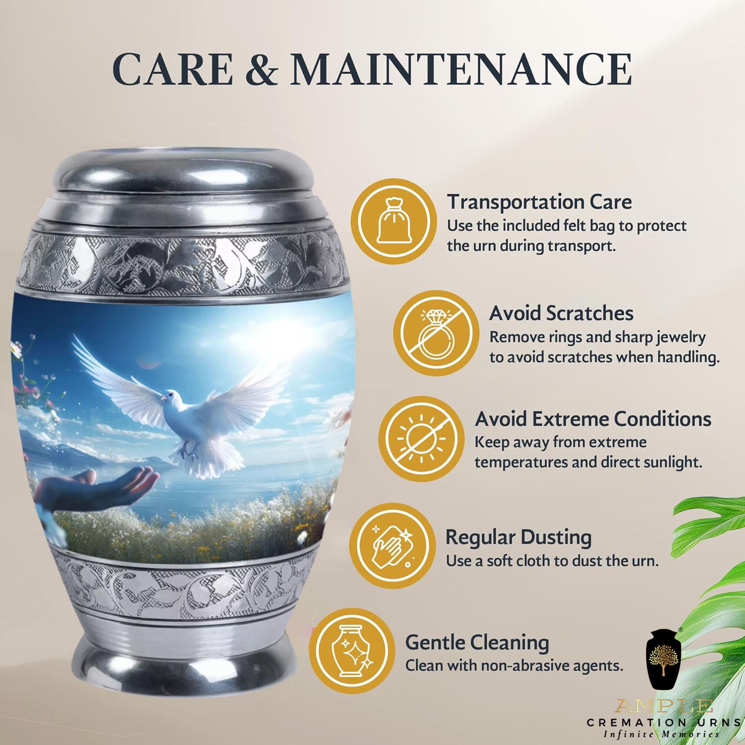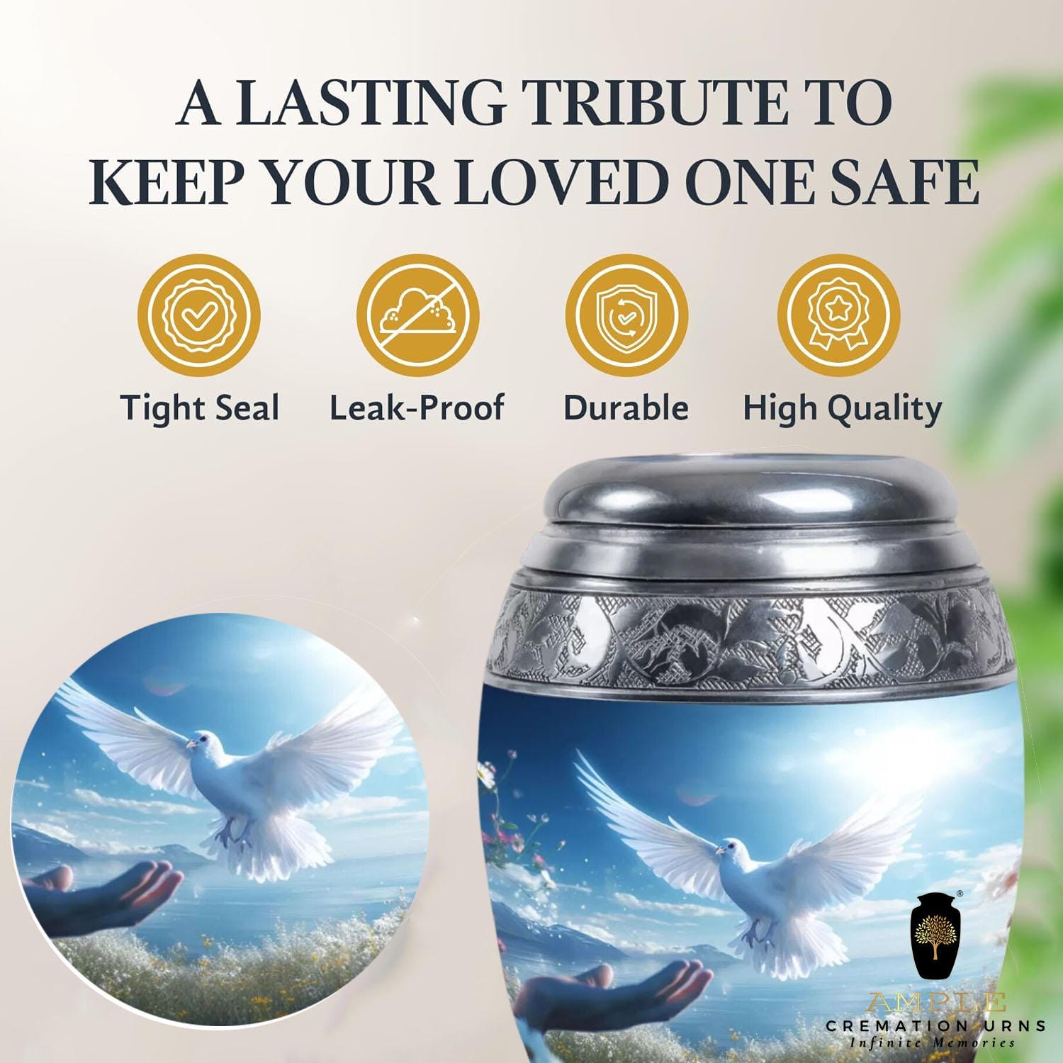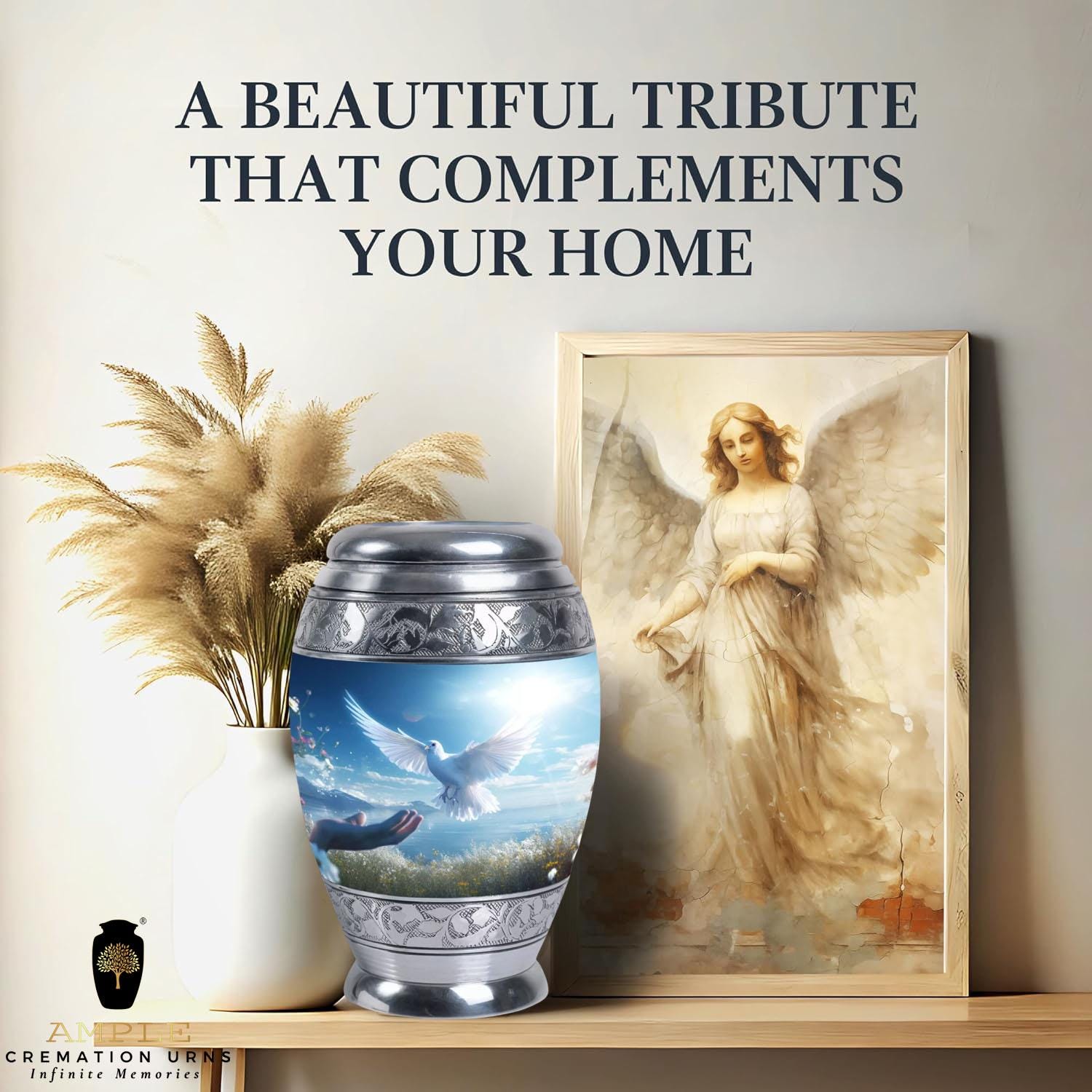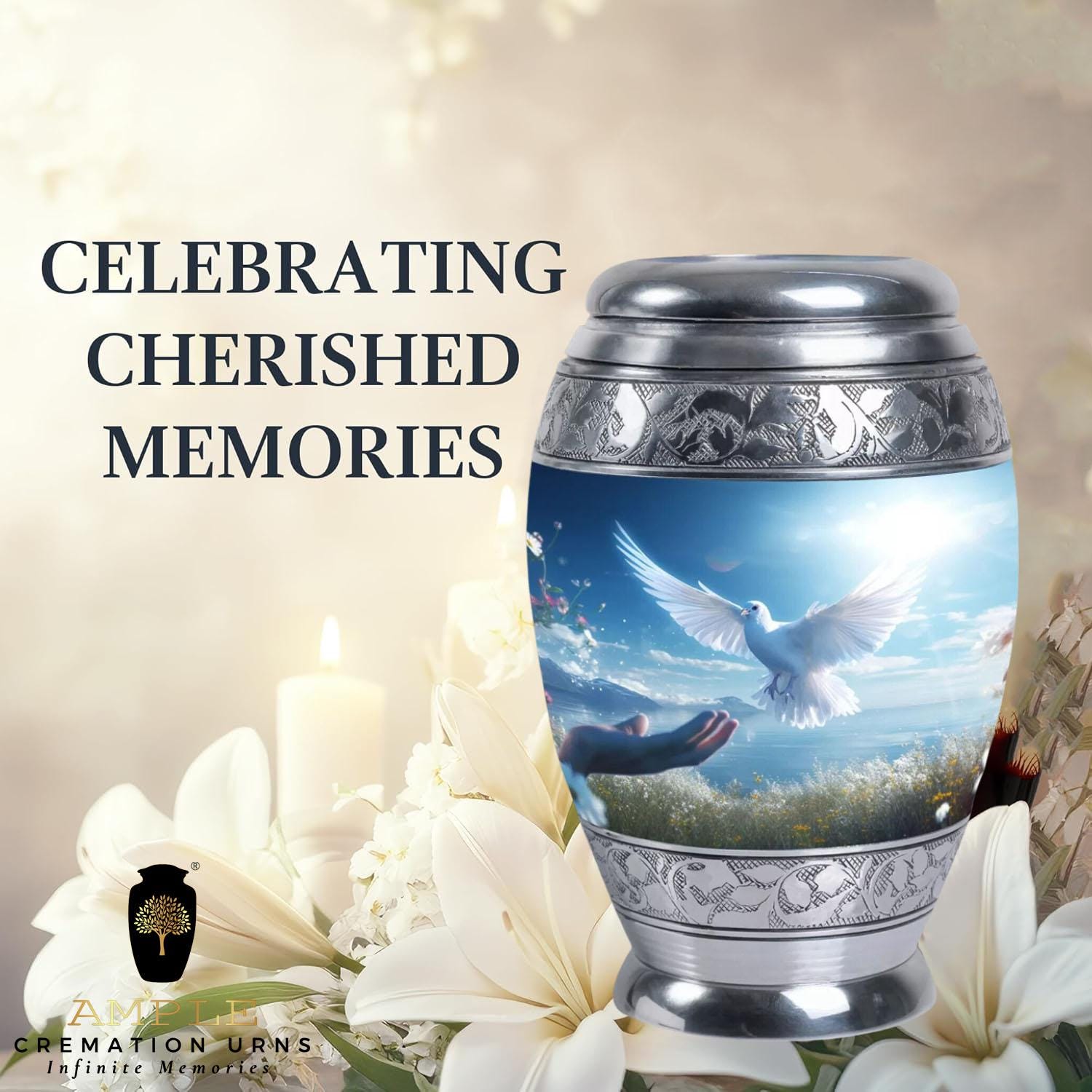 This barrel-style urn features a serene and uplifting scene of a white dove taking flight from an open hand, soaring toward a sunlit sky. The imagery represents the transition of the soul, offering a sense of hope, freedom, and eternal peace. The central artwork is beautifully accented by polished silver-toned bands featuring intricate floral engravings, providing a timeless and dignified frame for this touching tribute.