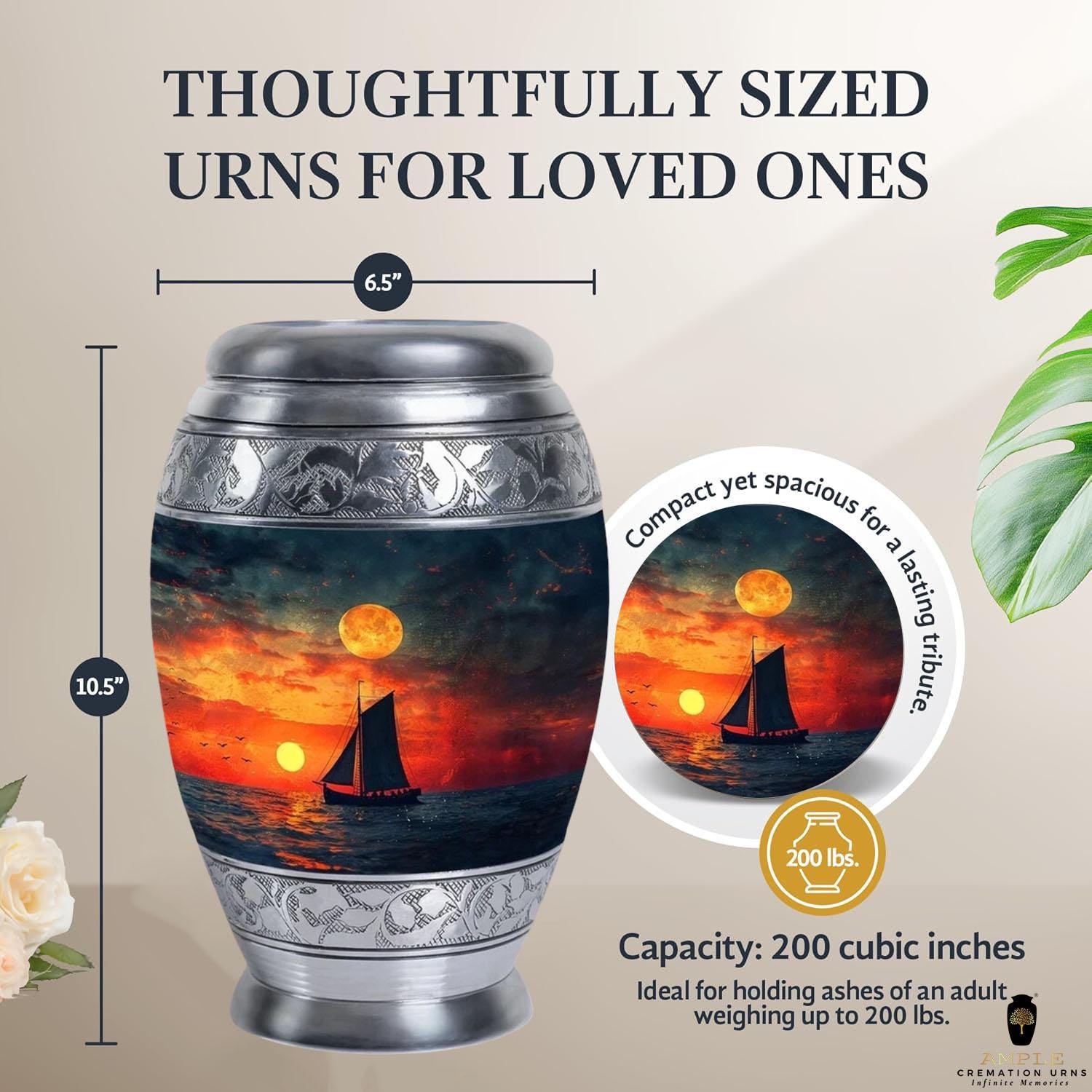 Large Memorial Urn: 10.5" x 6.5" | 220 cubic inch capacity (holds ashes for adults up to 200 lbs)