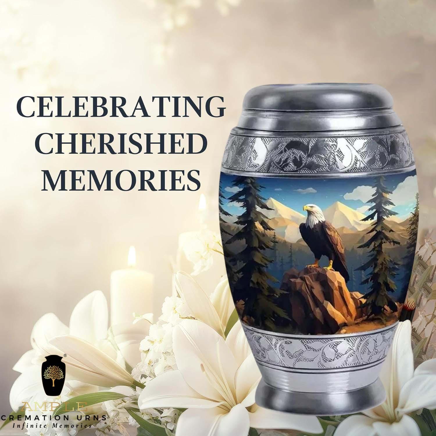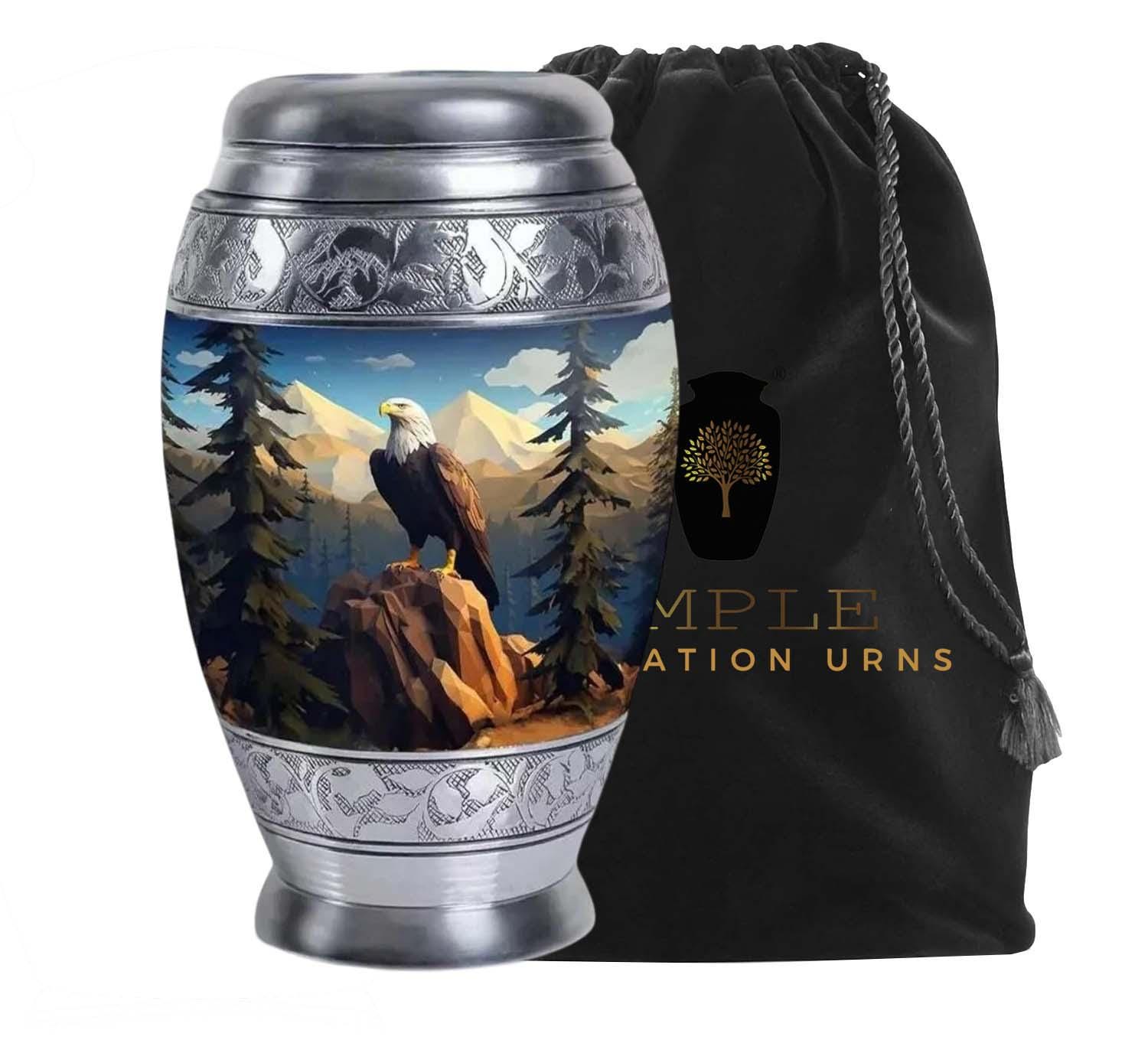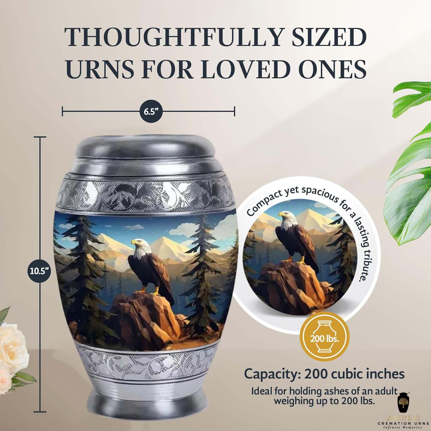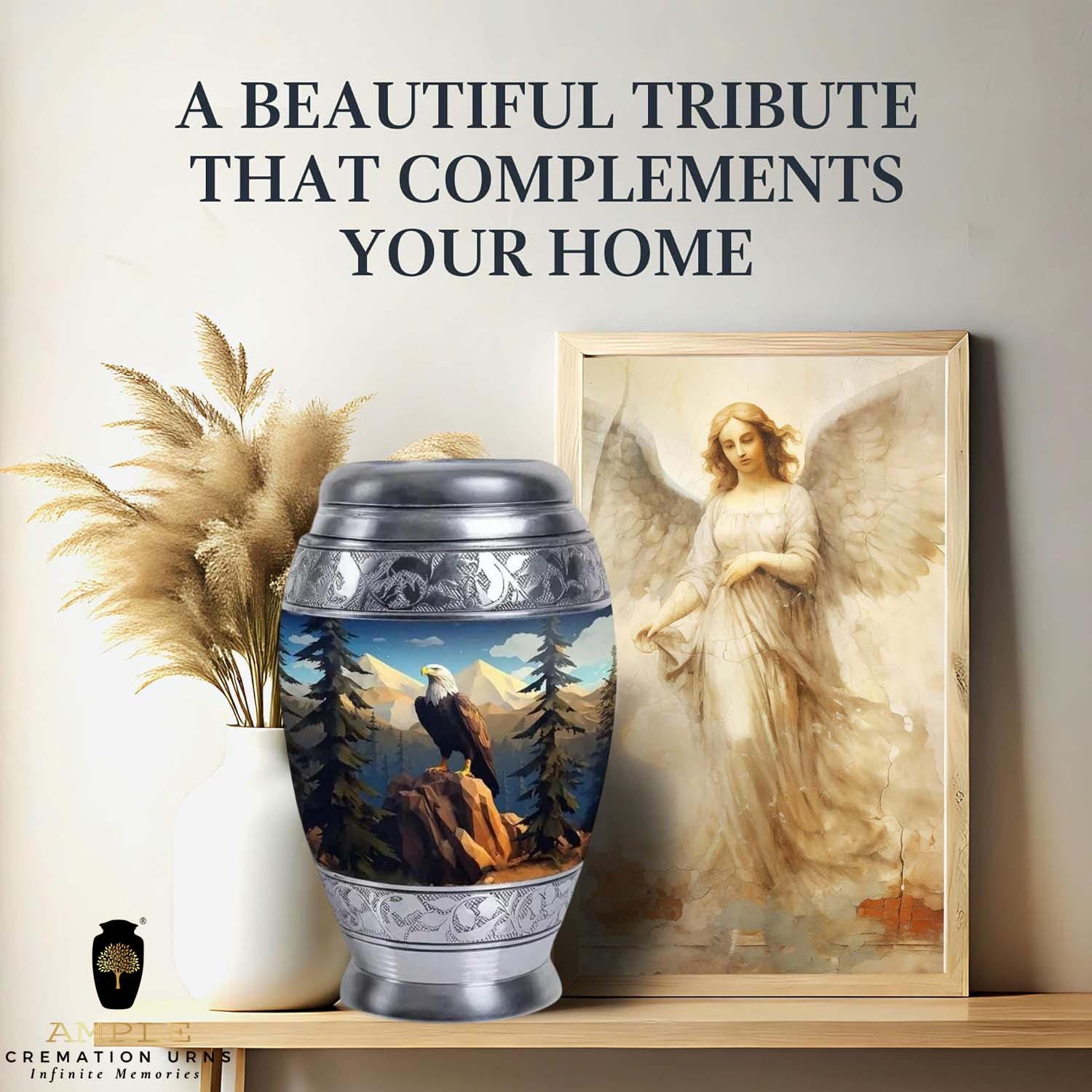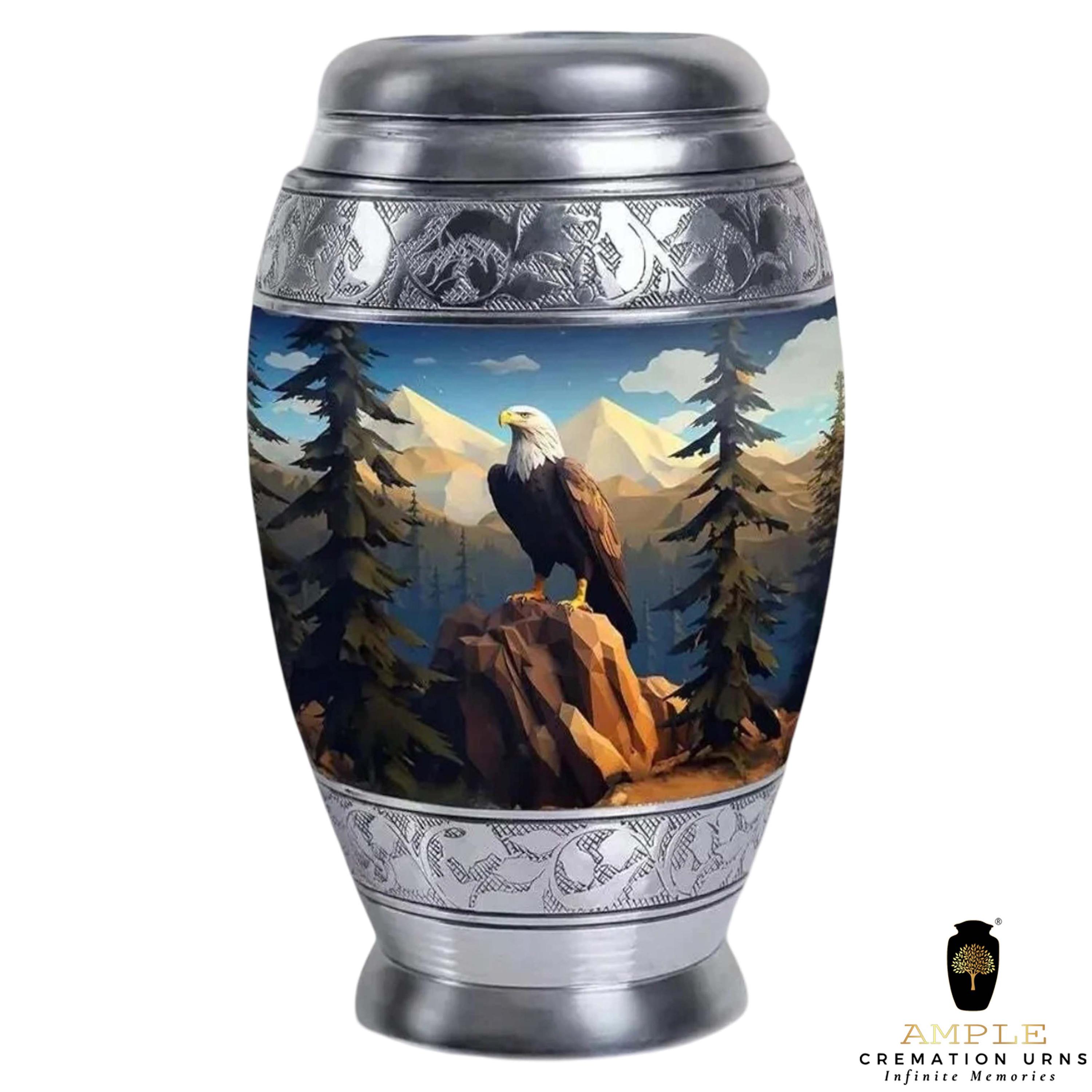 This barrel-style urn features a majestic bald eagle perched atop a rugged mountain peak, overlooking a serene forest landscape. The artwork captures the noble spirit of the wilderness, making it a perfect tribute for veterans, nature lovers, or those who embodied a sense of independence and leadership. The vibrant mountain scene is framed by hand-finished silver-toned bands with deep floral engravings, offering a sophisticated and timeless aesthetic.