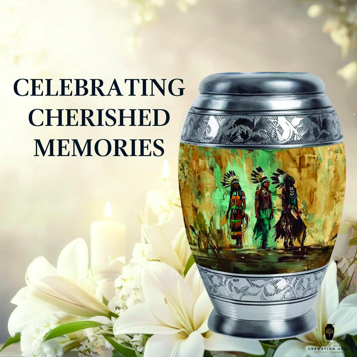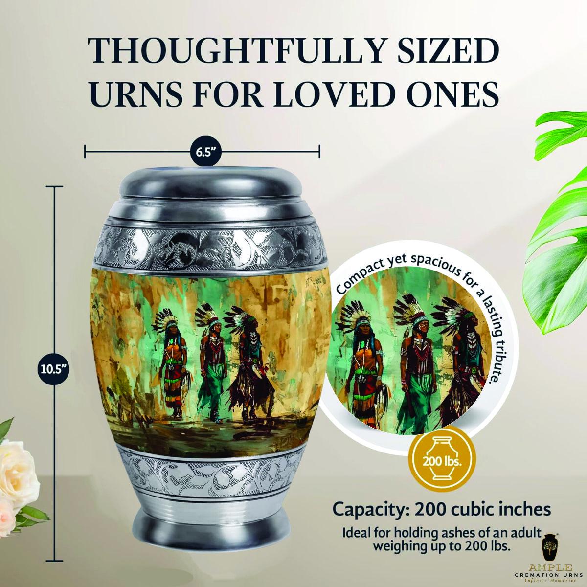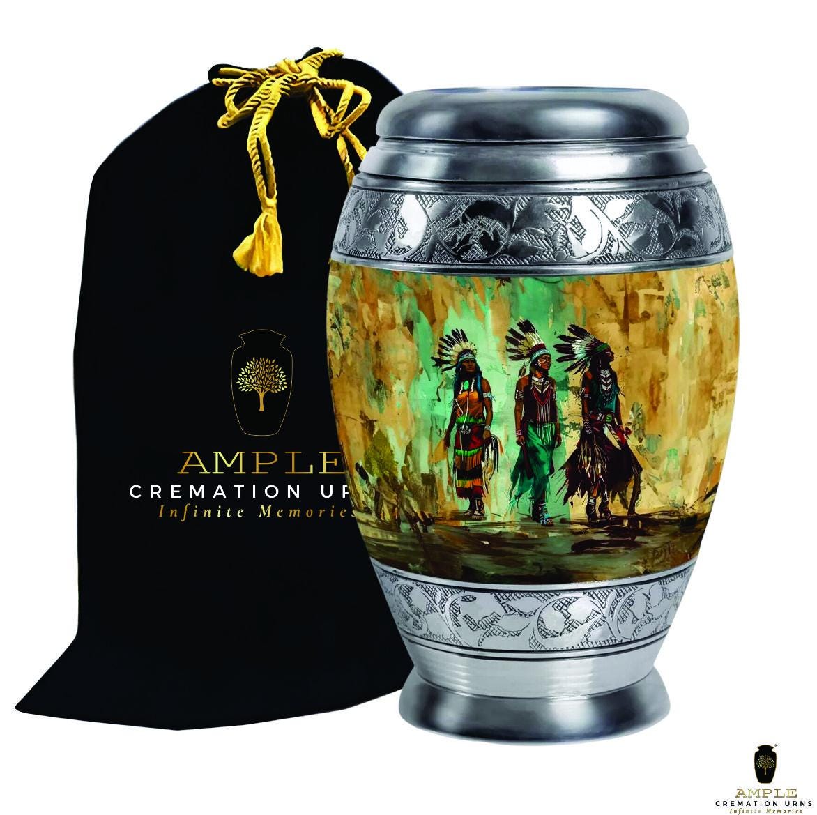 Honor a life of strength, heritage, and spirit with our Sacred Tribal Journey Cremation Urn. Featuring a powerful artistic depiction of tribal figures in traditional attire, this design symbolizes unity, tradition, and the journey of the soul.