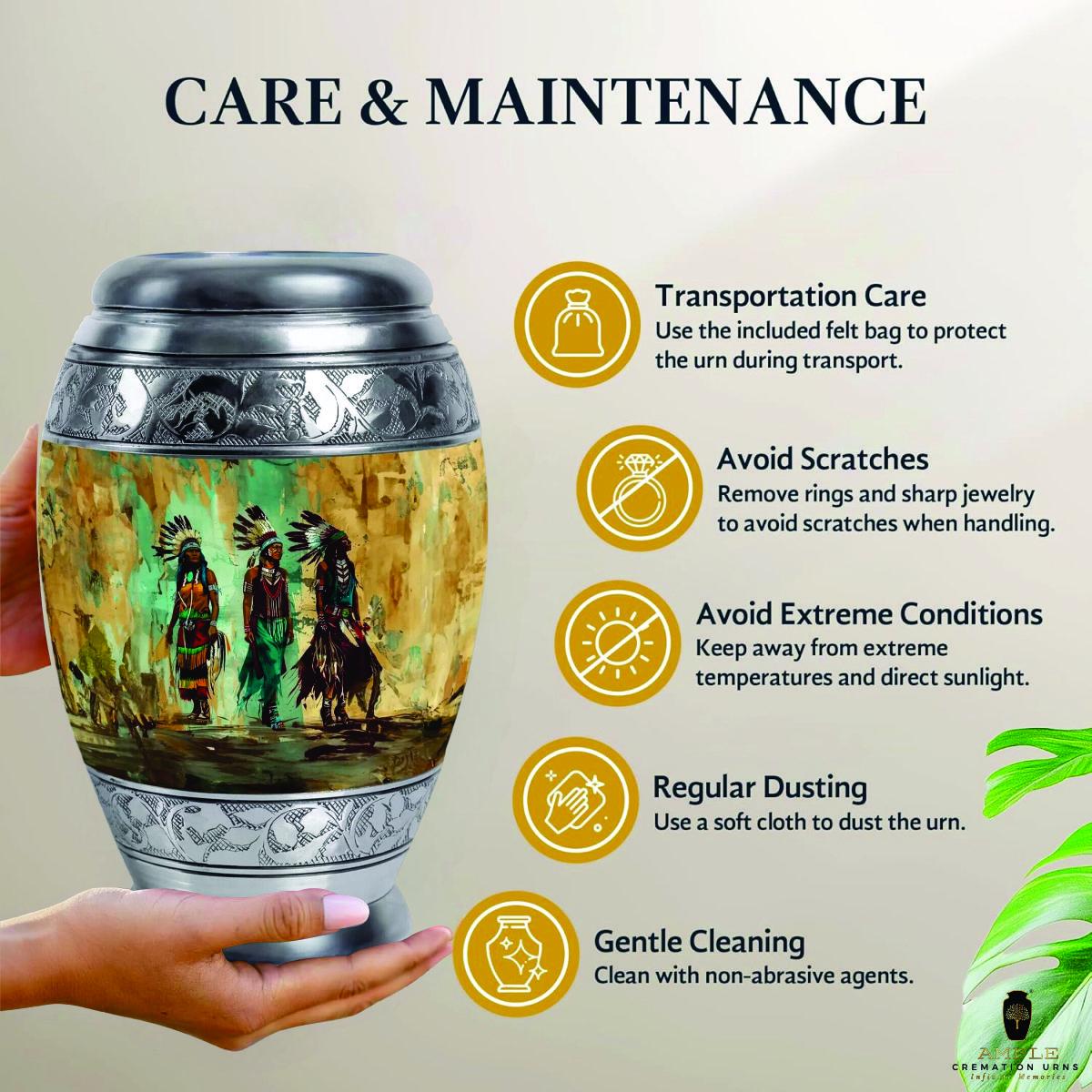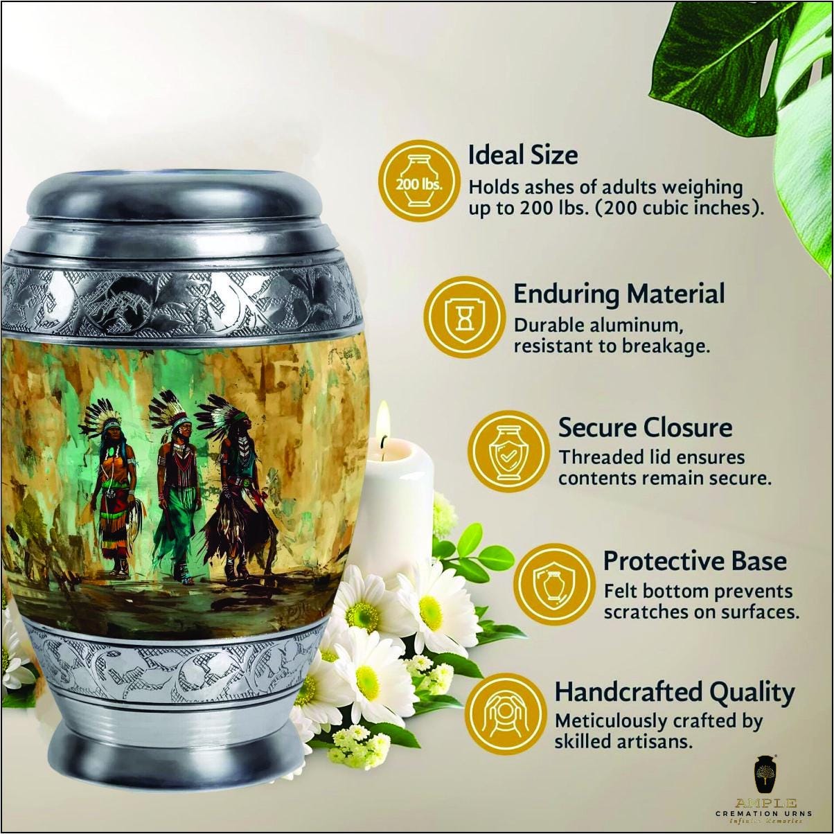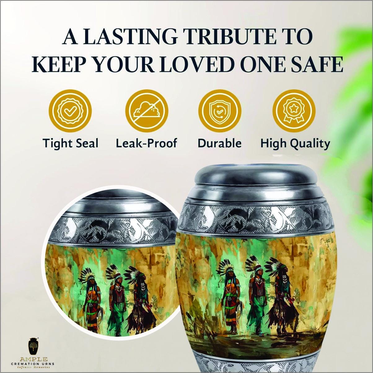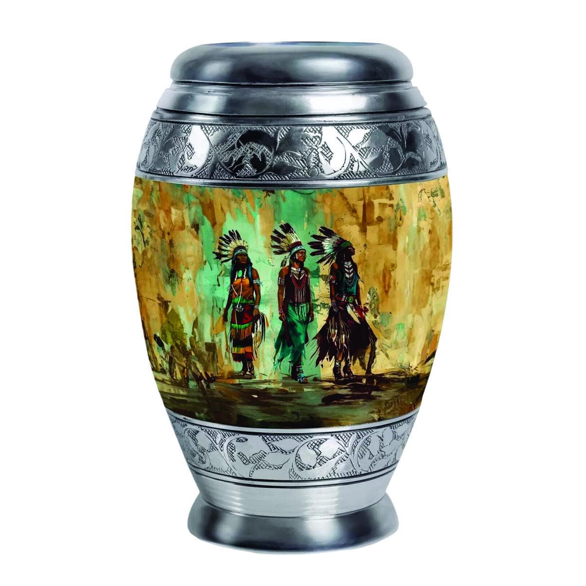 Honor a life of strength, heritage, and spirit with our Sacred Tribal Journey Cremation Urn. Featuring a powerful artistic depiction of tribal figures in traditional attire, this design symbolizes unity, tradition, and the journey of the soul.