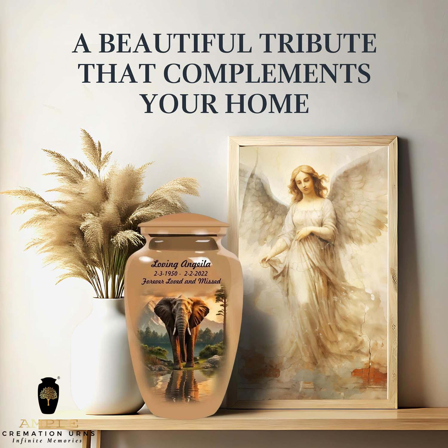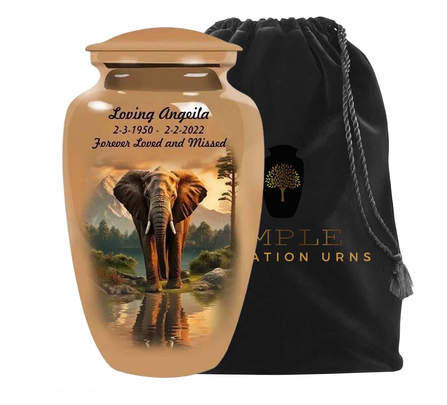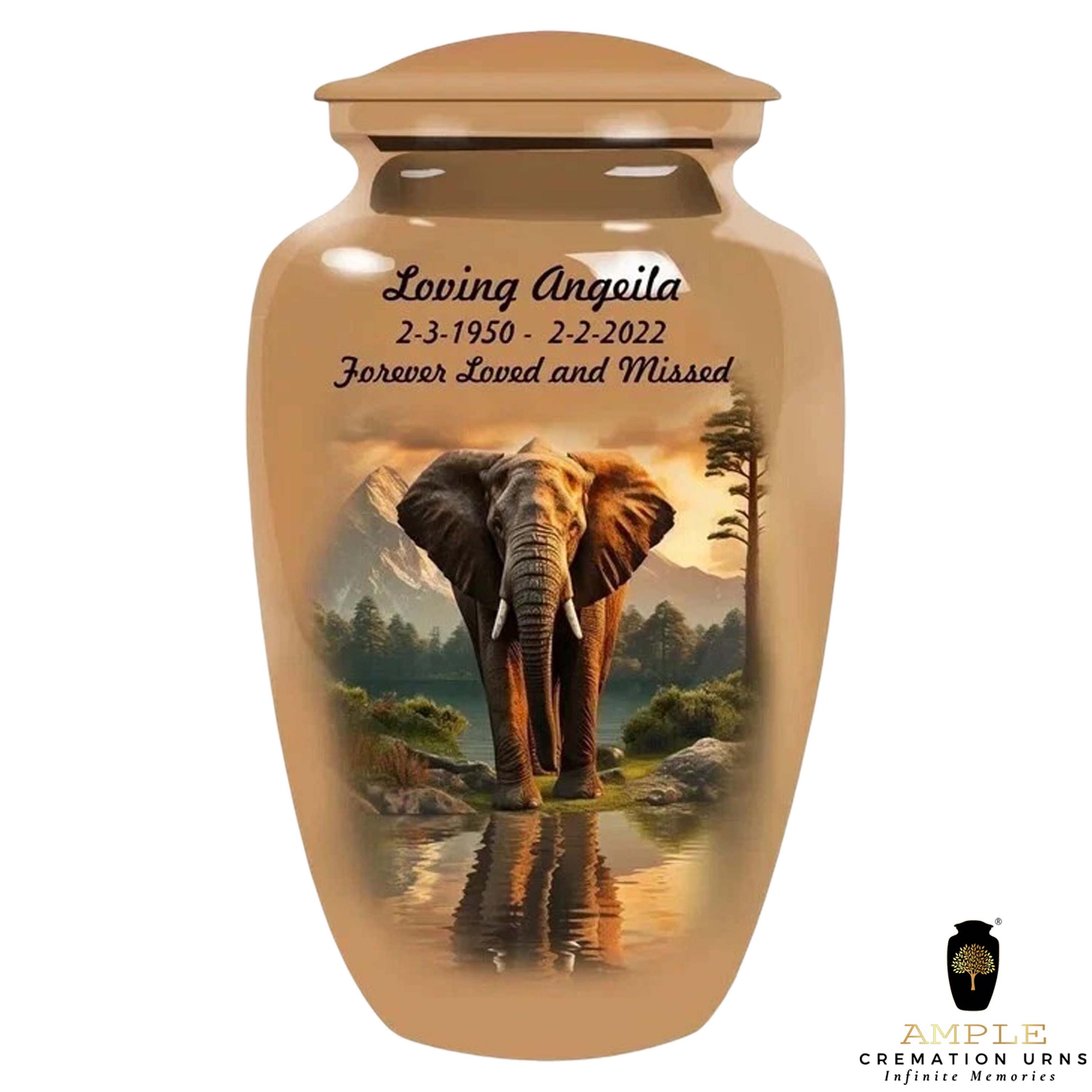 Honor your loved one with dignity and strength through our Eternal Elephant Grace Cremation Urn. Featuring a majestic elephant standing peacefully by a reflective lake with mountains in the background, this design symbolizes wisdom, loyalty, and eternal remembrance.
