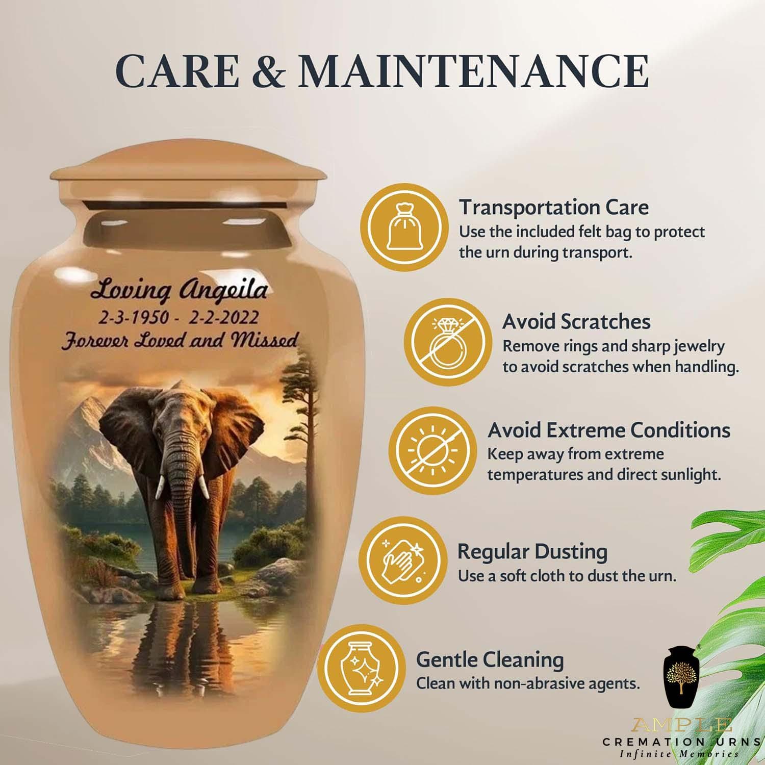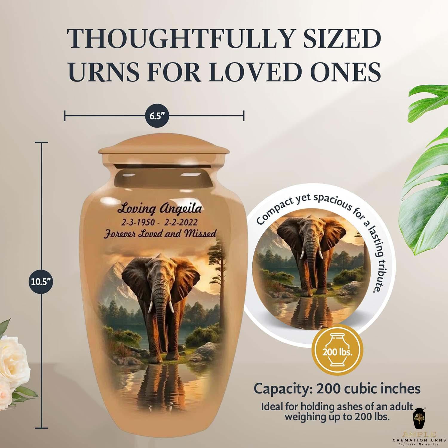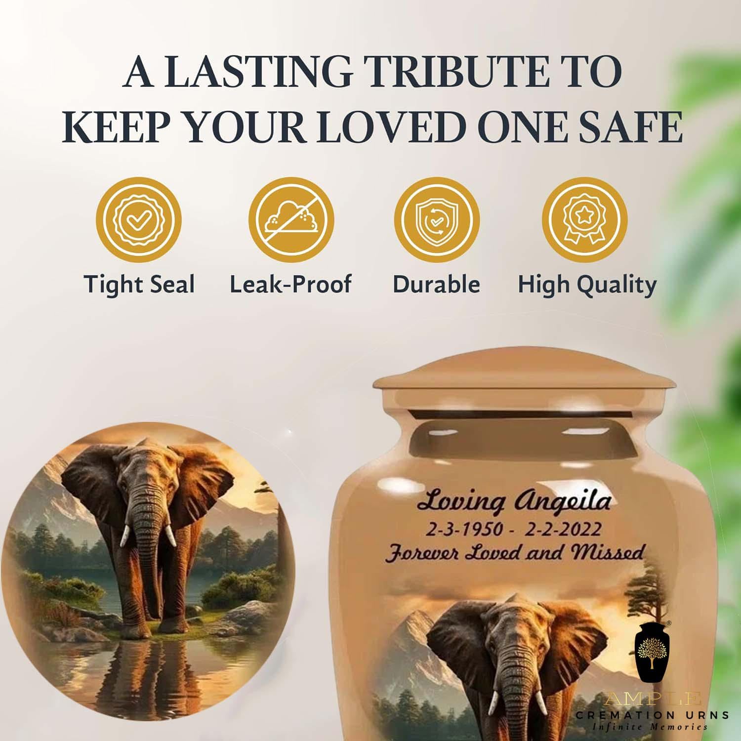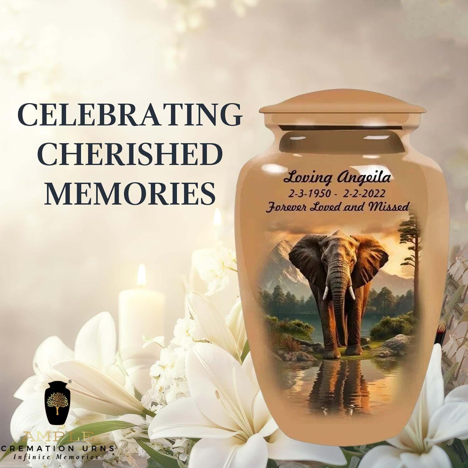 Honor your loved one with dignity and strength through our Eternal Elephant Grace Cremation Urn. Featuring a majestic elephant standing peacefully by a reflective lake with mountains in the background, this design symbolizes wisdom, loyalty, and eternal remembrance.