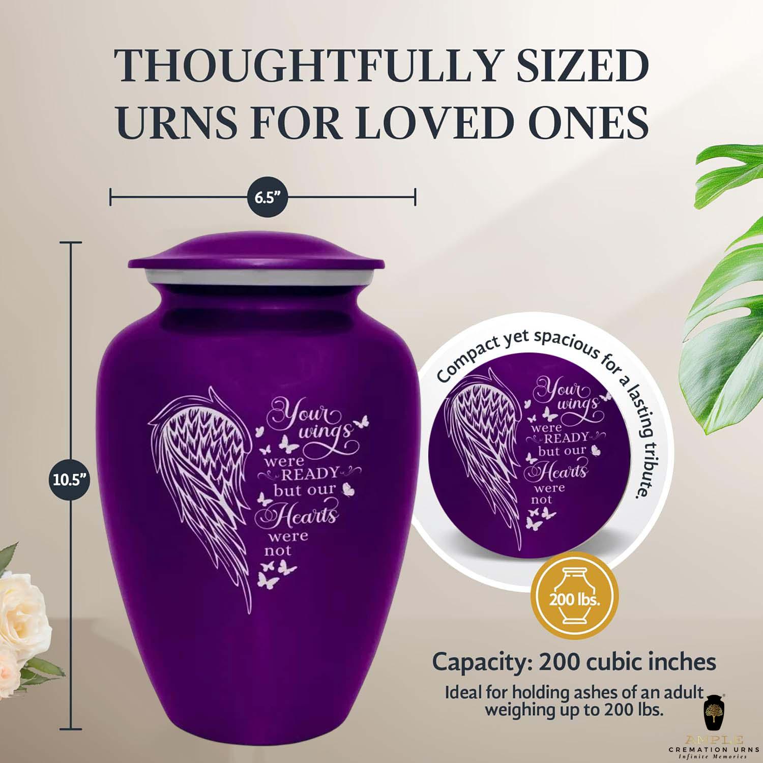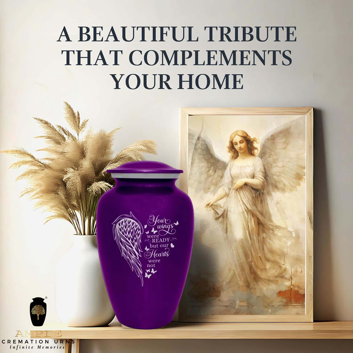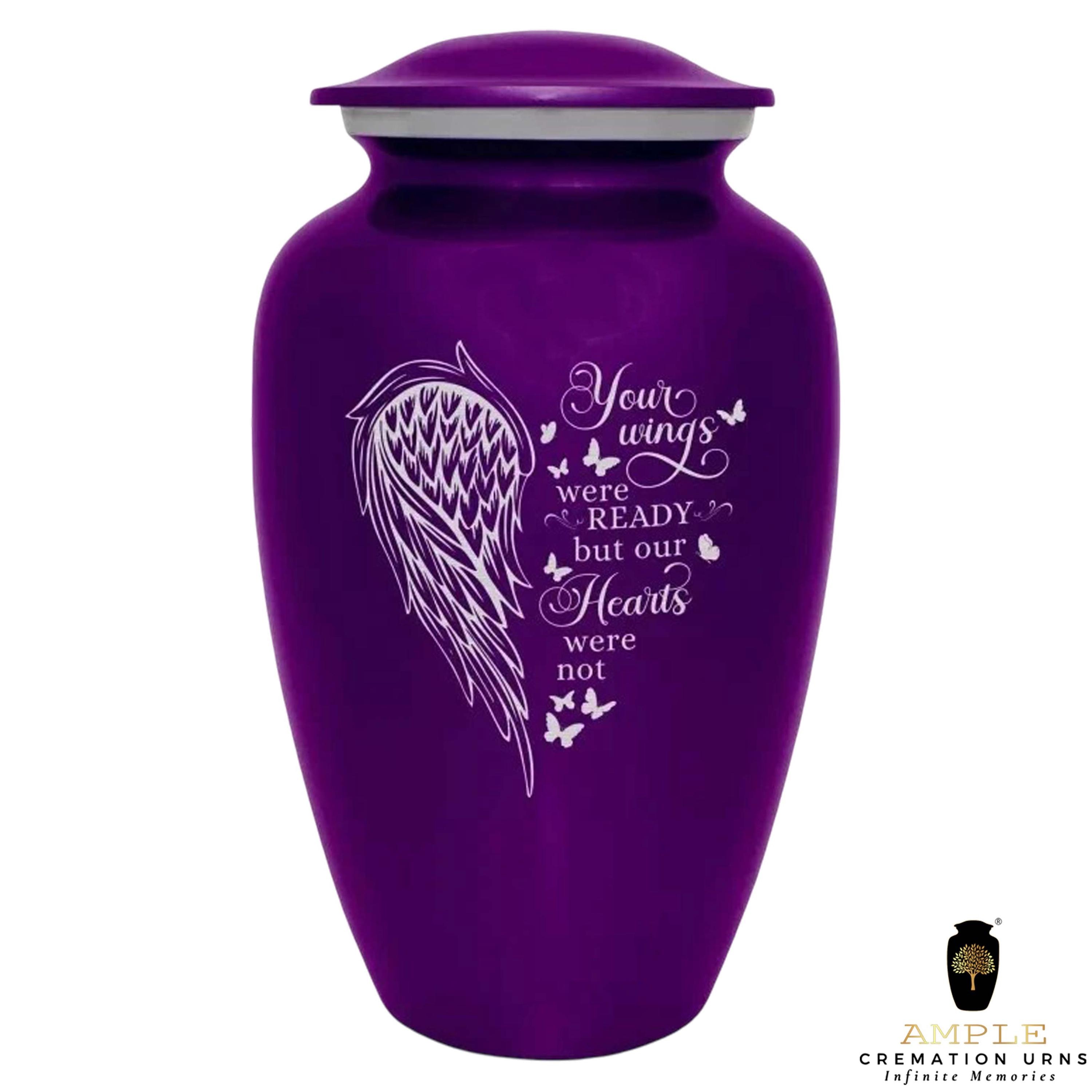 This beautiful purple urn features a poignant white engraving of a celestial wing accompanied by the touching sentiment: "Your wings were ready but our hearts were not." Surrounded by delicate fluttering butterflies, the design serves as a powerful symbol of love, loss, and the eternal journey of the soul. The vibrant deep purple finish offers a dignified and regal tribute, making it a comforting focal point for any memorial.