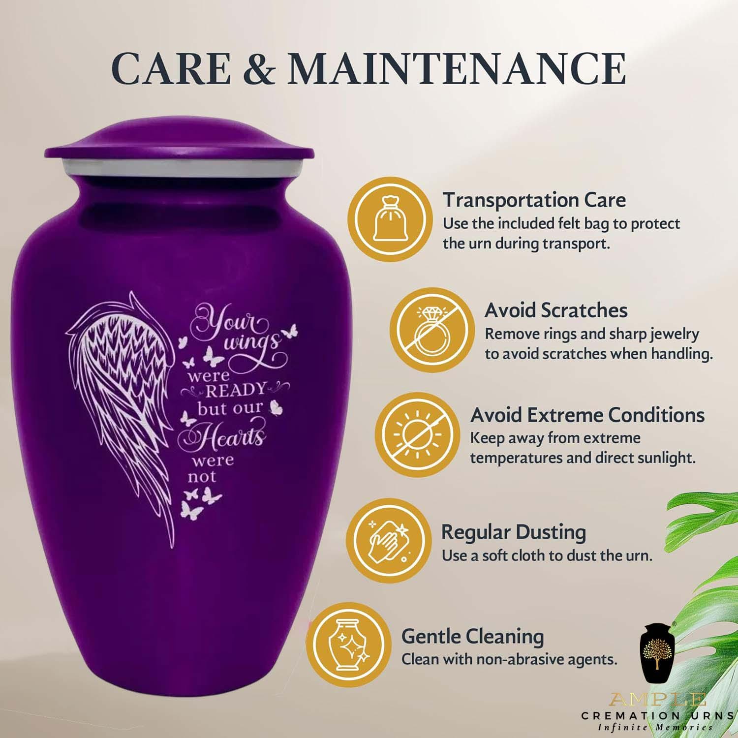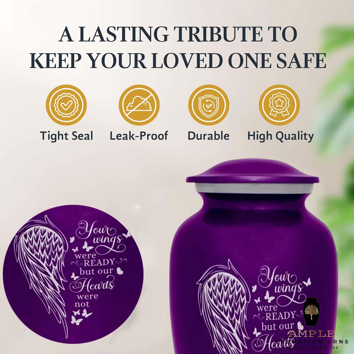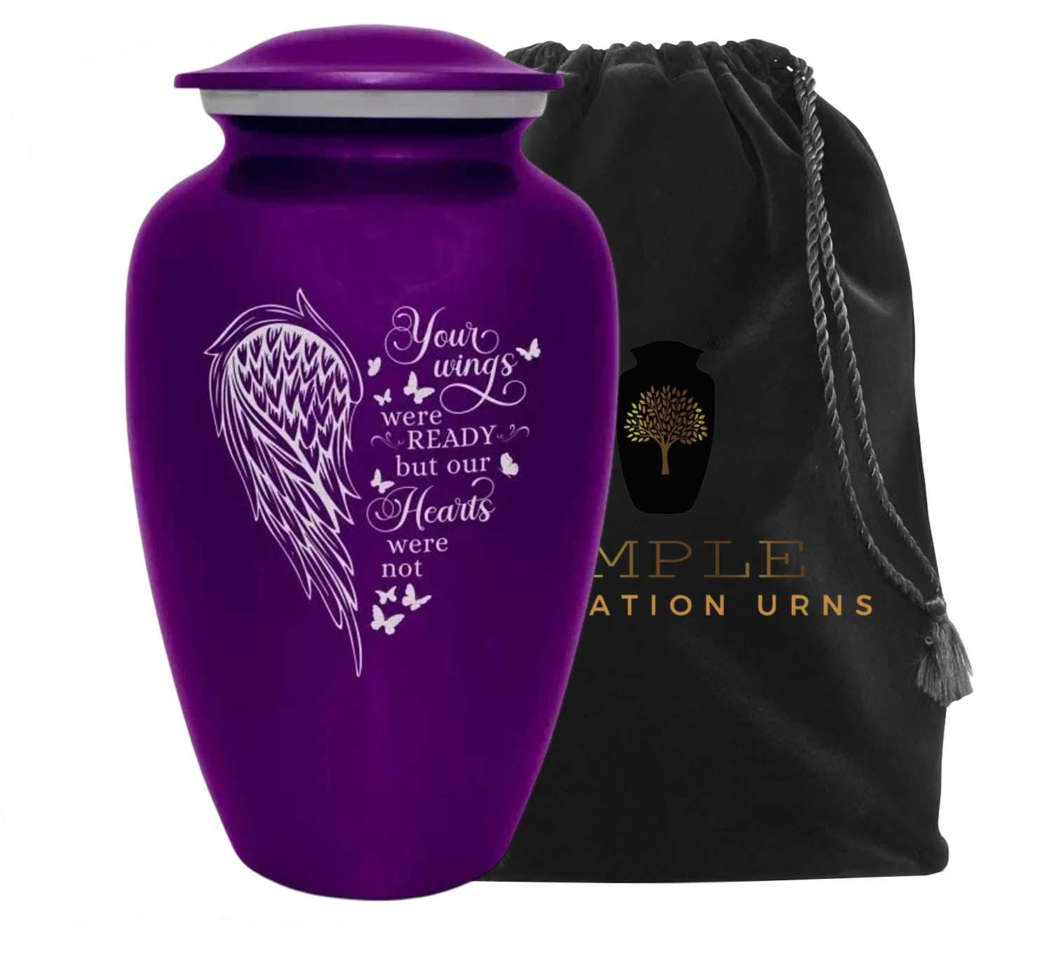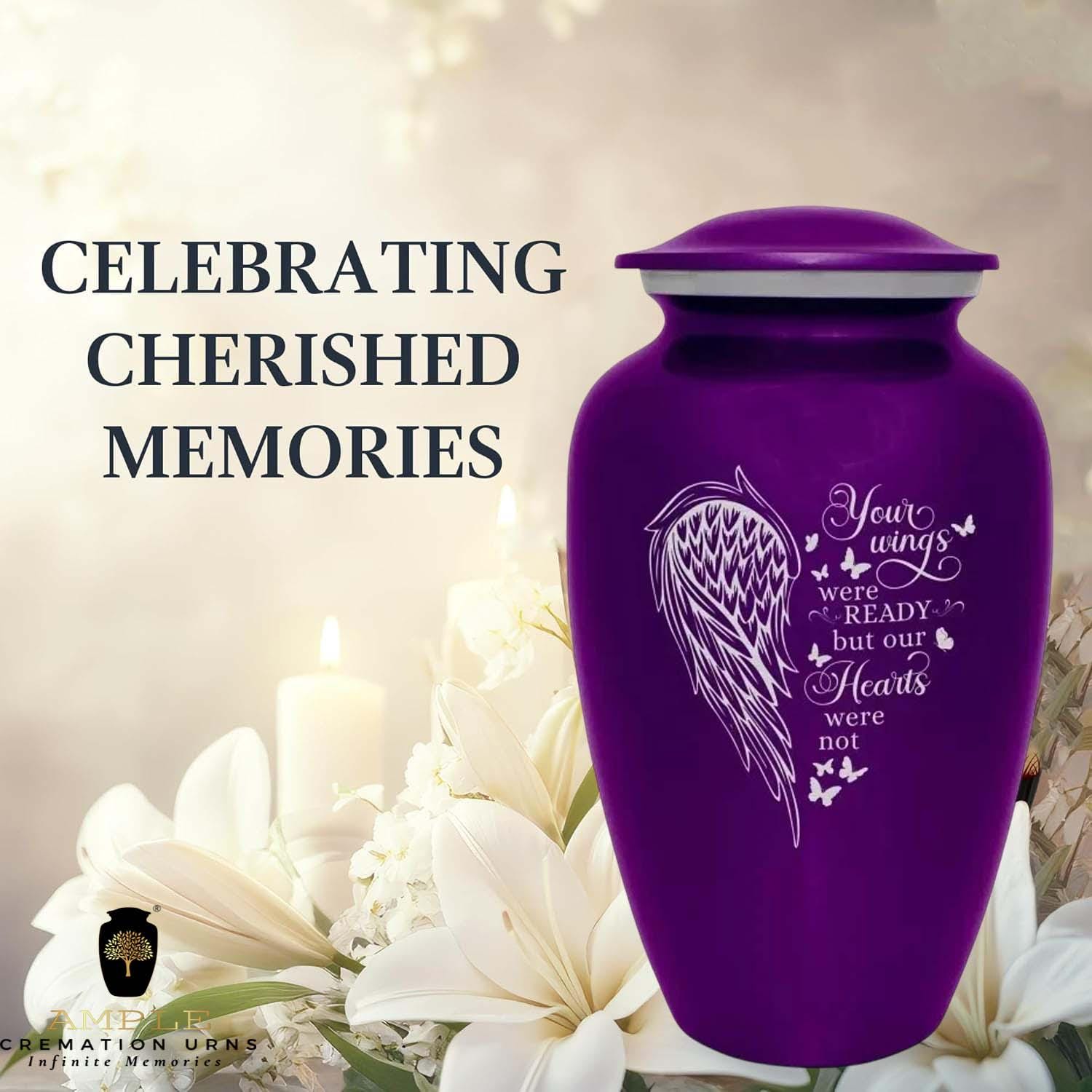 This beautiful purple urn features a poignant white engraving of a celestial wing accompanied by the touching sentiment: "Your wings were ready but our hearts were not." Surrounded by delicate fluttering butterflies, the design serves as a powerful symbol of love, loss, and the eternal journey of the soul. The vibrant deep purple finish offers a dignified and regal tribute, making it a comforting focal point for any memorial.