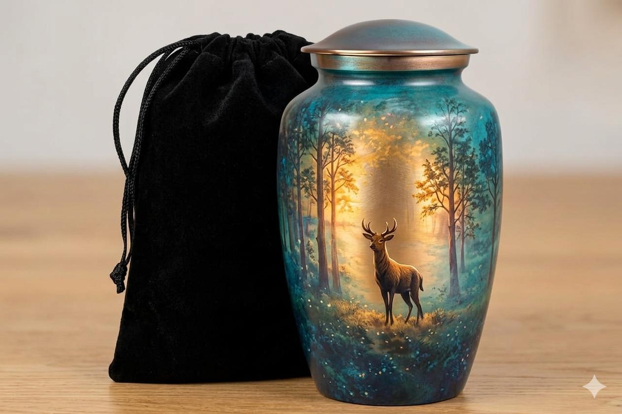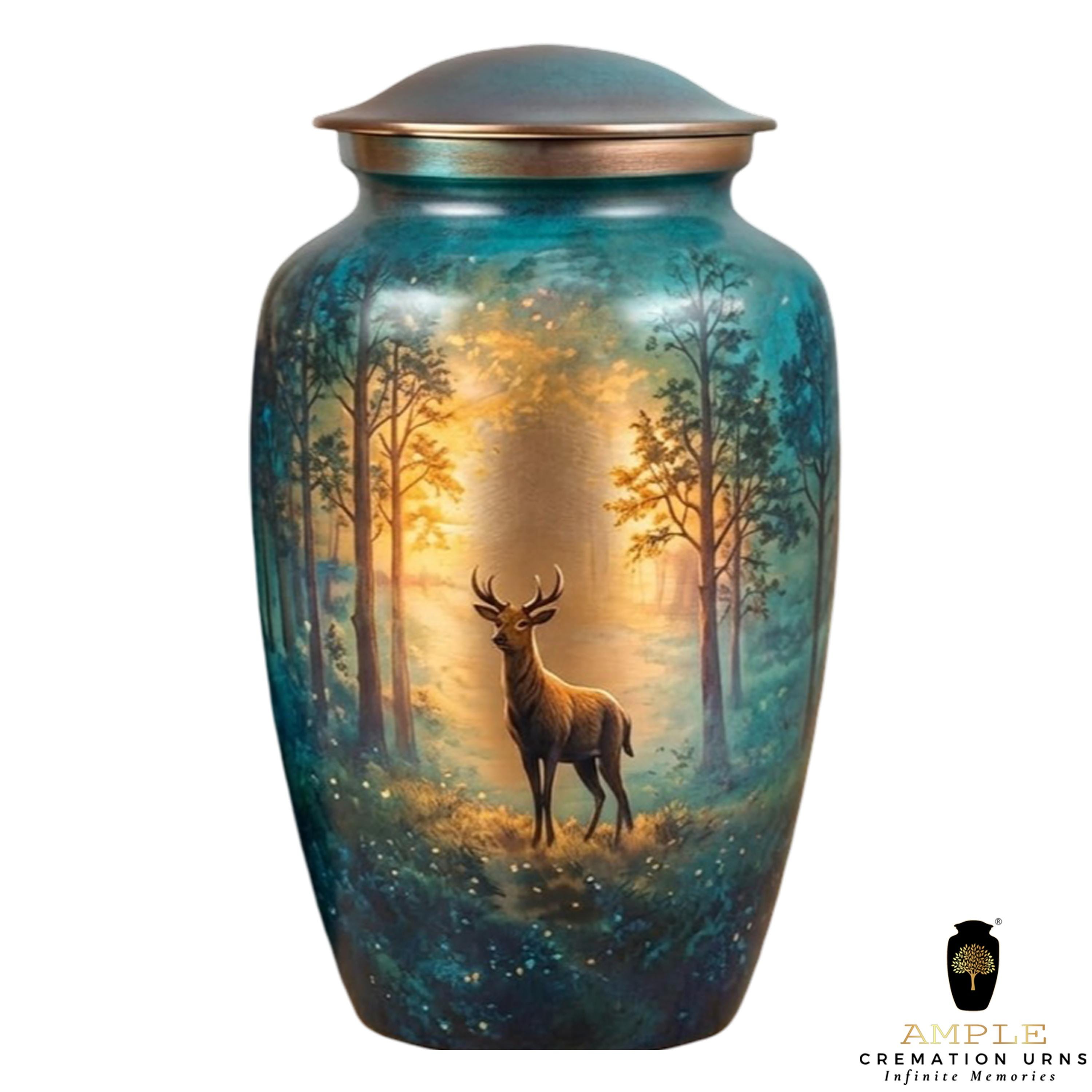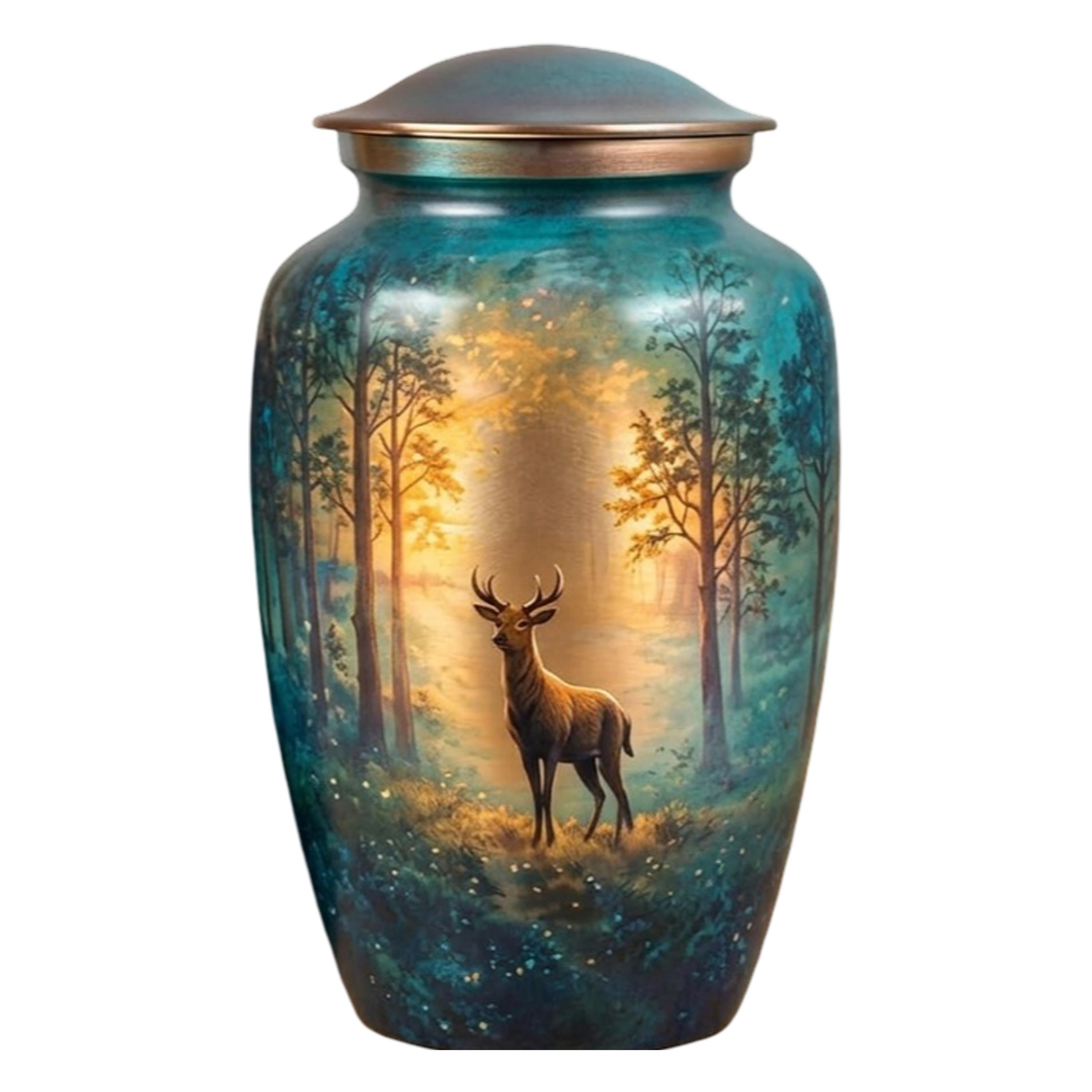 This urn features a colorful hummingbird hovering over a lush garden filled with daisies, poppies, and other vibrant wildflowers. The background uses a soft gradient of sunrise colors—ranging from warm gold and orange to pink—which transitions into deep garden greens, magentas, and blues at the base. It is finished with a metallic, copper-toned lid.