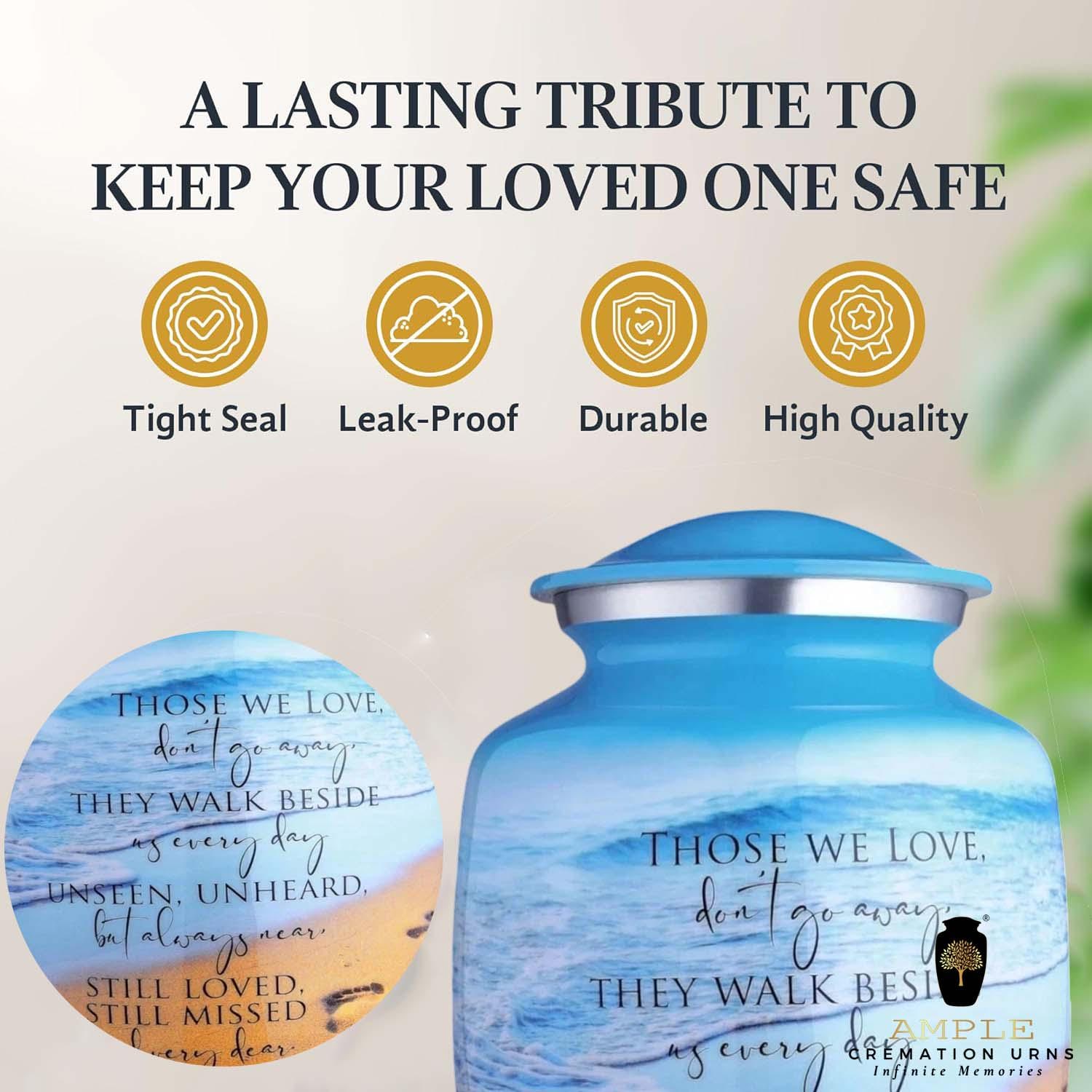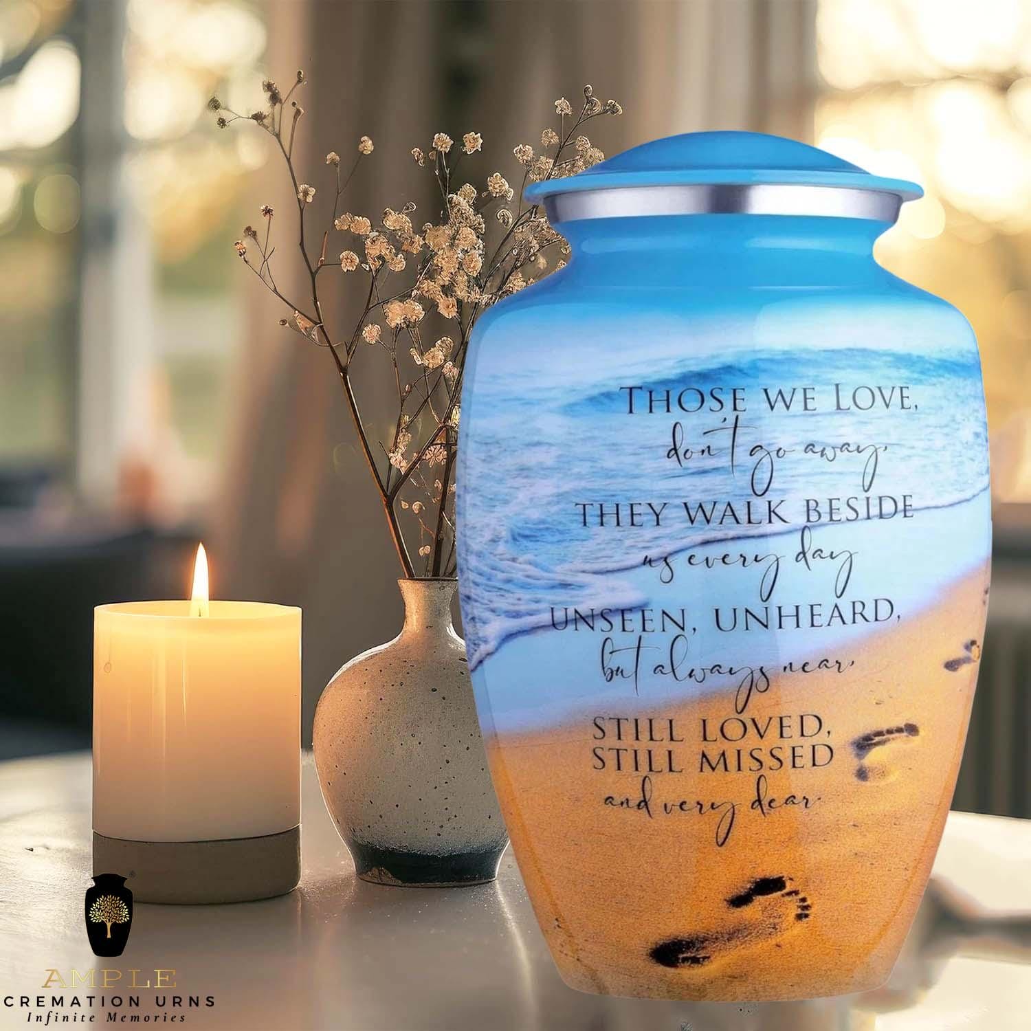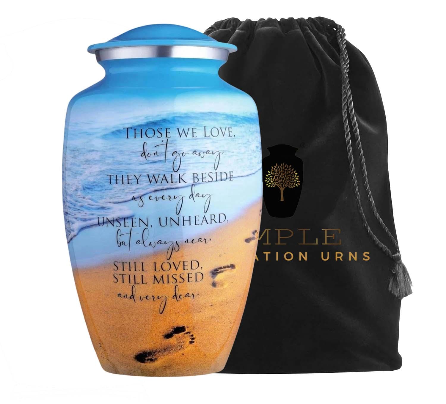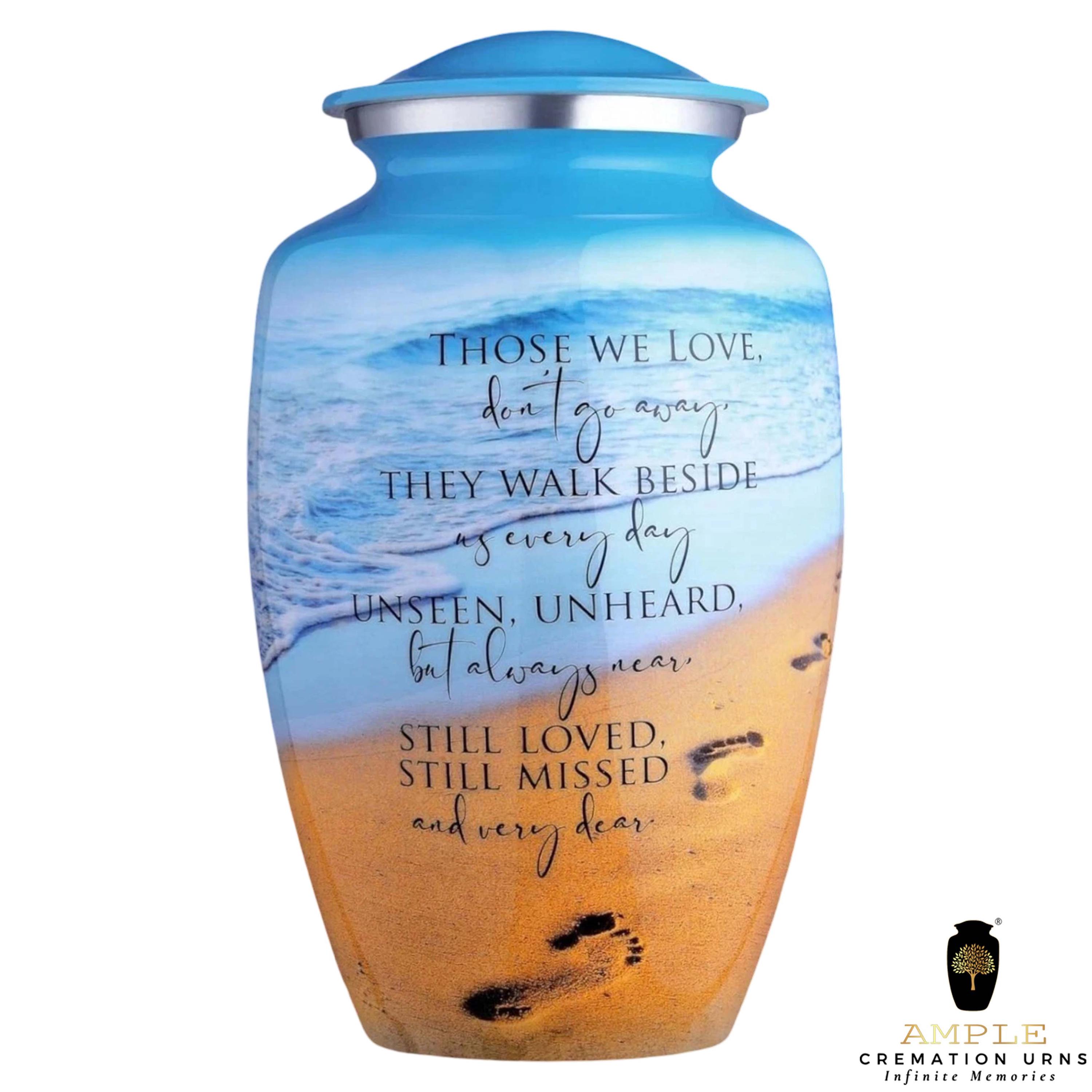 This poignant cremation urn features a serene beach landscape, capturing the gentle roll of ocean waves against a golden shore marked by a single set of footprints. Overlaid with the comforting verse, "Those we love don't go away, they walk beside us every day," this urn serves as a touching reminder of the eternal connection shared with a loved one. The vibrant blue sky and warm sand tones offer a sense of peace and coastal tranquility.