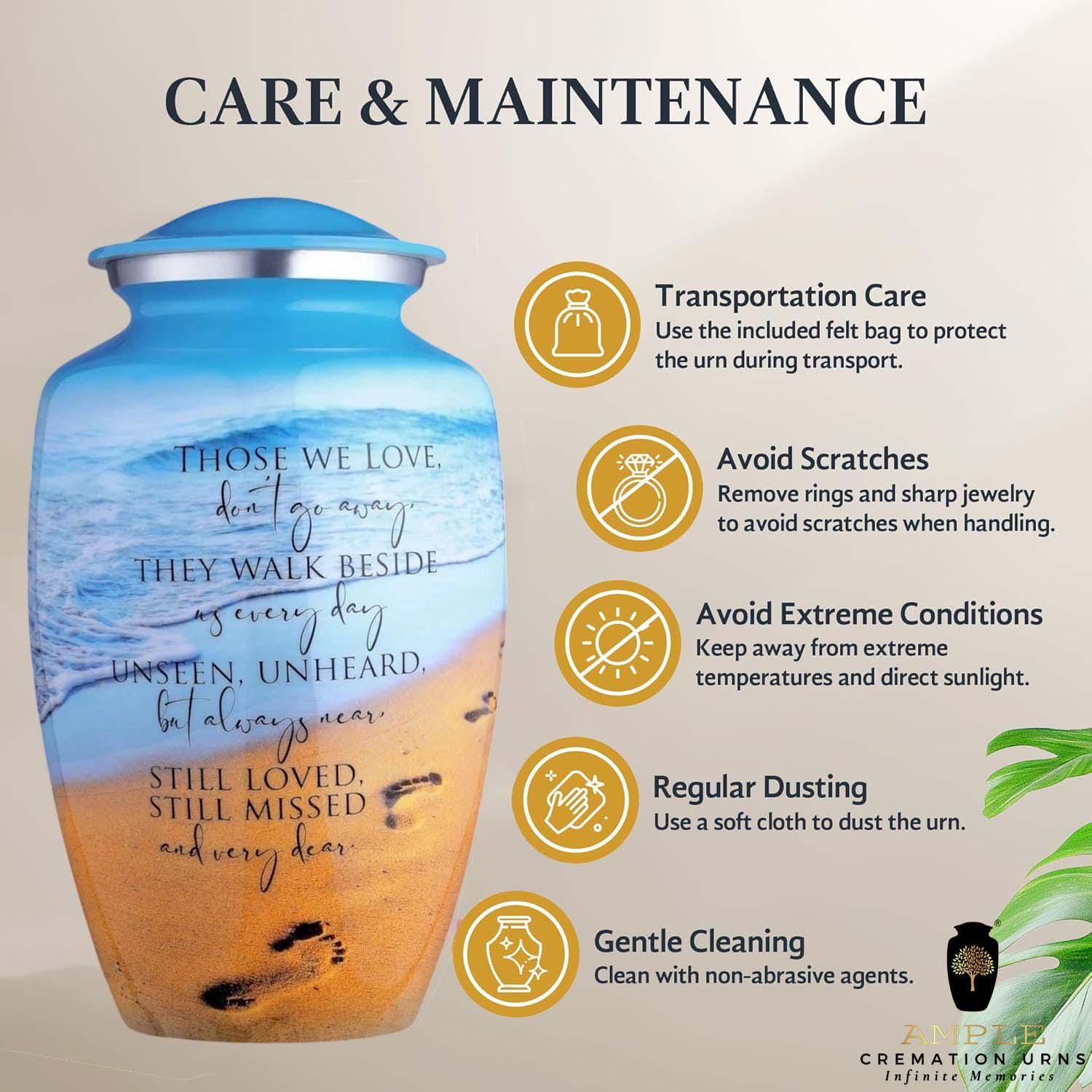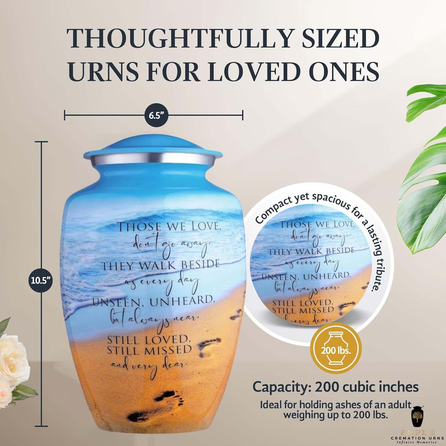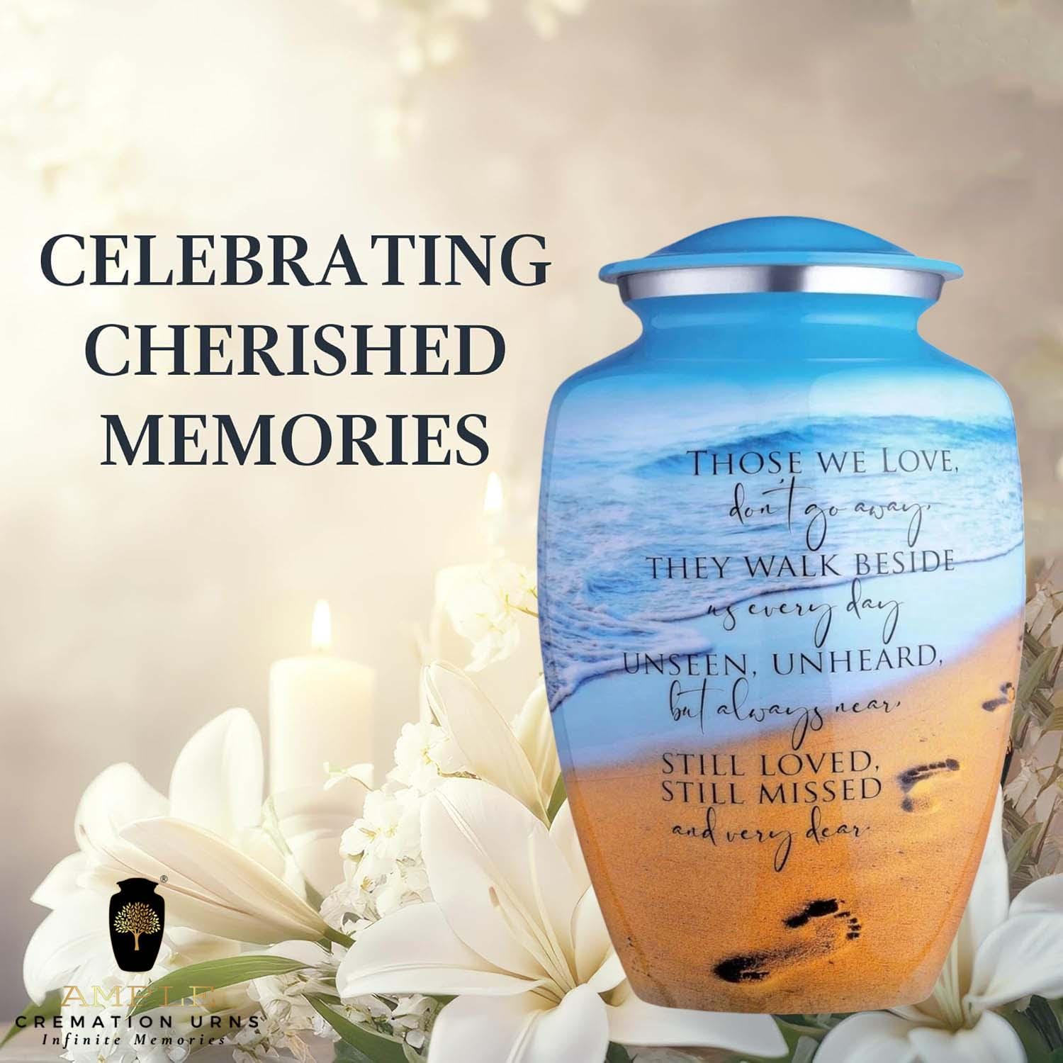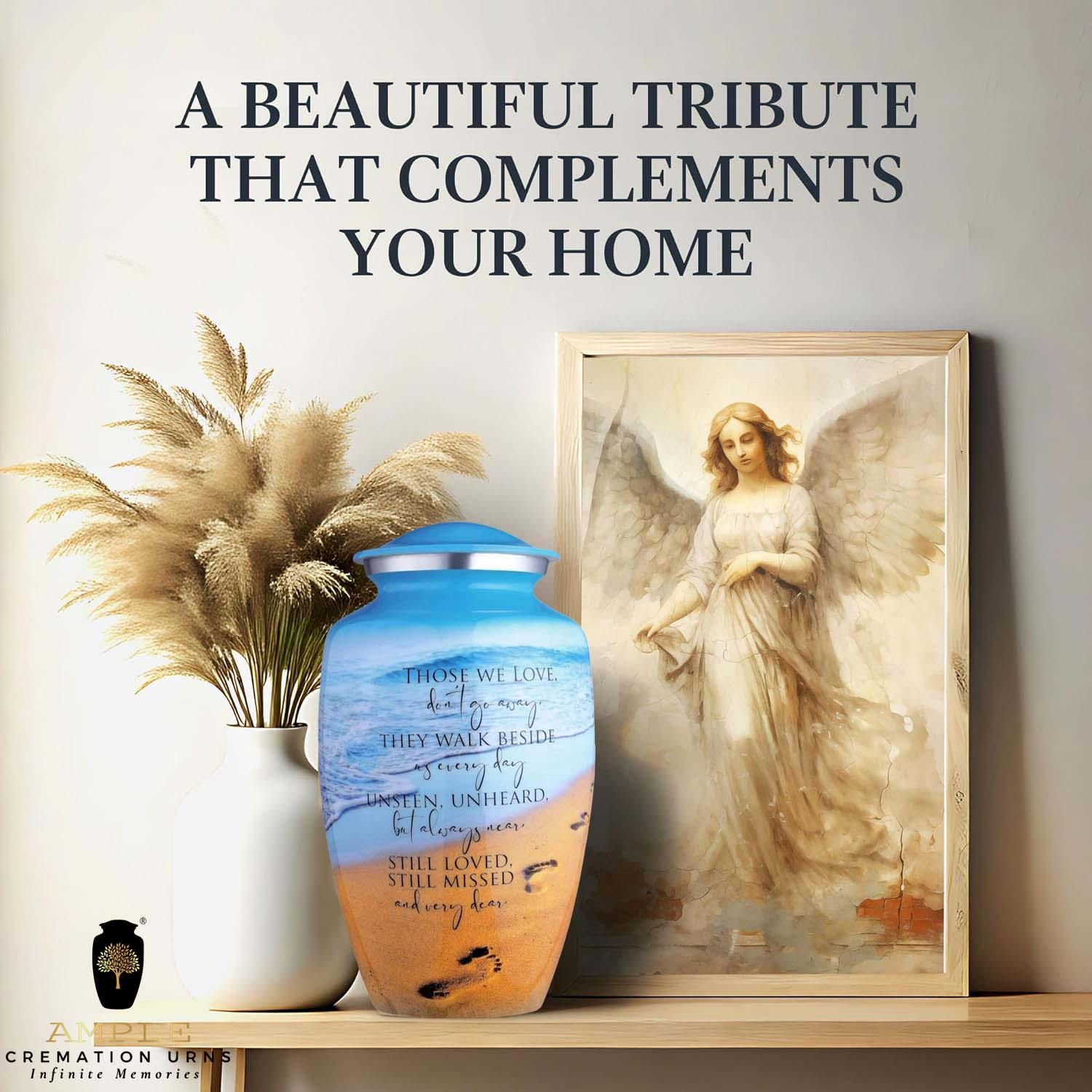 This poignant cremation urn features a serene beach landscape, capturing the gentle roll of ocean waves against a golden shore marked by a single set of footprints. Overlaid with the comforting verse, "Those we love don't go away, they walk beside us every day," this urn serves as a touching reminder of the eternal connection shared with a loved one. The vibrant blue sky and warm sand tones offer a sense of peace and coastal tranquility.