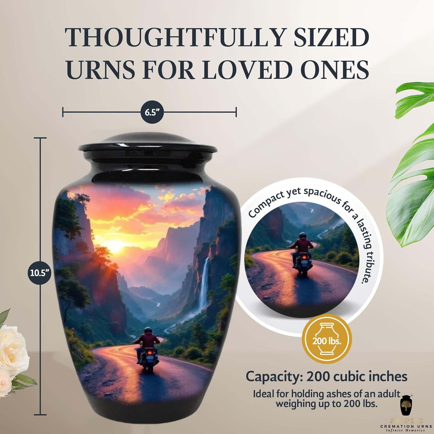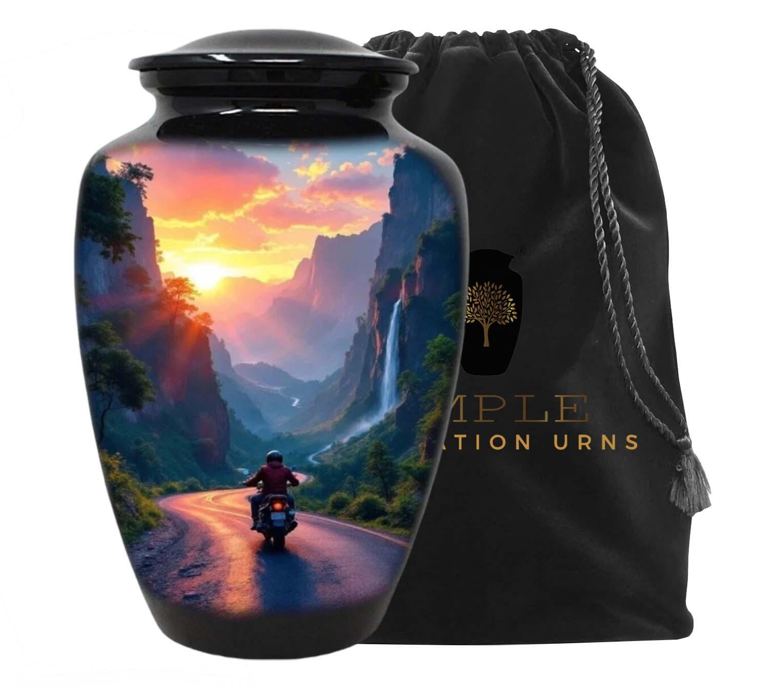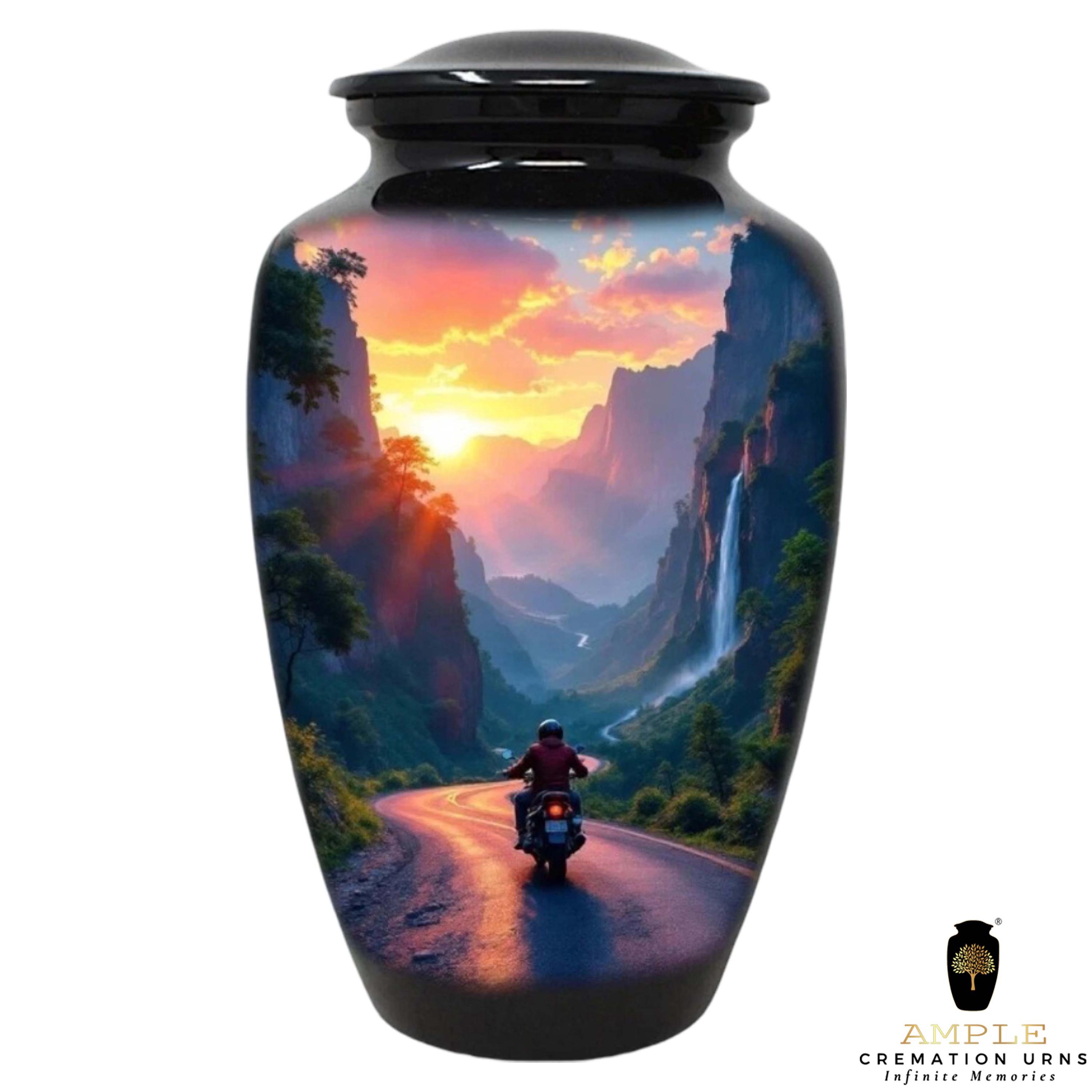 This stunning cremation urn features a cinematic landscape of a lone motorcyclist riding toward a brilliant sunset. The scene is nestled between towering canyon walls and a cascading waterfall, symbolizing a serene final journey through nature’s most beautiful terrain. It is a perfect tribute for the traveler, adventurer, or dedicated biker who found their sanctuary on the open road.