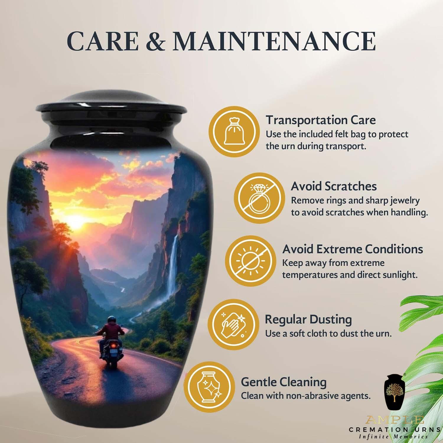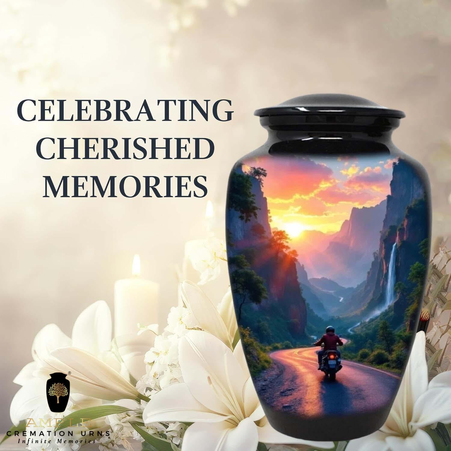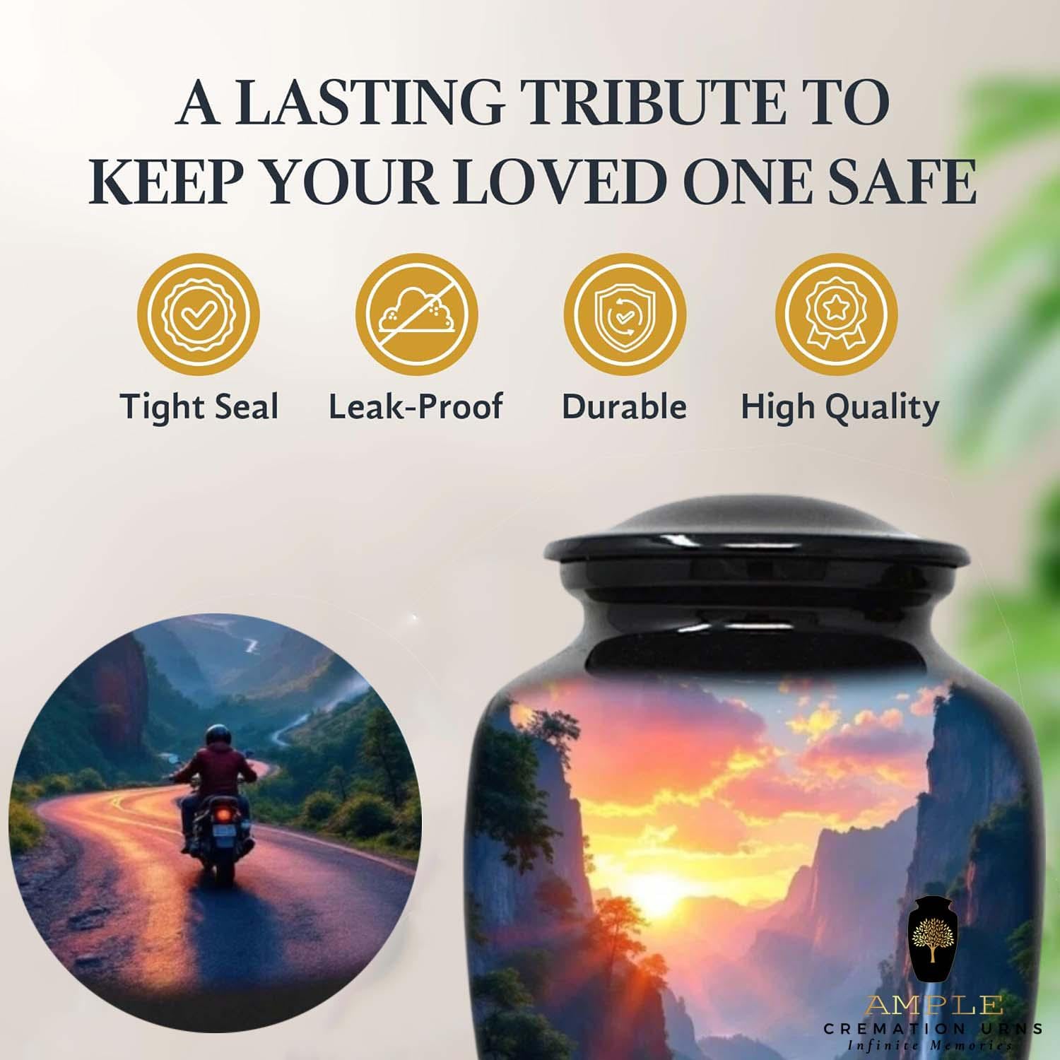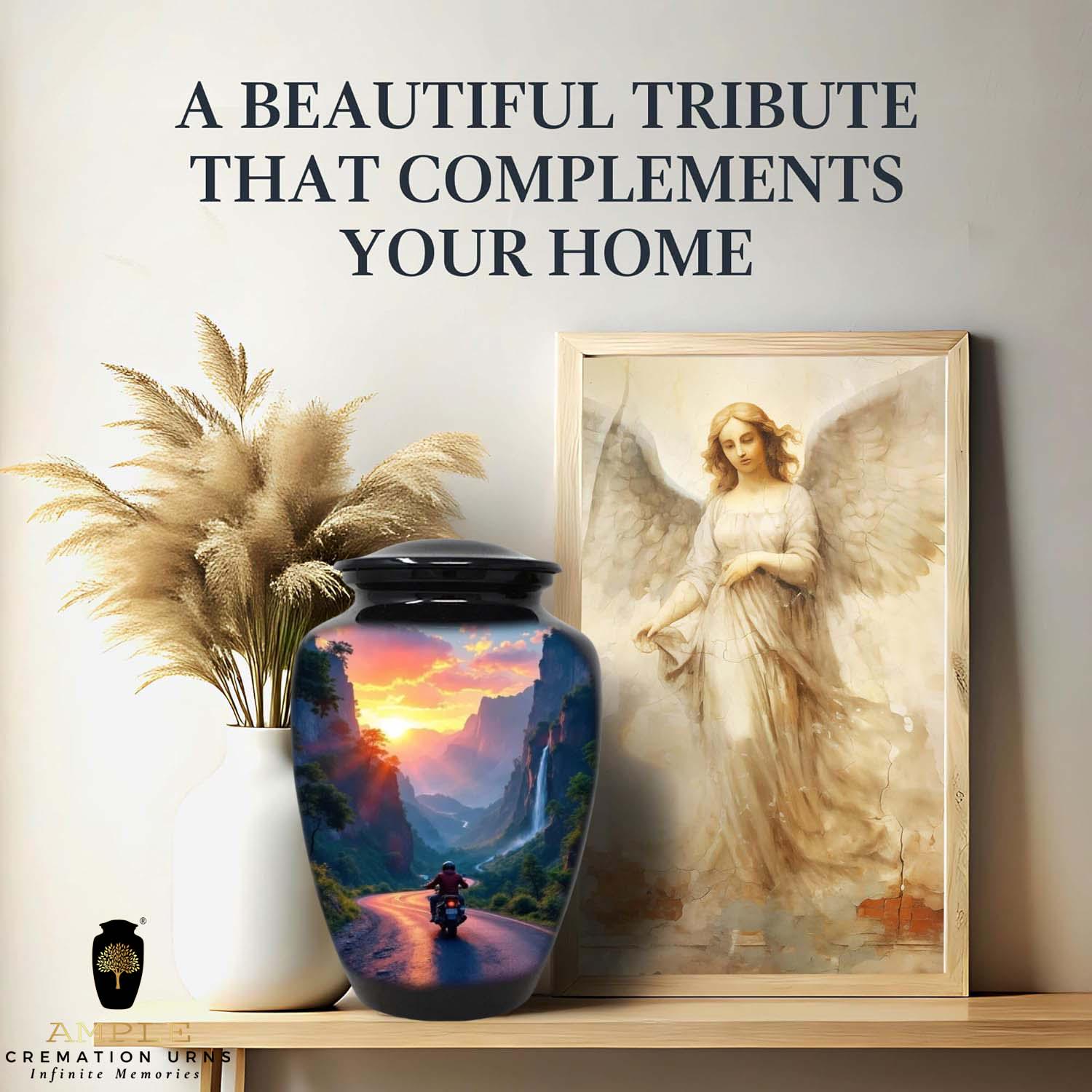 This stunning cremation urn features a cinematic landscape of a lone motorcyclist riding toward a brilliant sunset. The scene is nestled between towering canyon walls and a cascading waterfall, symbolizing a serene final journey through nature’s most beautiful terrain. It is a perfect tribute for the traveler, adventurer, or dedicated biker who found their sanctuary on the open road.