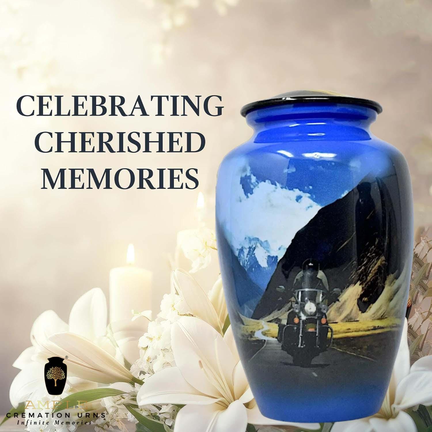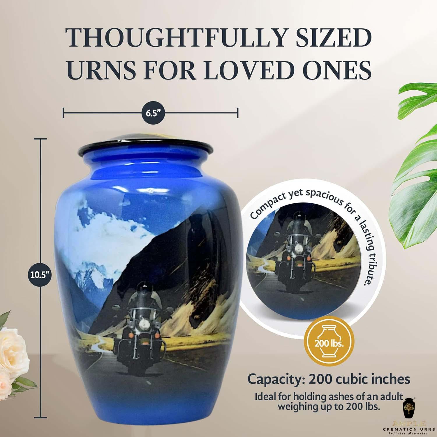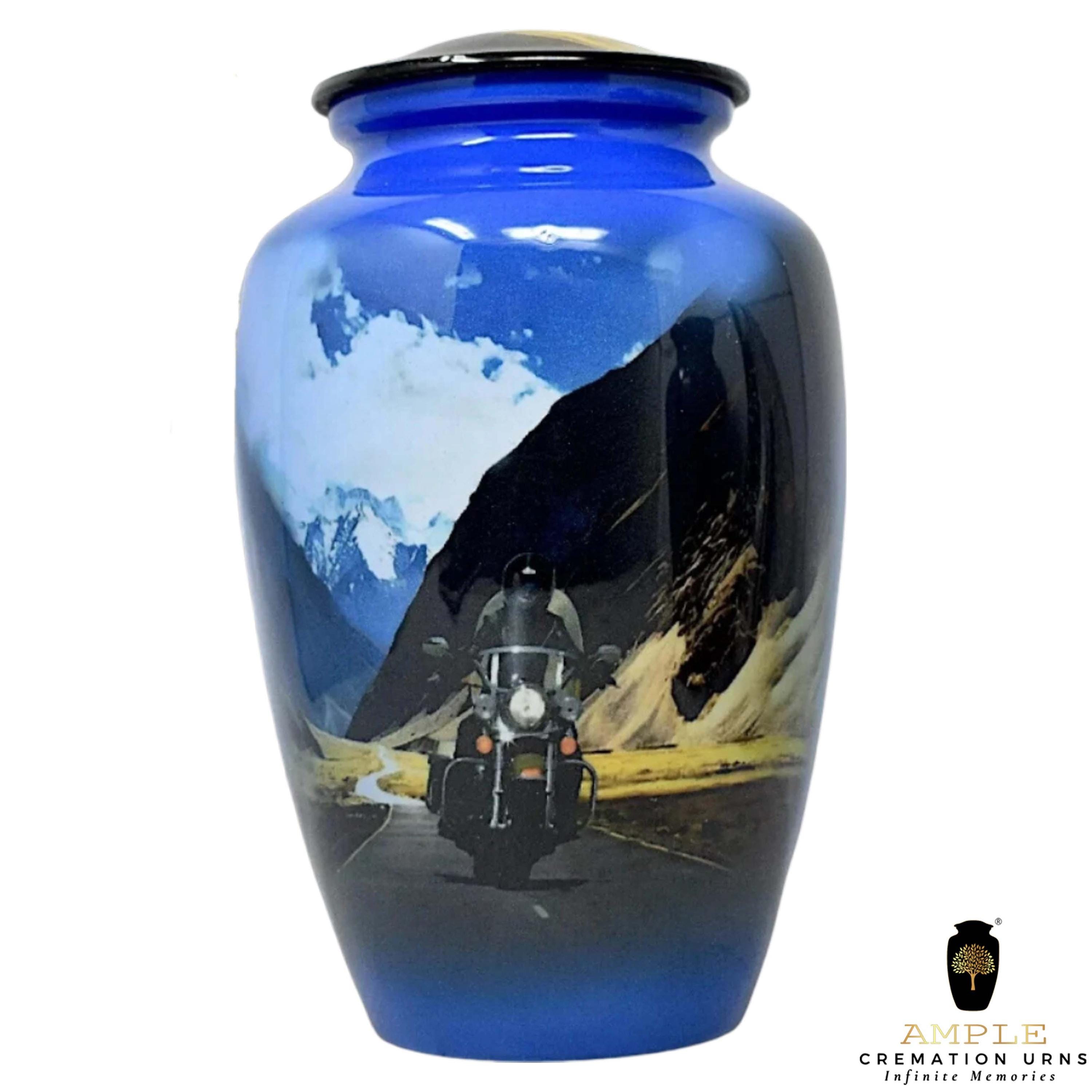 This striking cremation urn features a high-definition print of a lone rider on a motorcycle, cruising down a winding mountain highway toward a snow-capped peak. The deep cobalt blue sky and rugged landscape capture the thrill of the ride and the peace found on the long journey home. It is a perfect tribute for the biker, traveler, or outdoor enthusiast who lived life with passion and a love for the wind in their face.