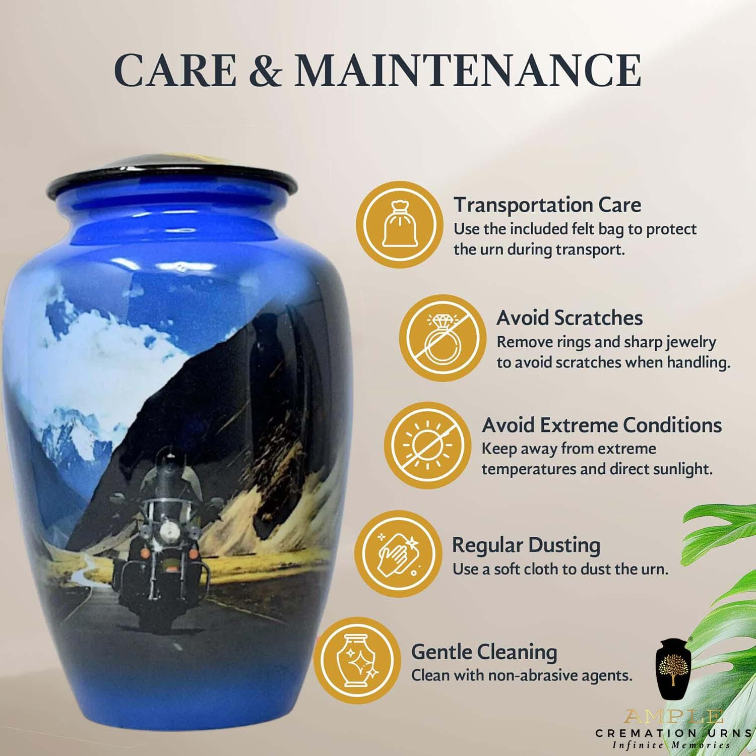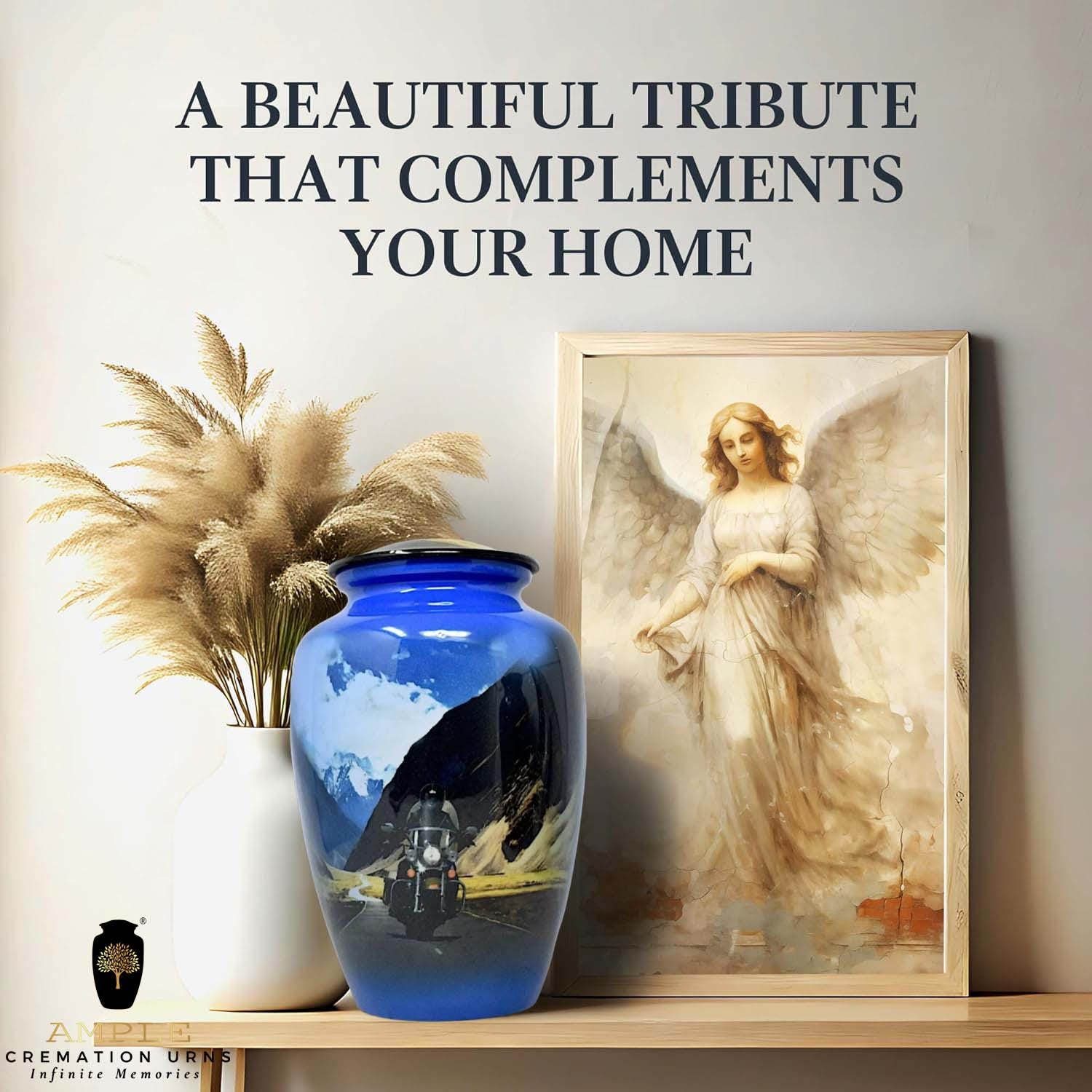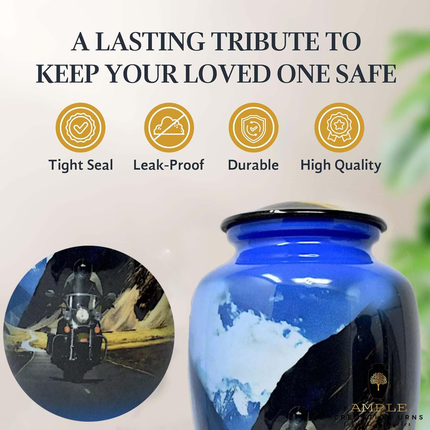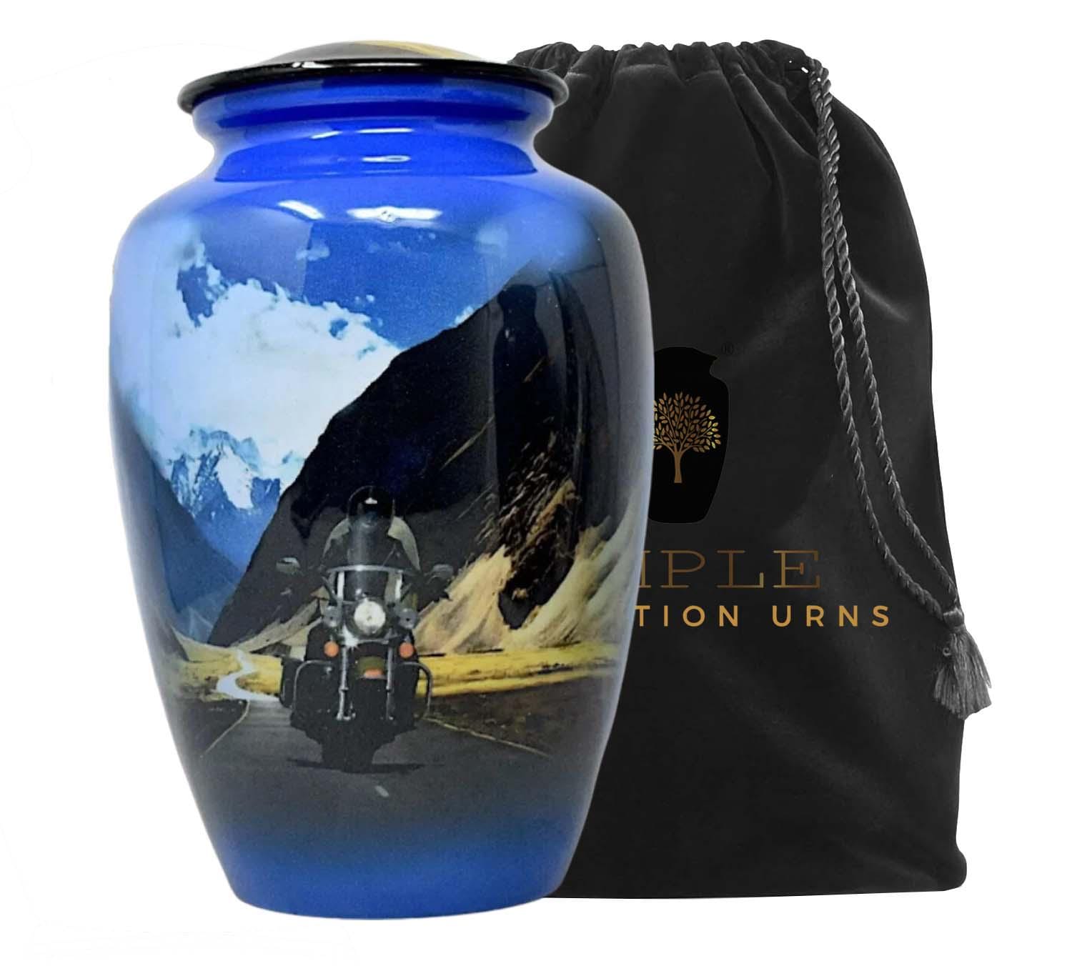 This striking cremation urn features a high-definition print of a lone rider on a motorcycle, cruising down a winding mountain highway toward a snow-capped peak. The deep cobalt blue sky and rugged landscape capture the thrill of the ride and the peace found on the long journey home. It is a perfect tribute for the biker, traveler, or outdoor enthusiast who lived life with passion and a love for the wind in their face.