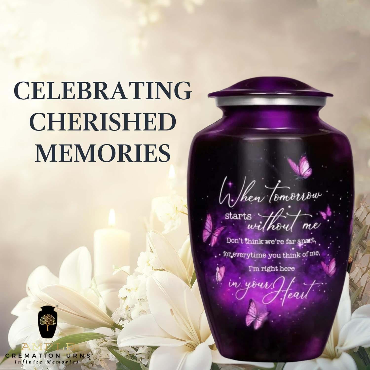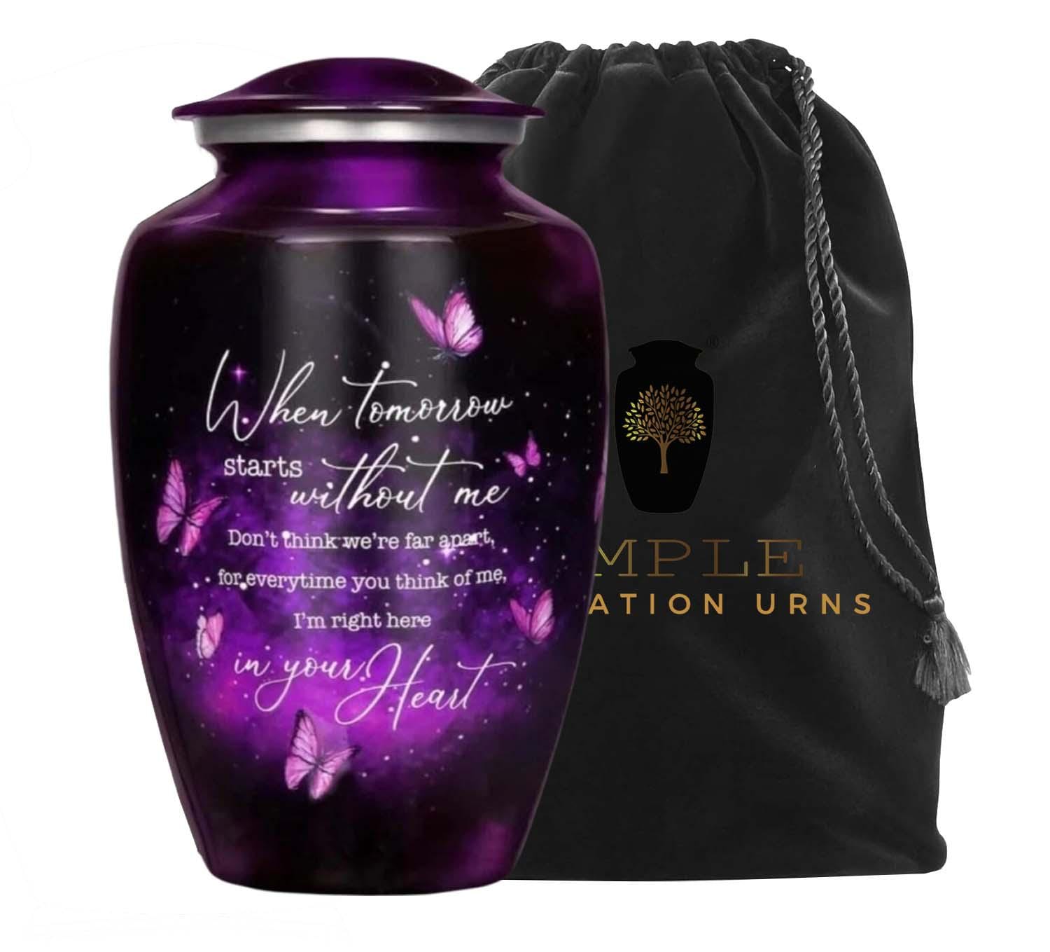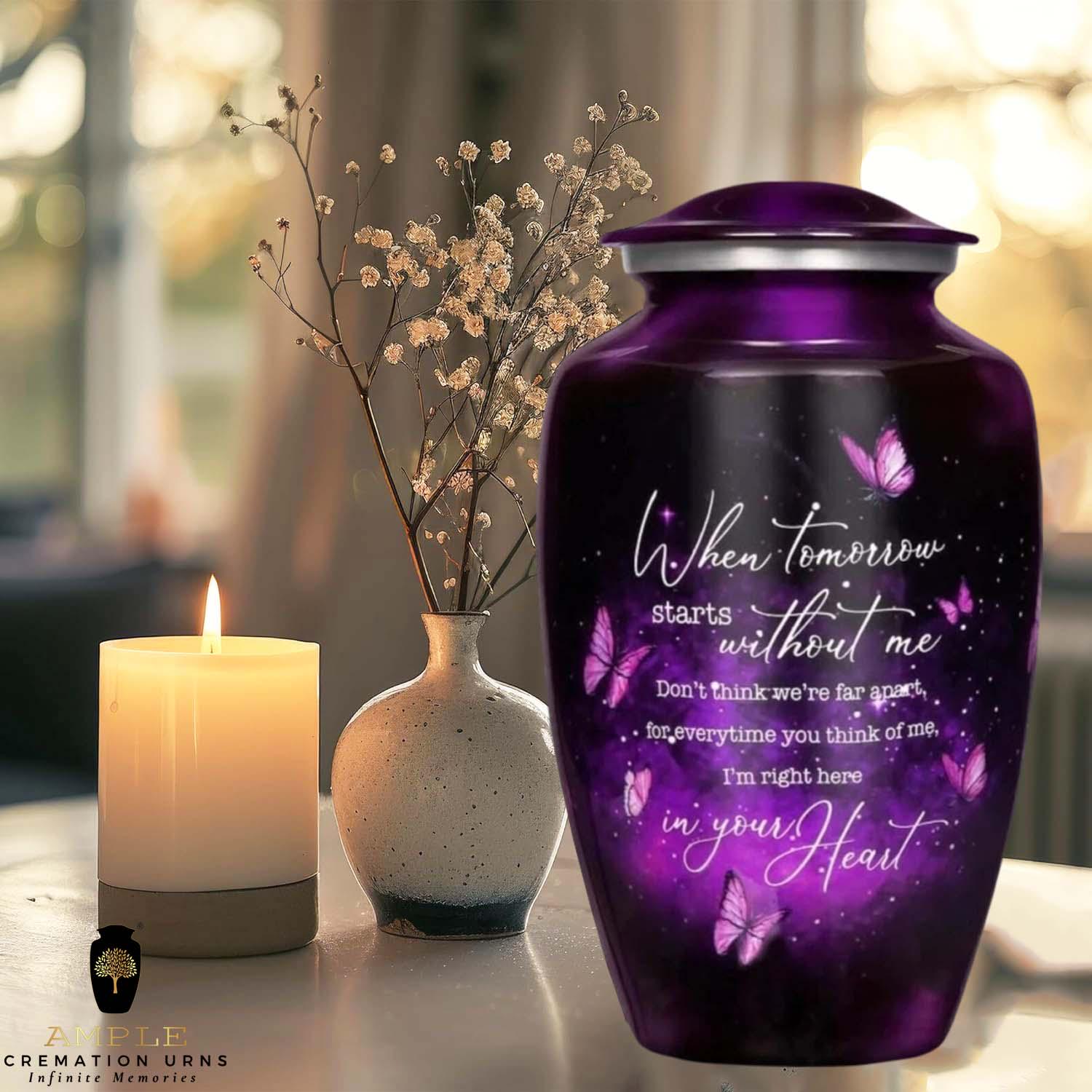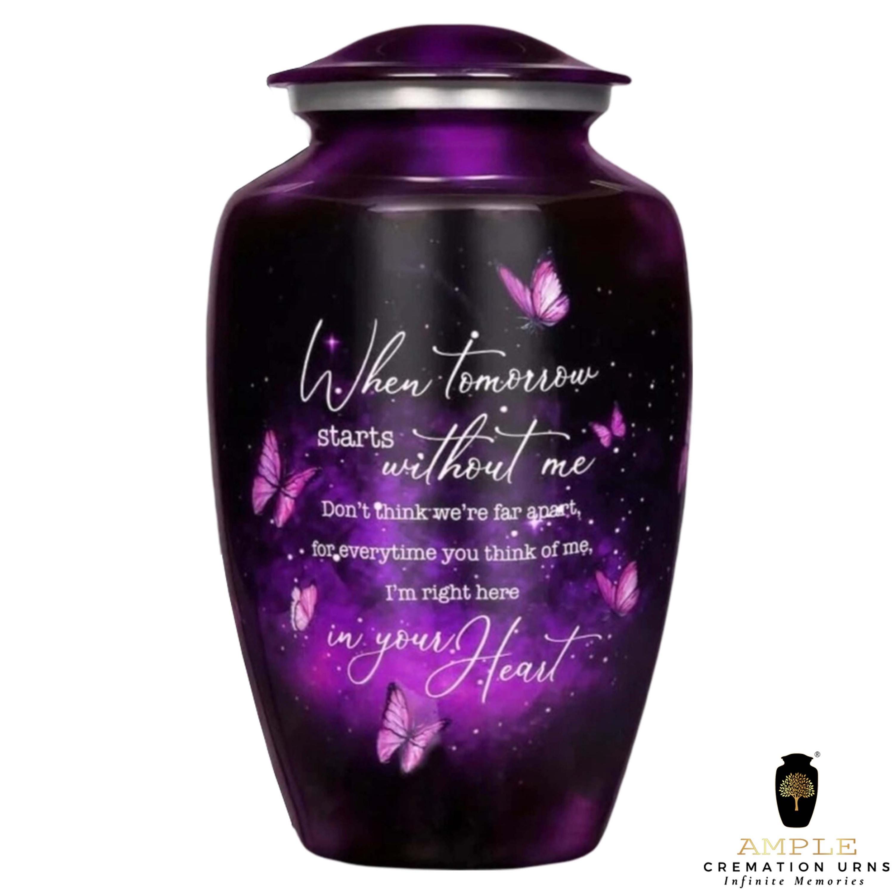 This deeply moving cremation urn features the beloved poem, "When tomorrow starts without me, don't think we're far apart, for every time you think of me, I'm right here in your heart." The comforting words are surrounded by delicate purple butterflies drifting through a celestial, violet-hued nebula. This design serves as a soulful tribute to a loved one whose spirit continues to guide and comfort those left behind.