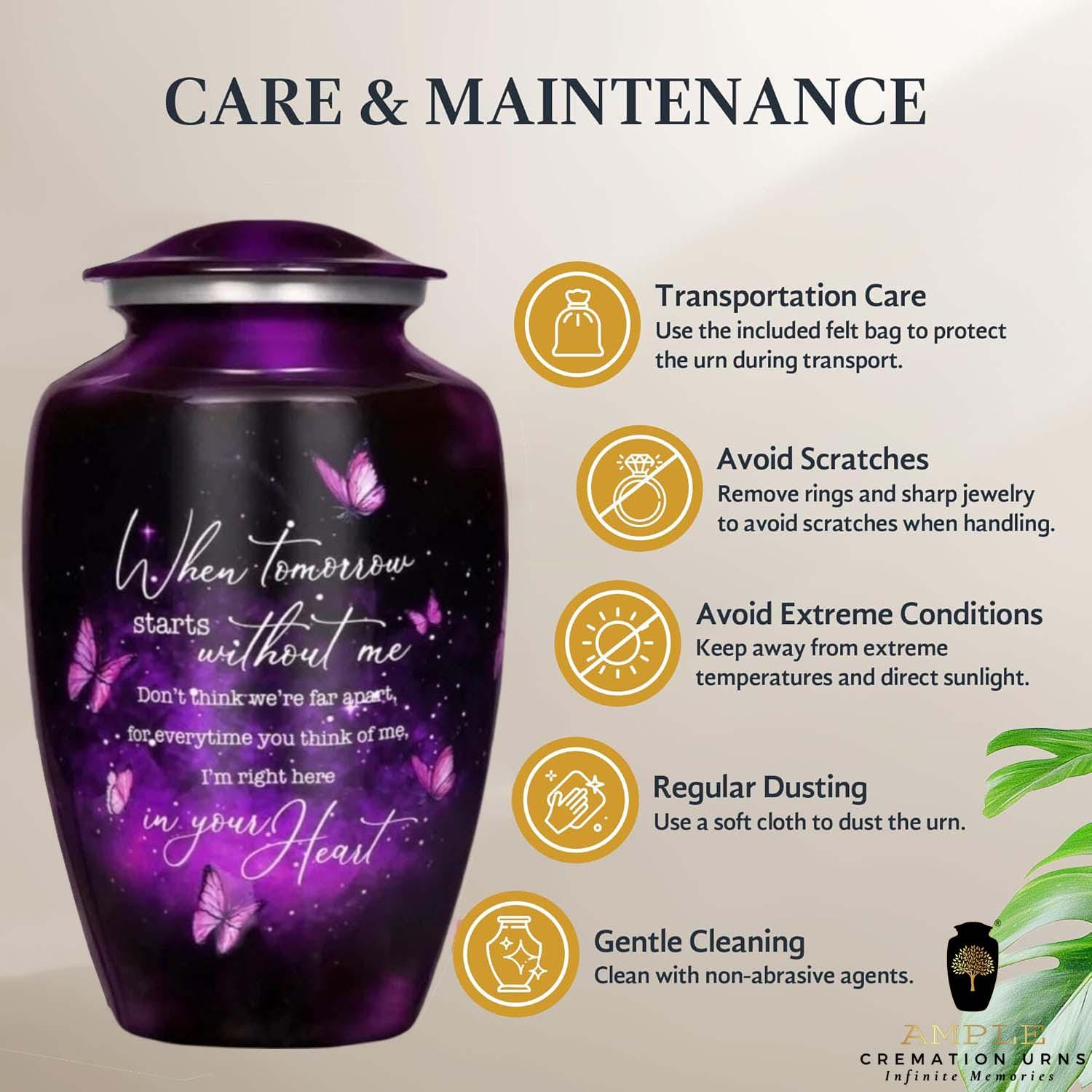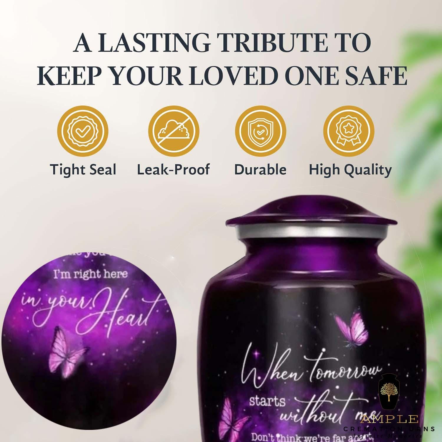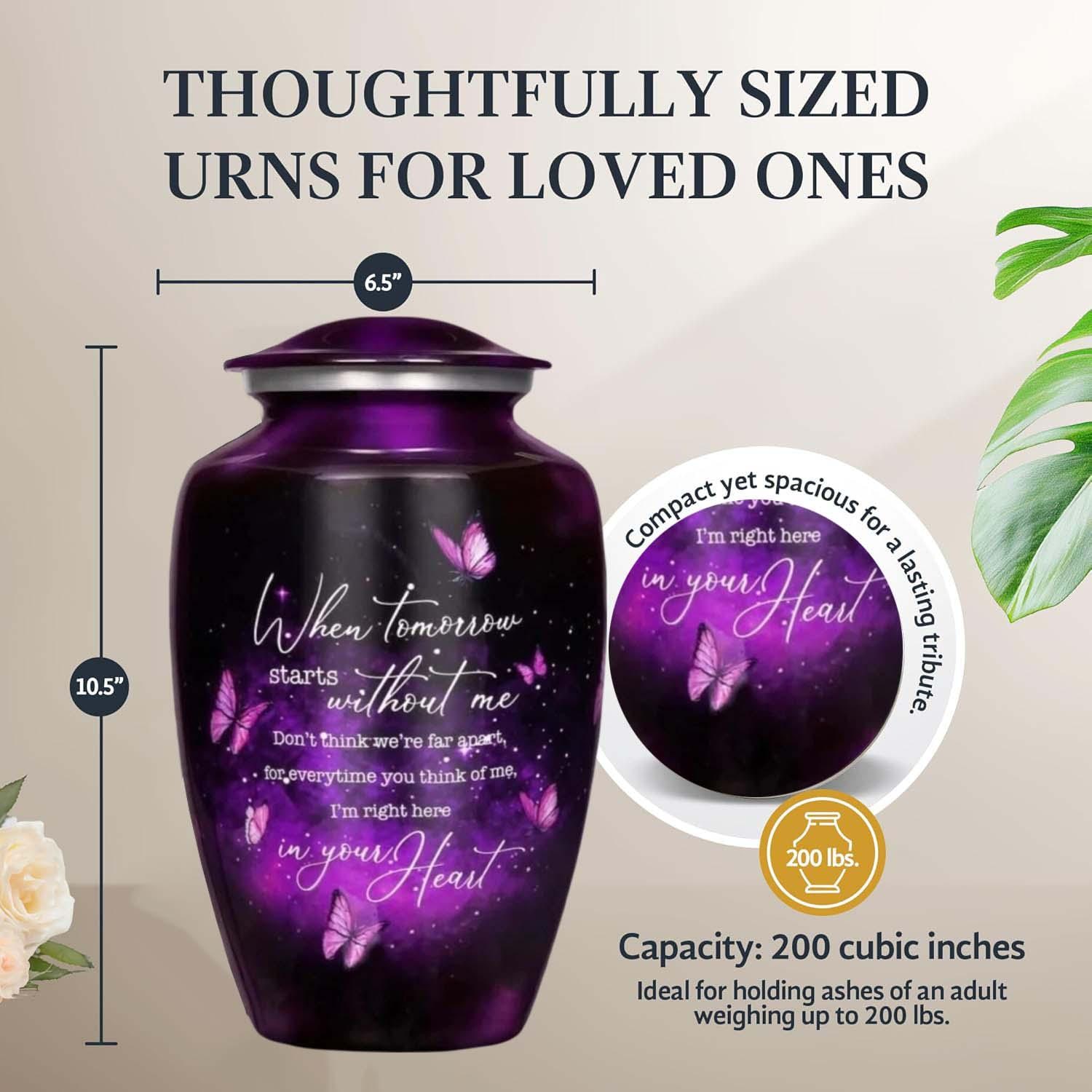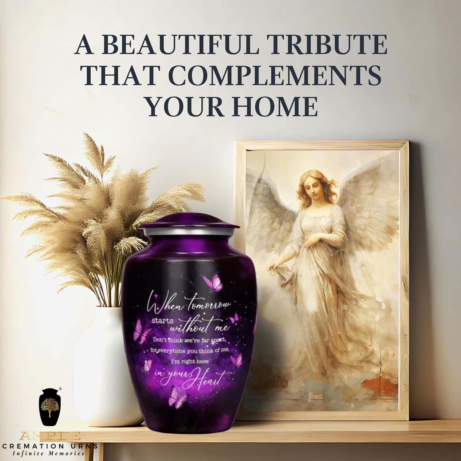 This deeply moving cremation urn features the beloved poem, "When tomorrow starts without me, don't think we're far apart, for every time you think of me, I'm right here in your heart." The comforting words are surrounded by delicate purple butterflies drifting through a celestial, violet-hued nebula. This design serves as a soulful tribute to a loved one whose spirit continues to guide and comfort those left behind.