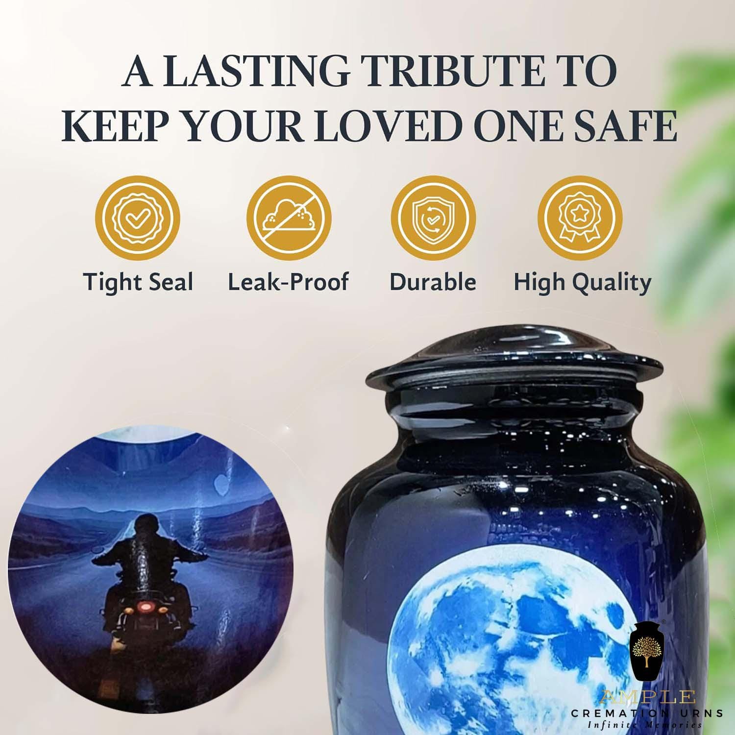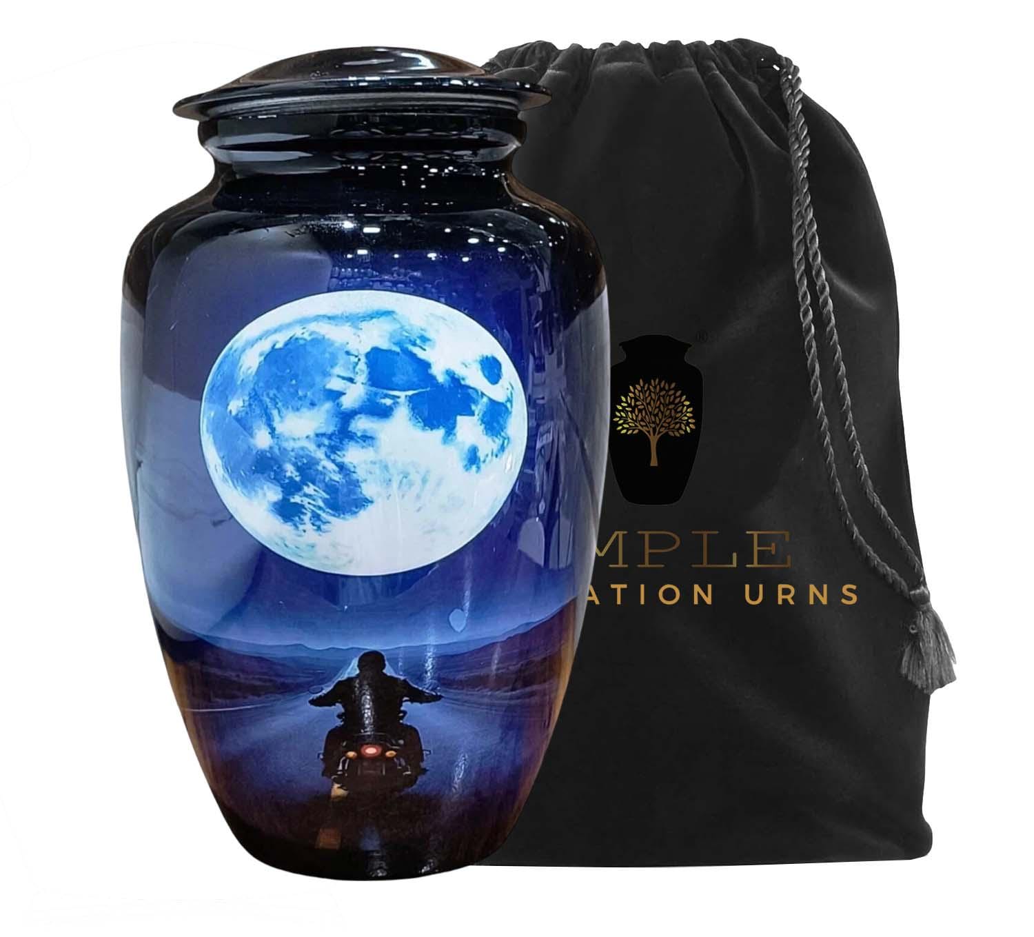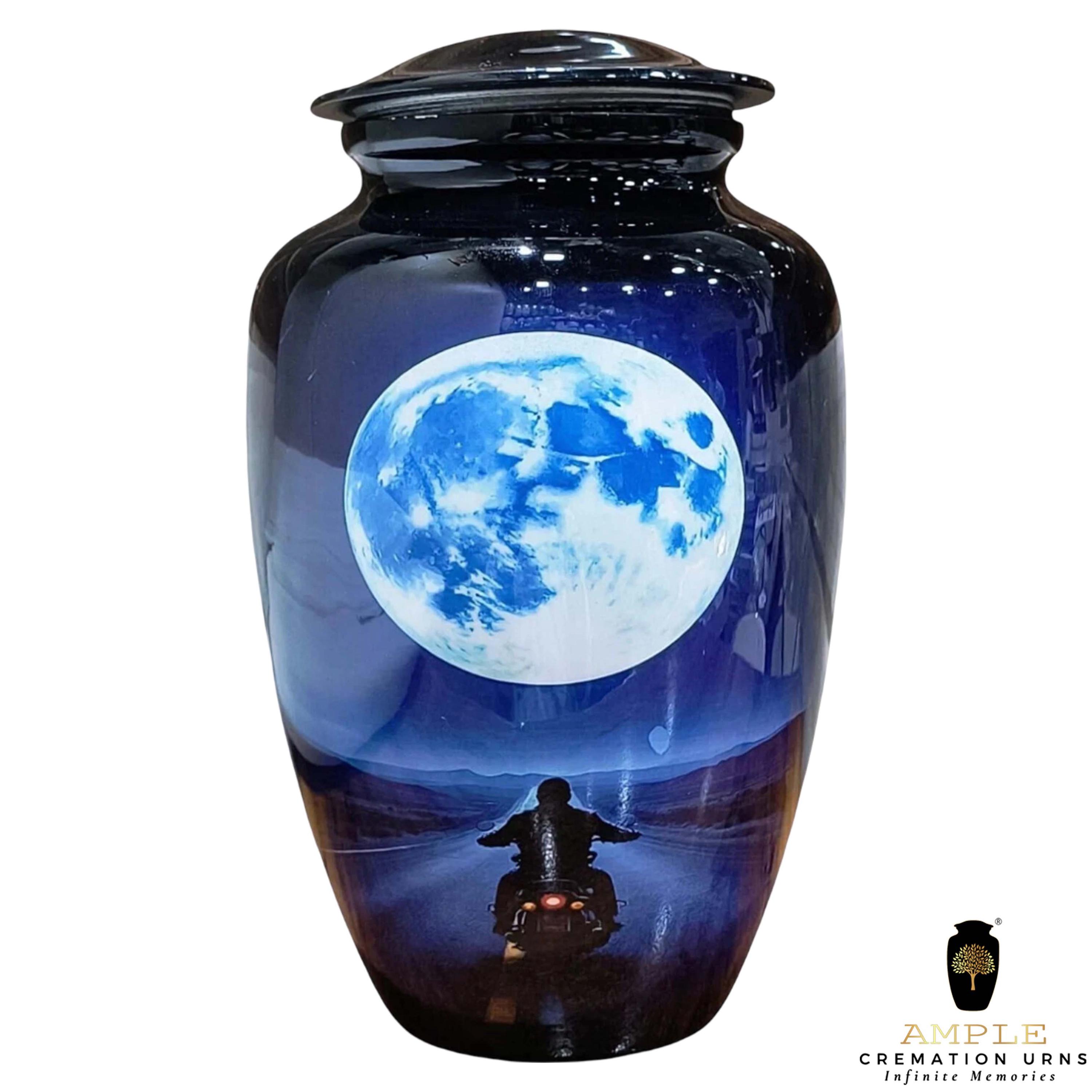 This striking cremation urn features a silhouette of a motorcyclist riding toward a vast, glowing full moon. Set against a deep midnight blue and purple landscape, the imagery represents the final journey into the horizon—a perfect tribute for a biker, adventurer, or anyone who loved the thrill of the ride. The high-gloss finish provides a brilliant, reflective surface that enhances the cinematic detail of the moonlight and the open highway.