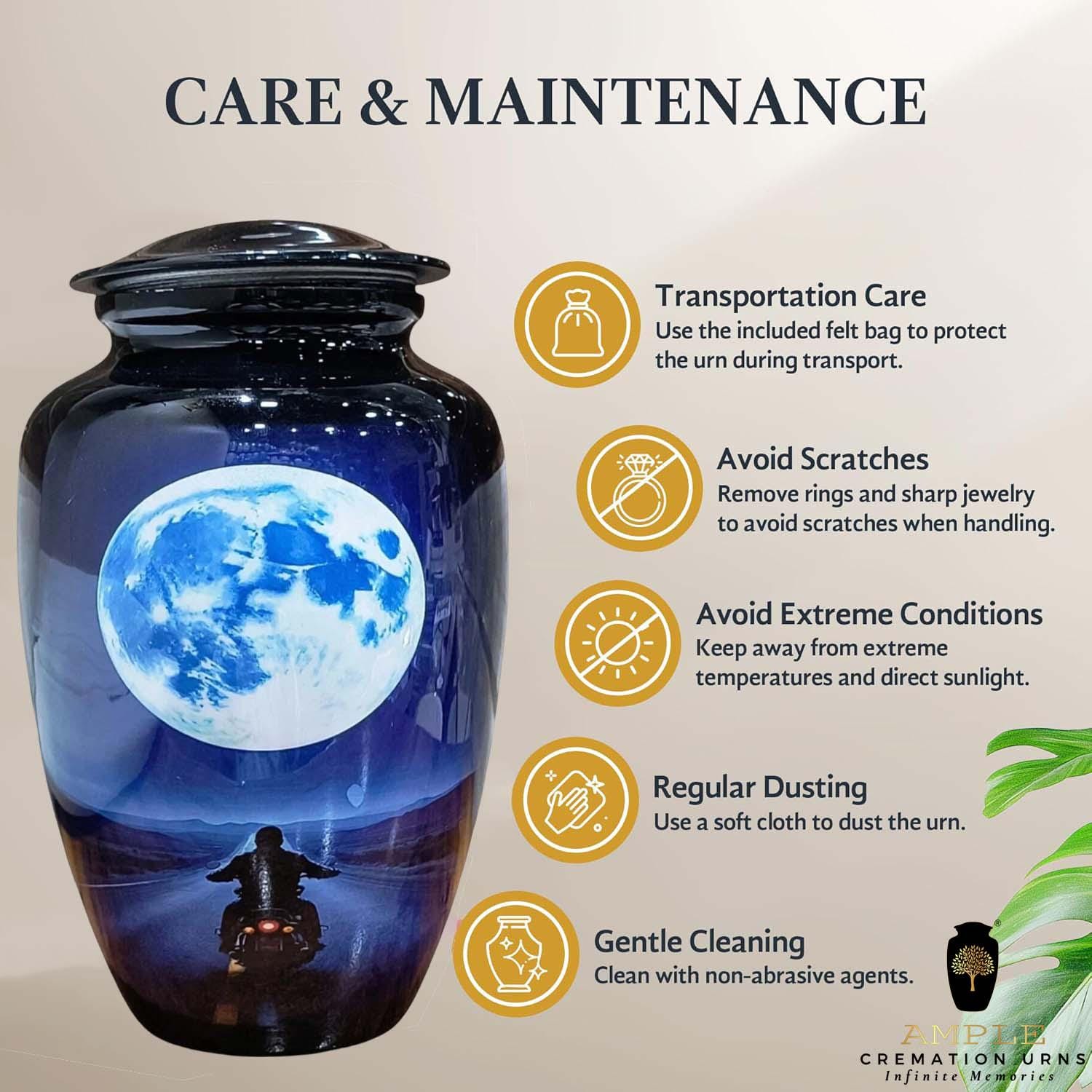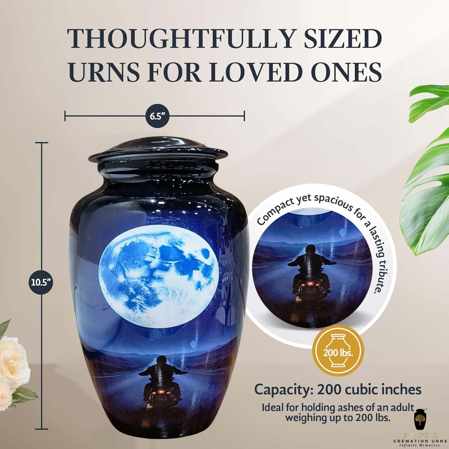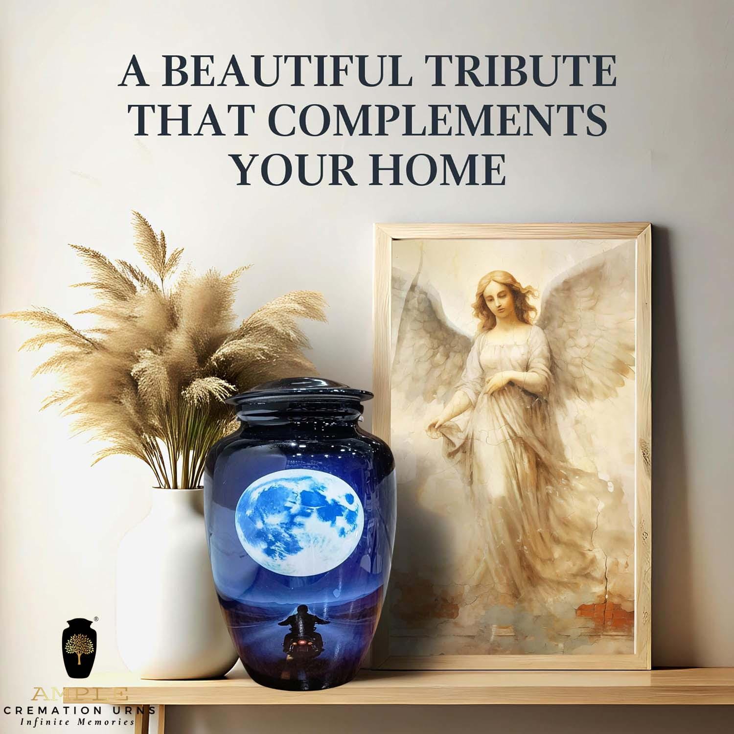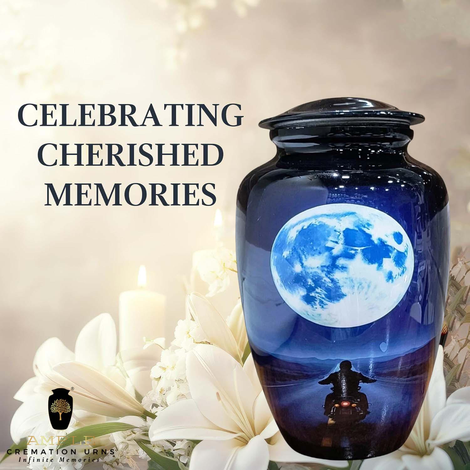 This striking cremation urn features a silhouette of a motorcyclist riding toward a vast, glowing full moon. Set against a deep midnight blue and purple landscape, the imagery represents the final journey into the horizon—a perfect tribute for a biker, adventurer, or anyone who loved the thrill of the ride. The high-gloss finish provides a brilliant, reflective surface that enhances the cinematic detail of the moonlight and the open highway.