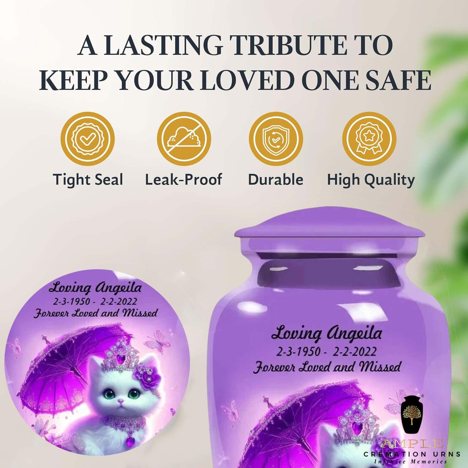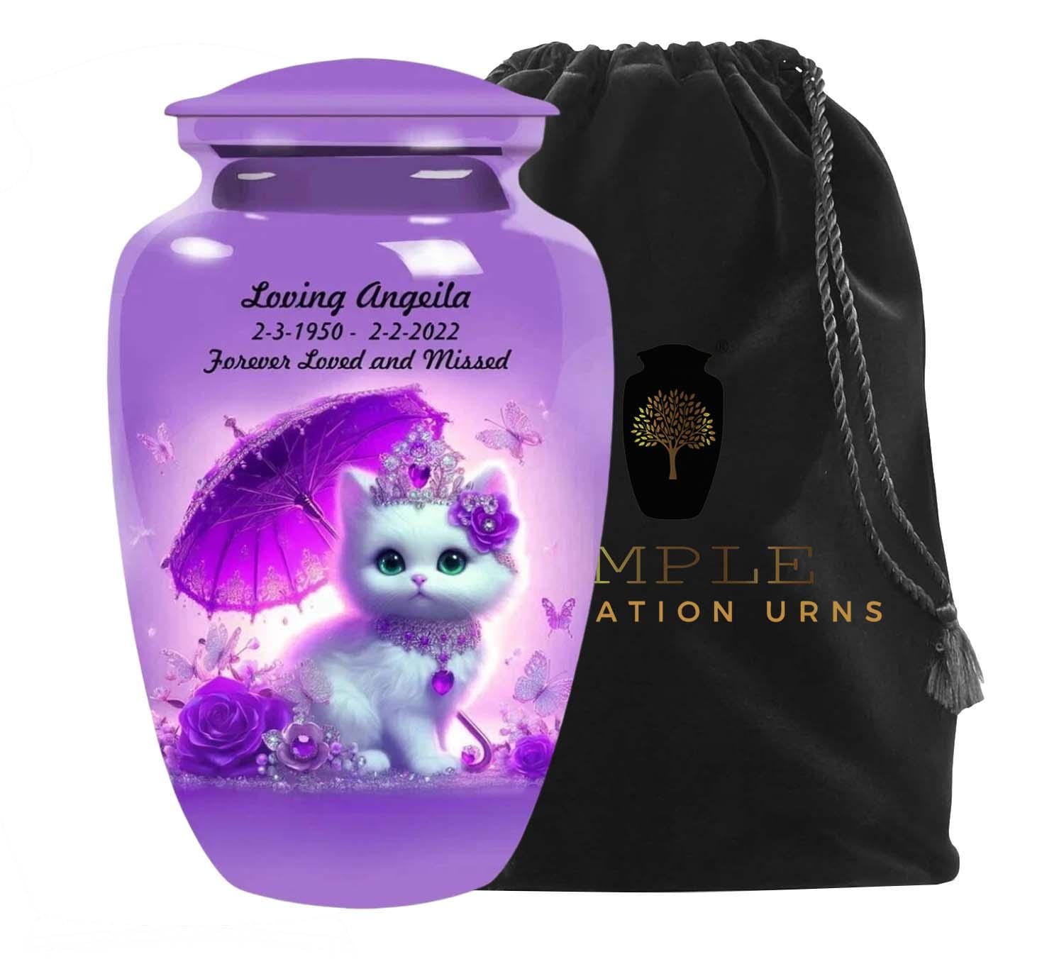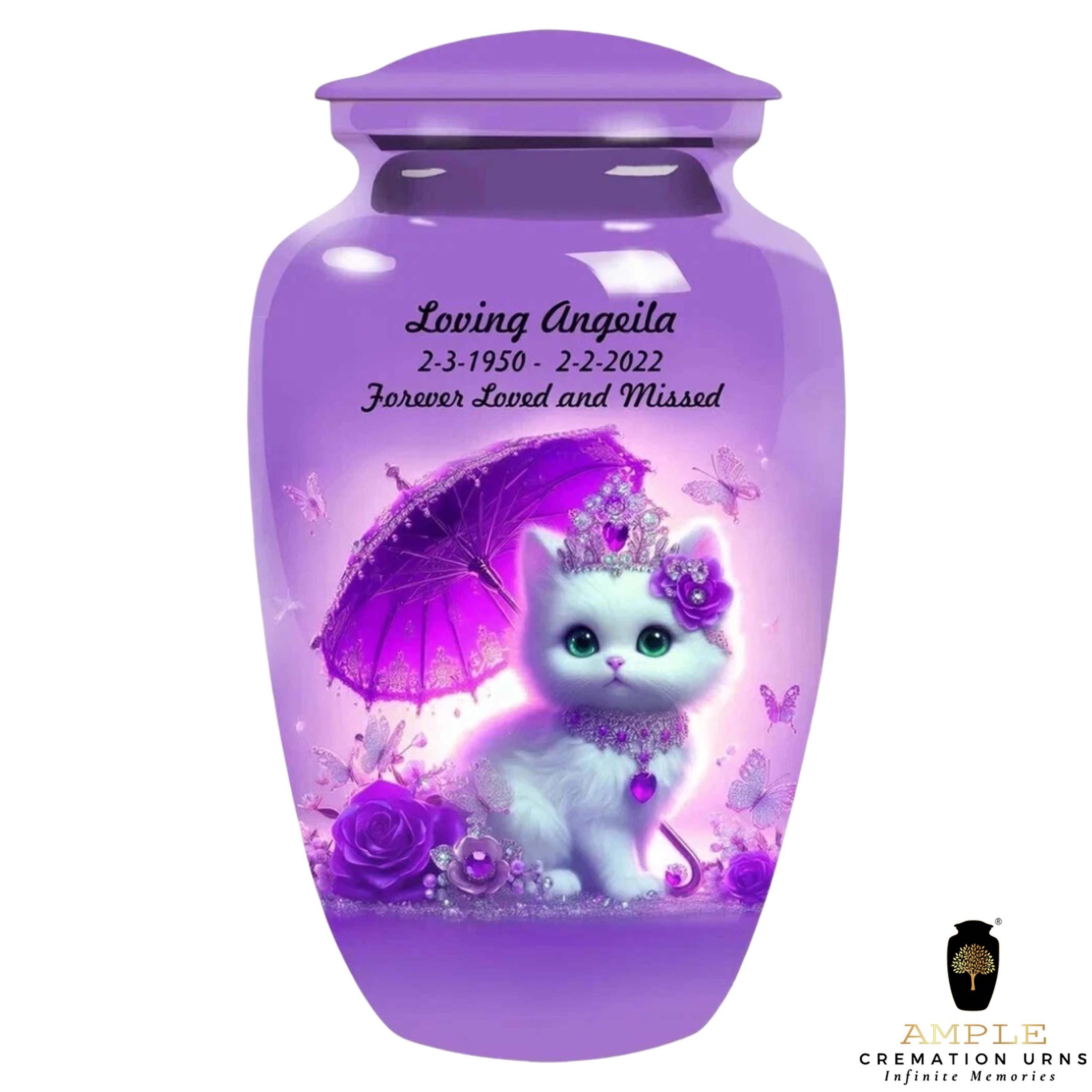 This enchanting purple urn features a sweet, fluffy white kitten adorned with a jeweled tiara and collar, resting beneath a lace-trimmed purple parasol. Surrounded by blooming roses and delicate butterflies, the imagery evokes a sense of charm, innocence, and royal elegance. It is a perfect tribute for a cat lover or anyone who appreciated the playful and precious things in life.