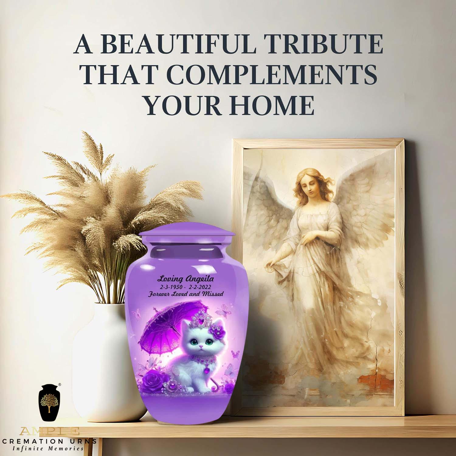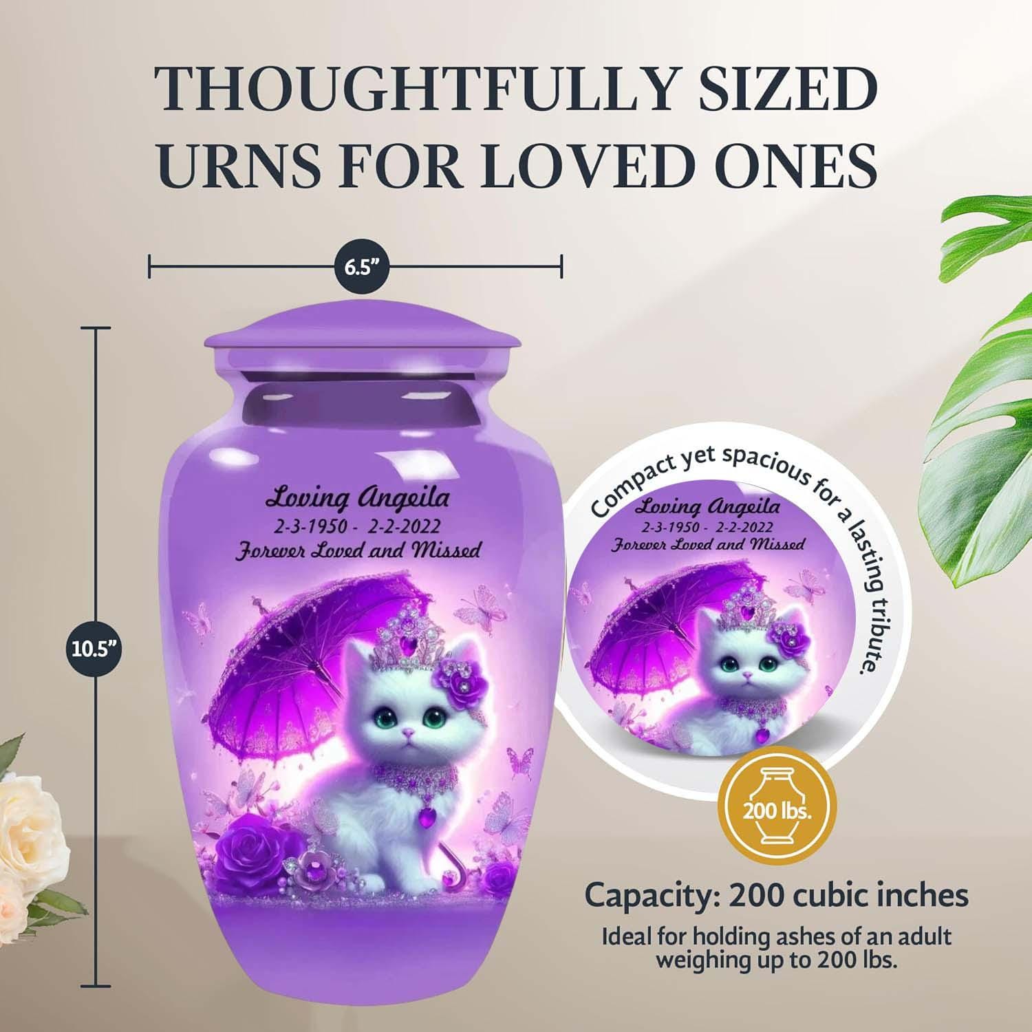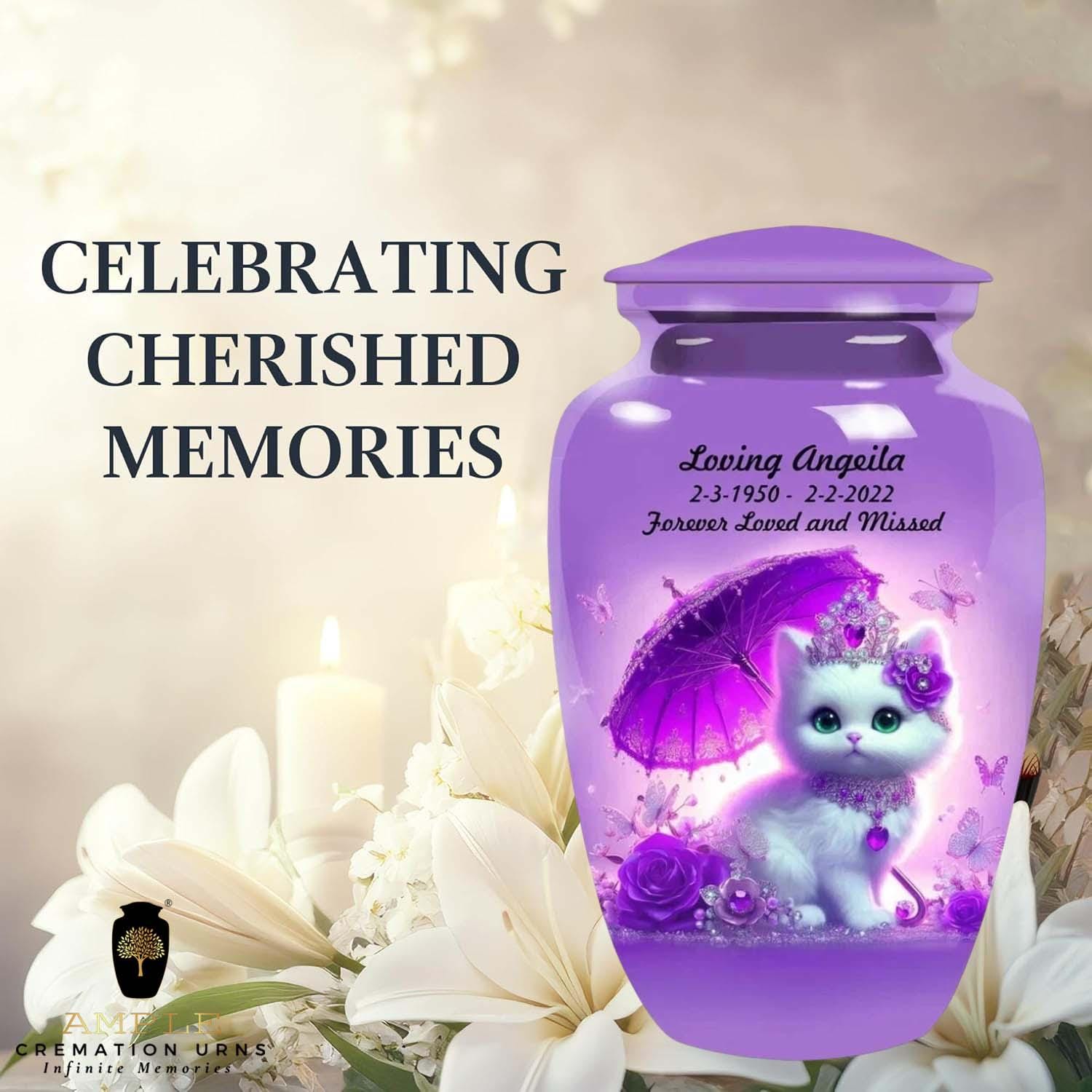This enchanting purple urn features a sweet, fluffy white kitten adorned with a jeweled tiara and collar, resting beneath a lace-trimmed purple parasol. Surrounded by blooming roses and delicate butterflies, the imagery evokes a sense of charm, innocence, and royal elegance. It is a perfect tribute for a cat lover or anyone who appreciated the playful and precious things in life.