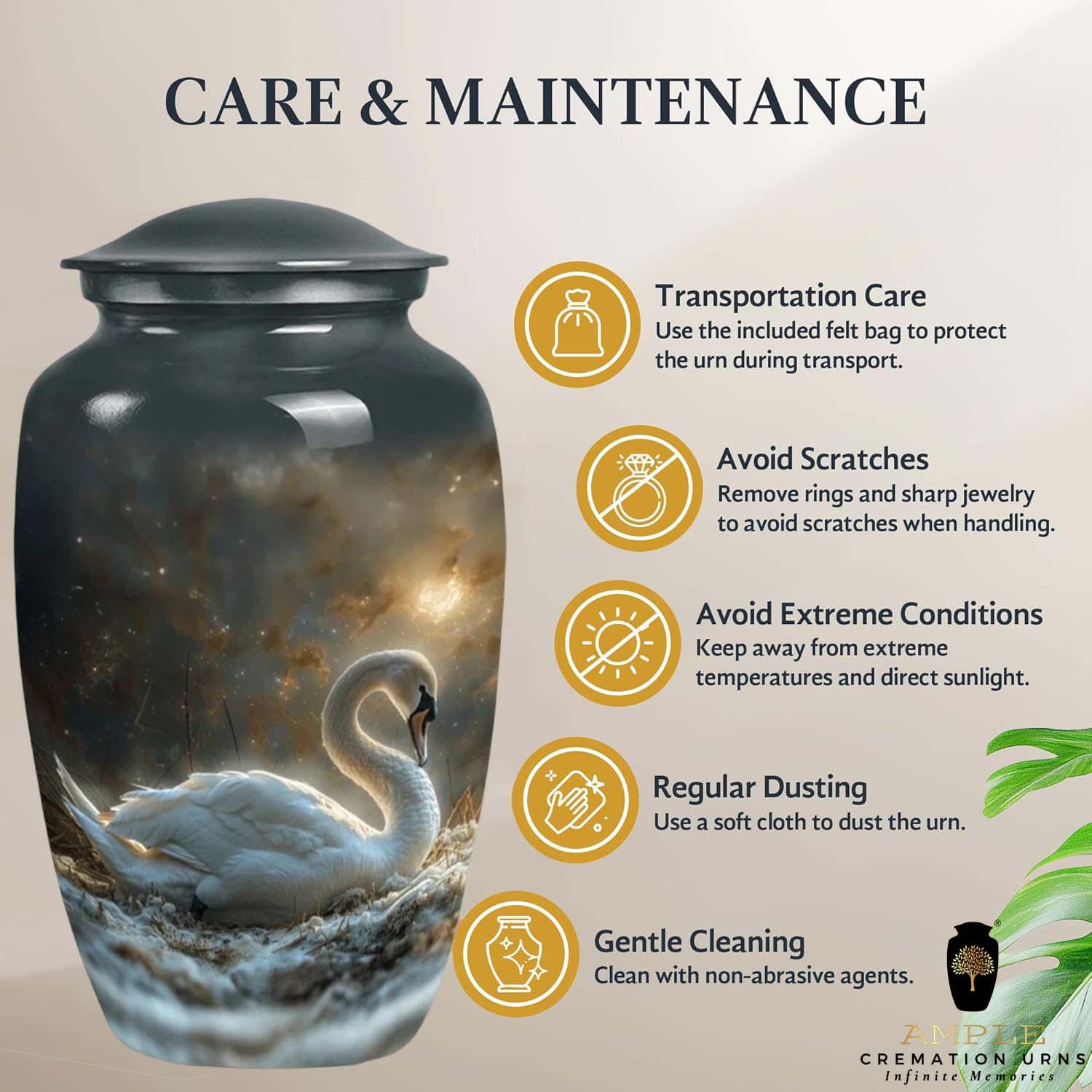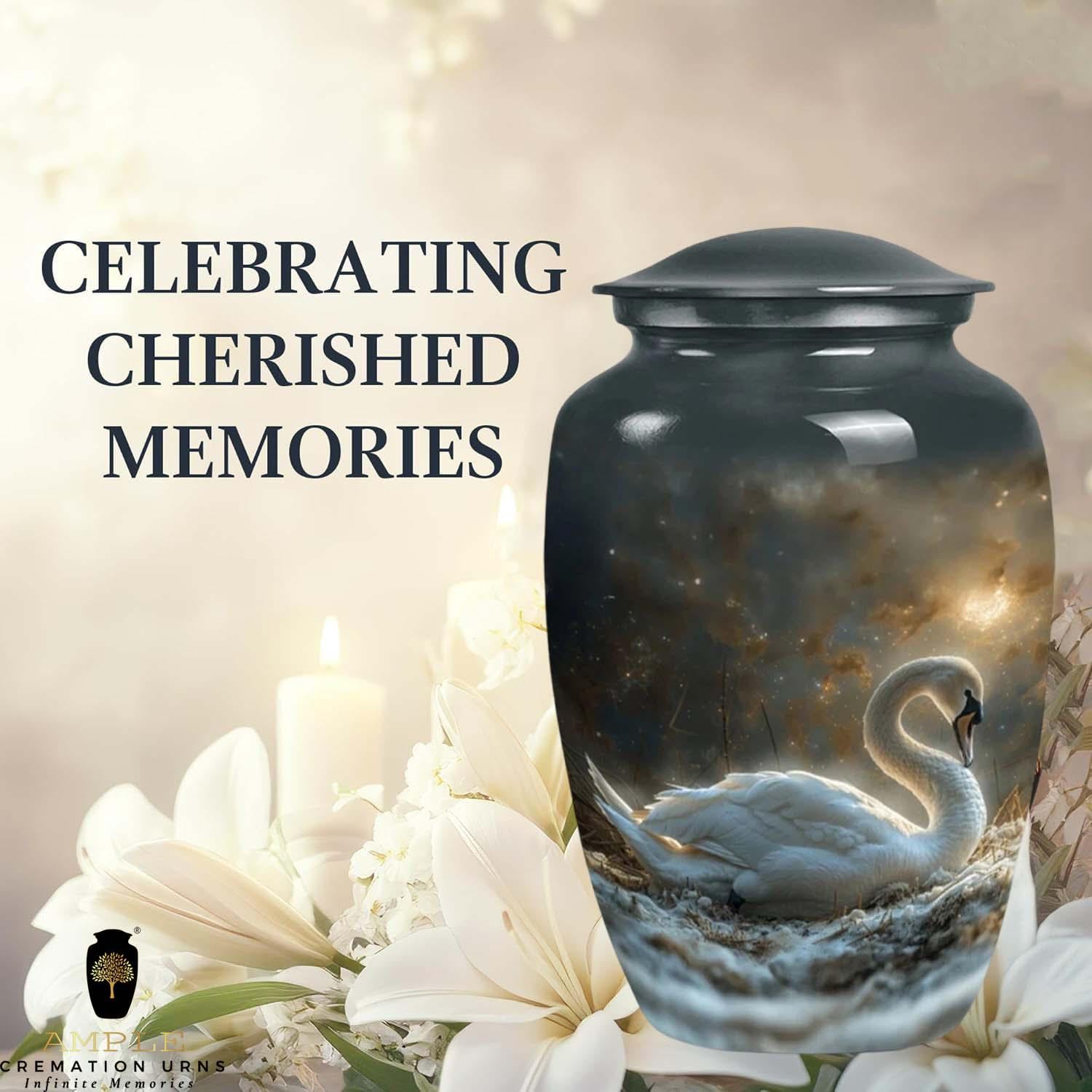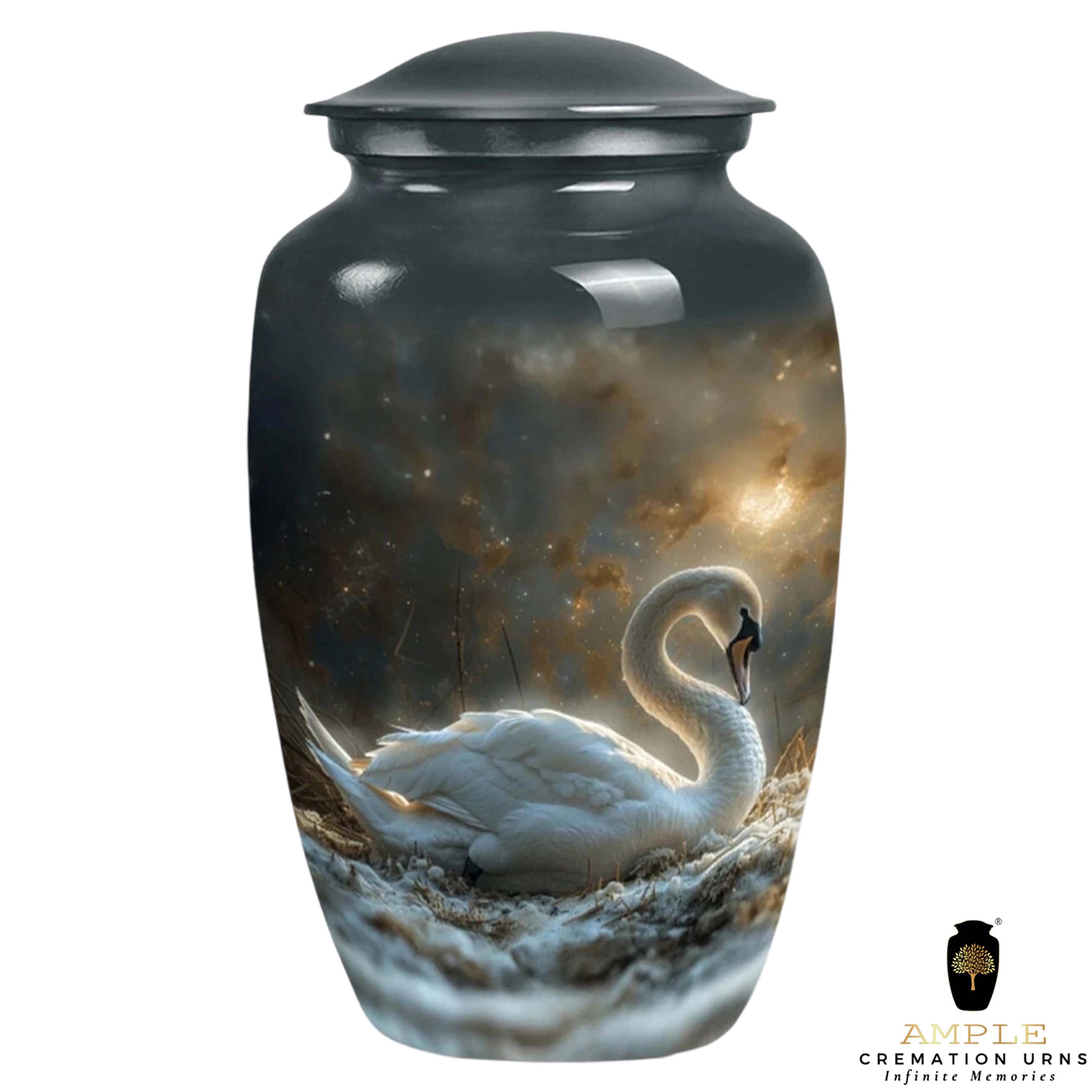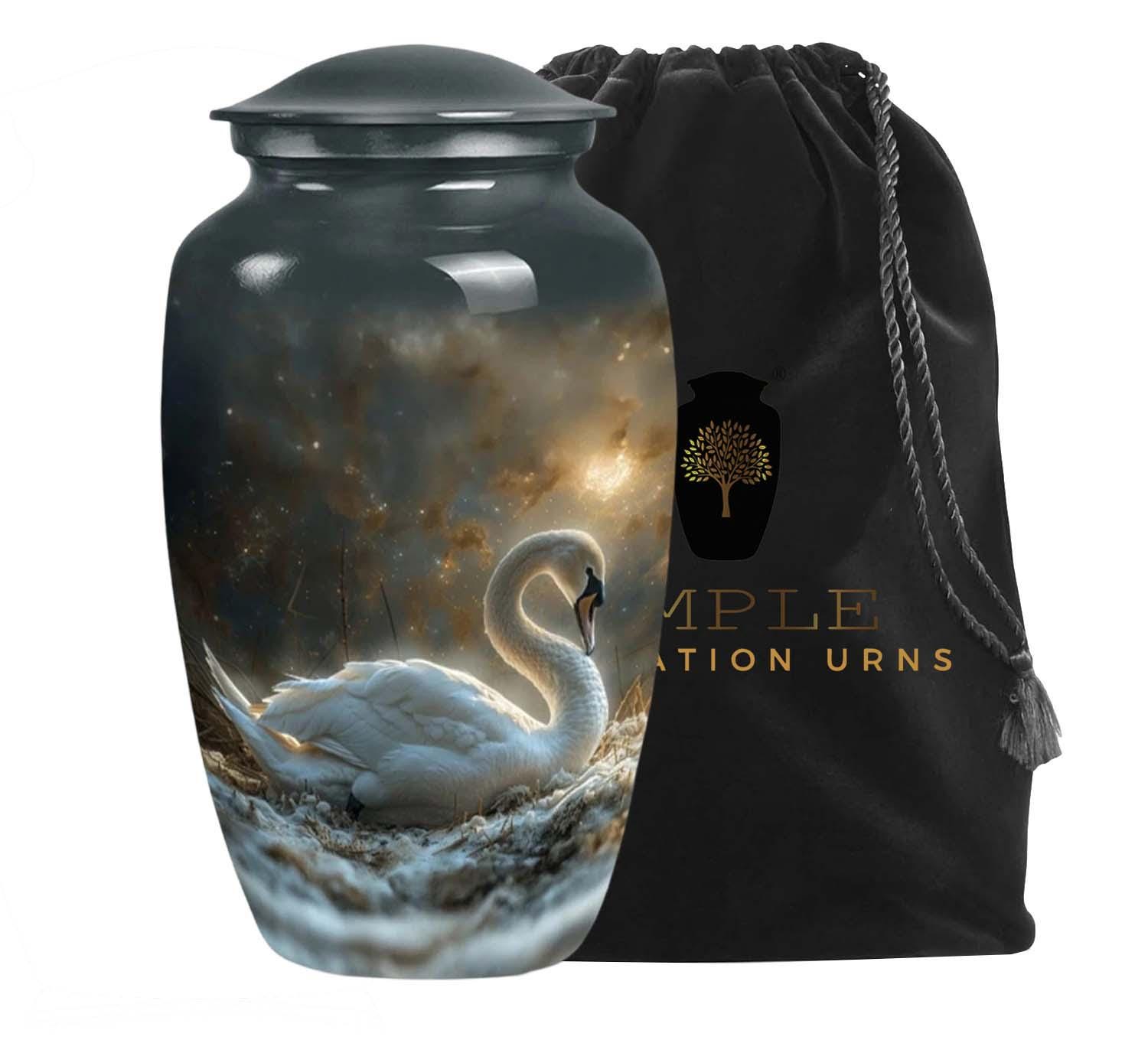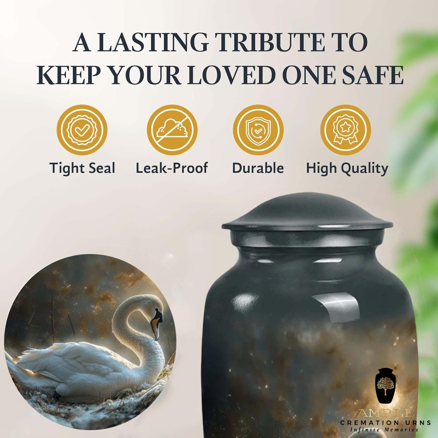 The urn is finished with a premium high-gloss protective coating that enhances the contrast between the luminous swan and the dark, cosmic background. Crafted from durable high-grade metal alloy, it is designed to be a lasting sanctuary and a dignified centerpiece for any memorial service or home display.