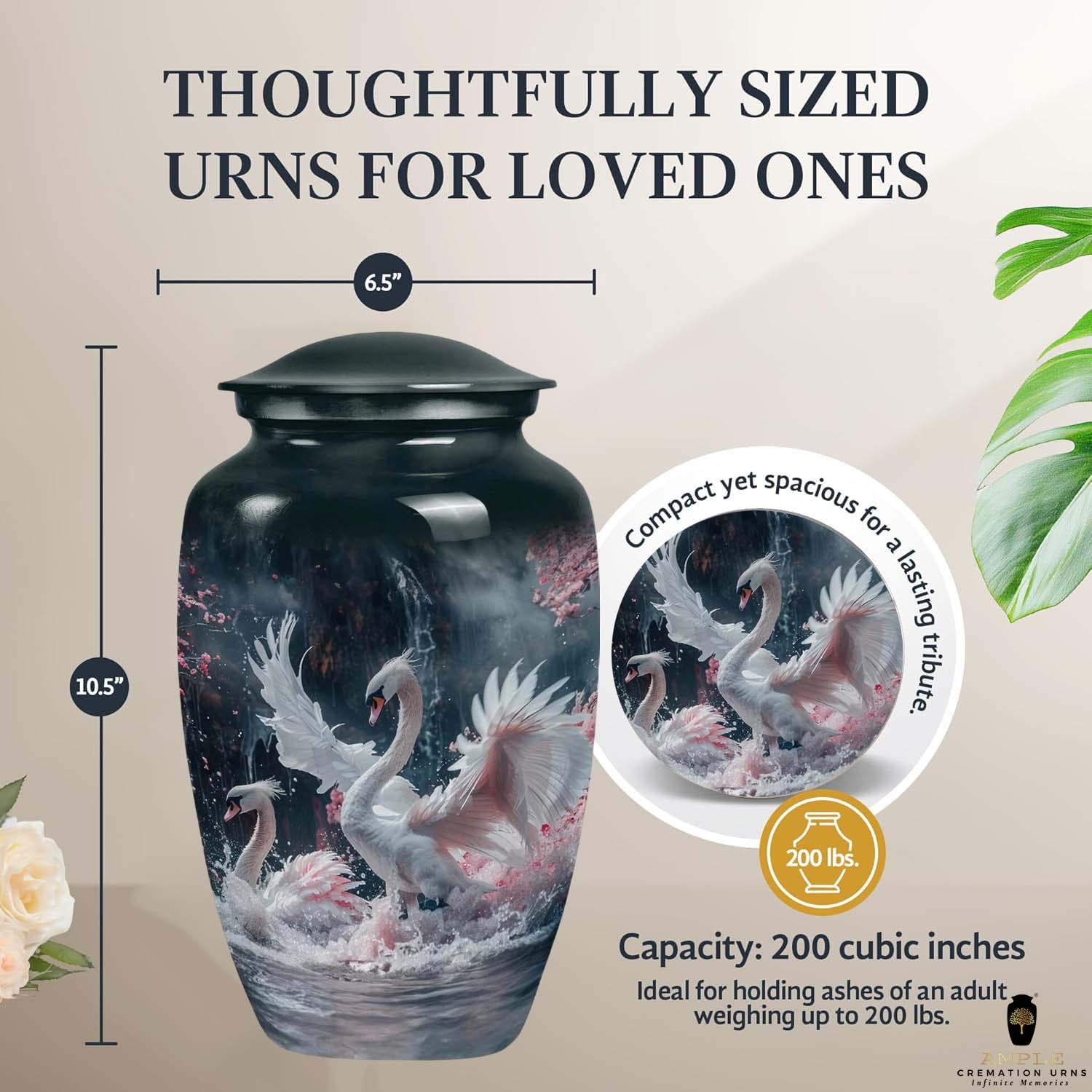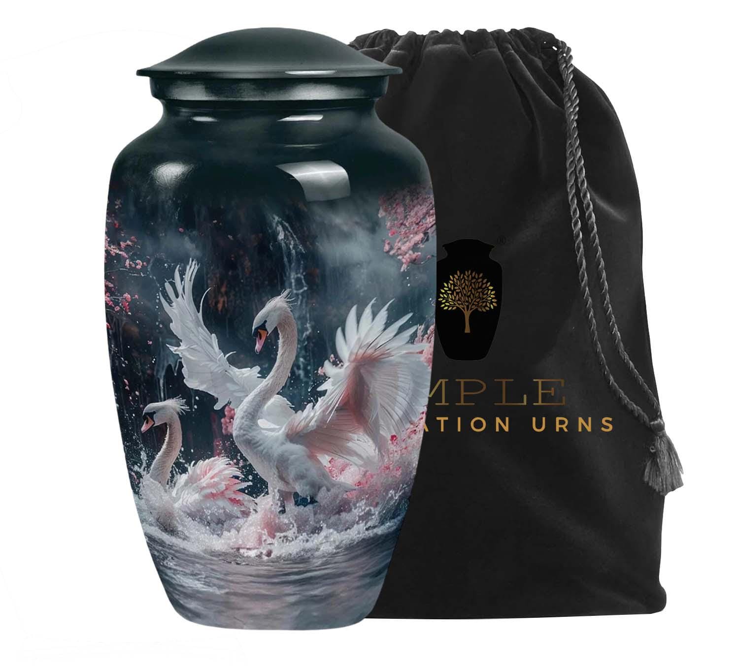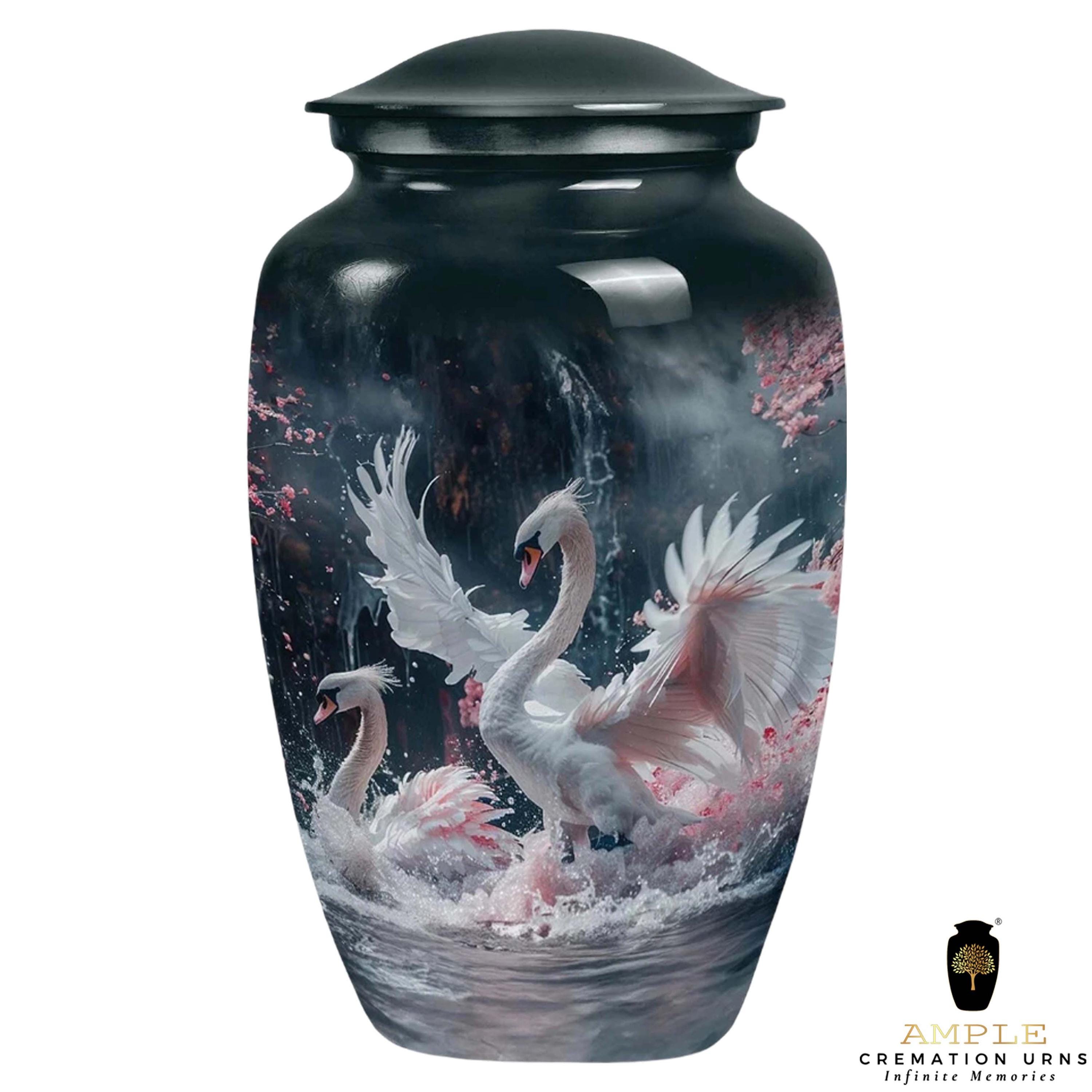 This enchanting cremation urn depicts a pair of majestic white swans dancing amidst the mist of a hidden waterfall. Surrounded by delicate pink cherry blossoms and cool blue waters, the scene captures a moment of pure, ethereal grace. The swan, a symbol of eternal love and transformation, paired with the renewal of spring blossoms, makes this a deeply poetic tribute to a cherished soul.