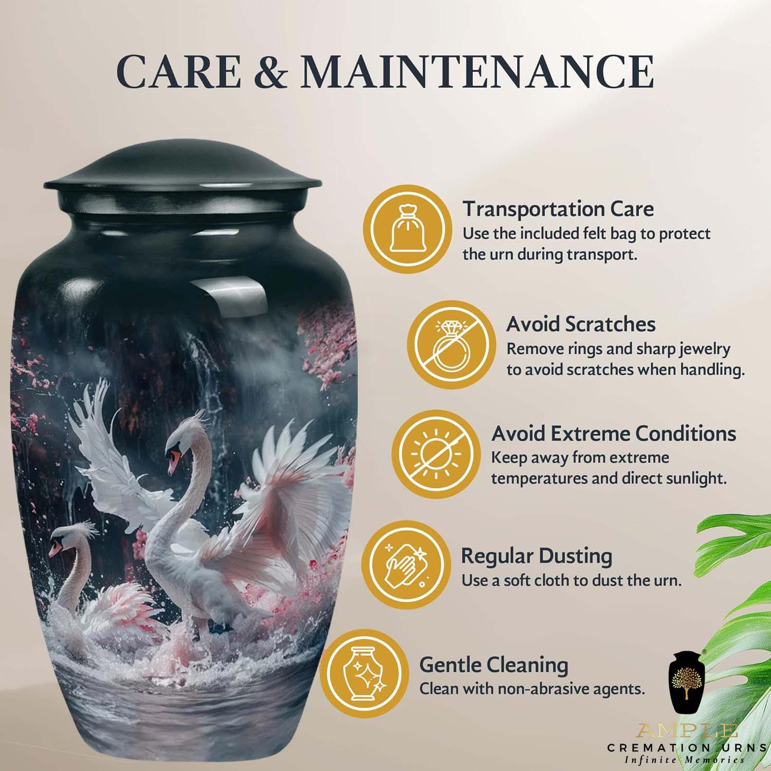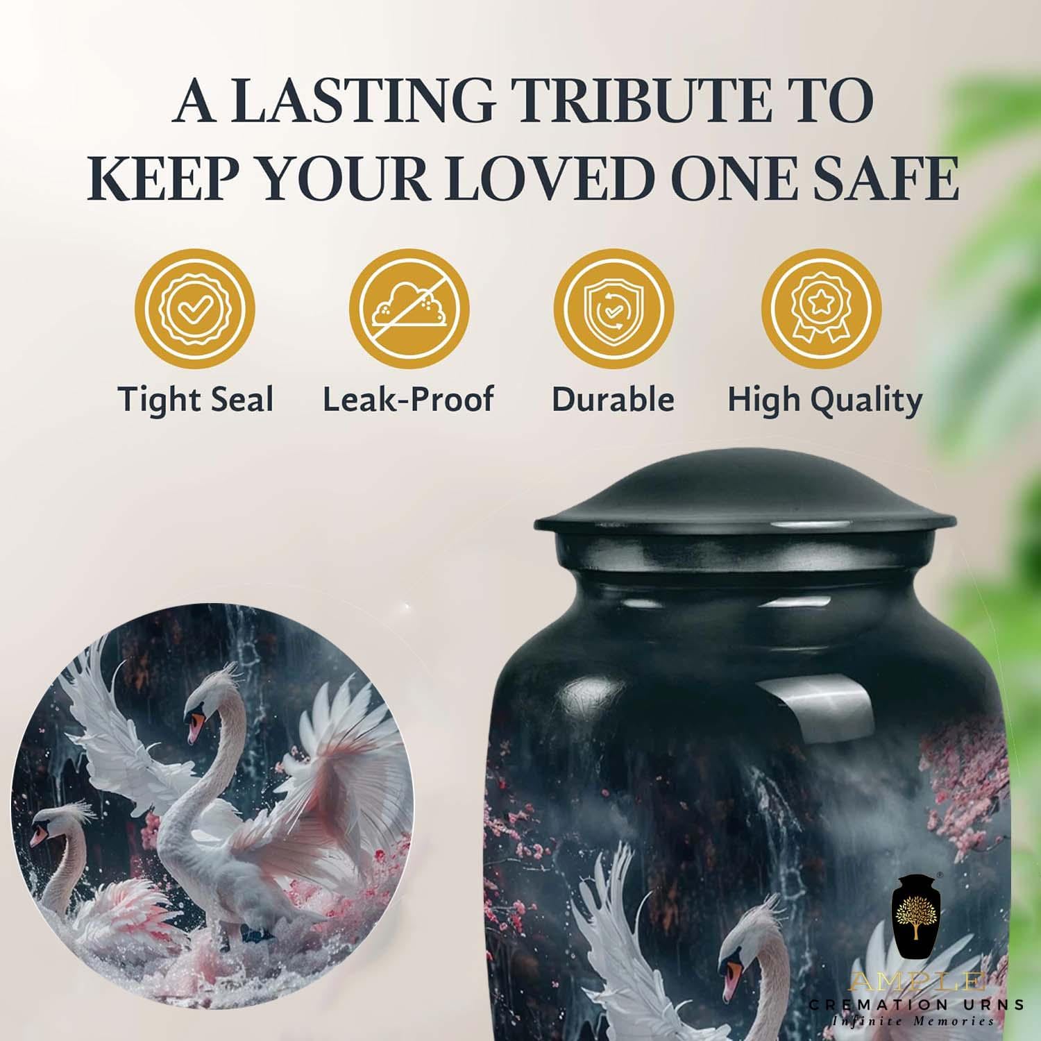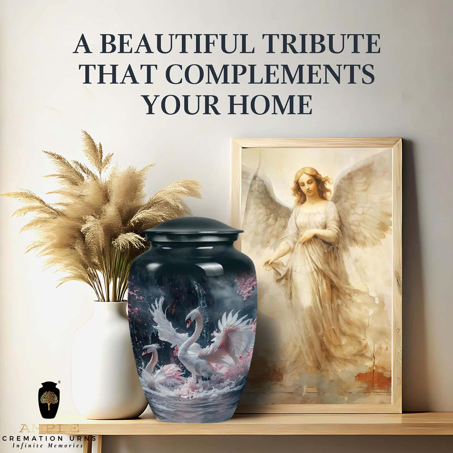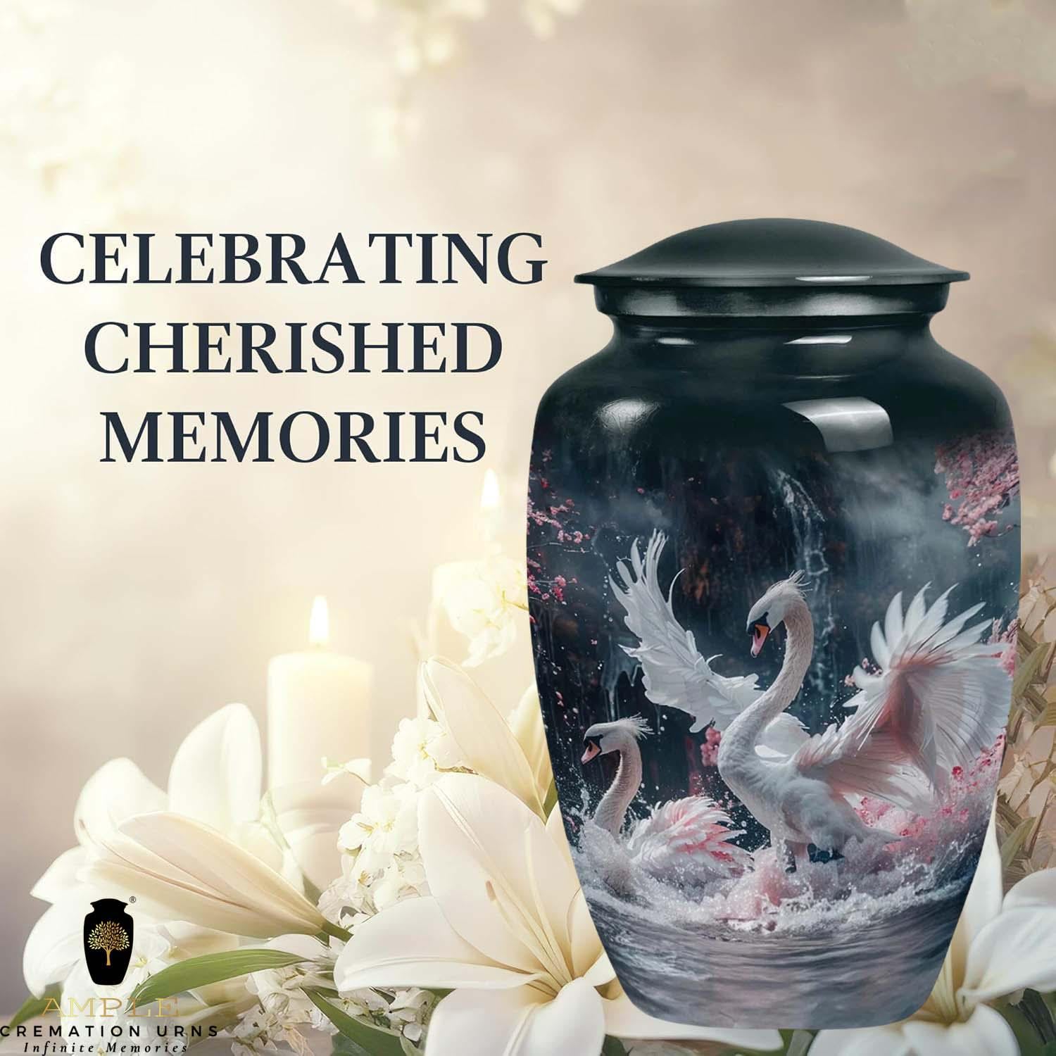 This enchanting cremation urn depicts a pair of majestic white swans dancing amidst the mist of a hidden waterfall. Surrounded by delicate pink cherry blossoms and cool blue waters, the scene captures a moment of pure, ethereal grace. The swan, a symbol of eternal love and transformation, paired with the renewal of spring blossoms, makes this a deeply poetic tribute to a cherished soul.