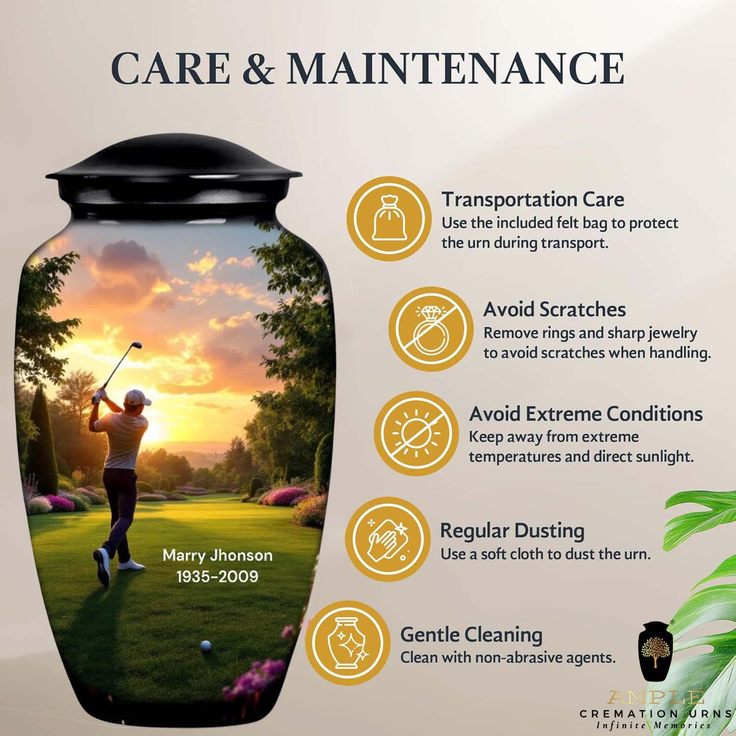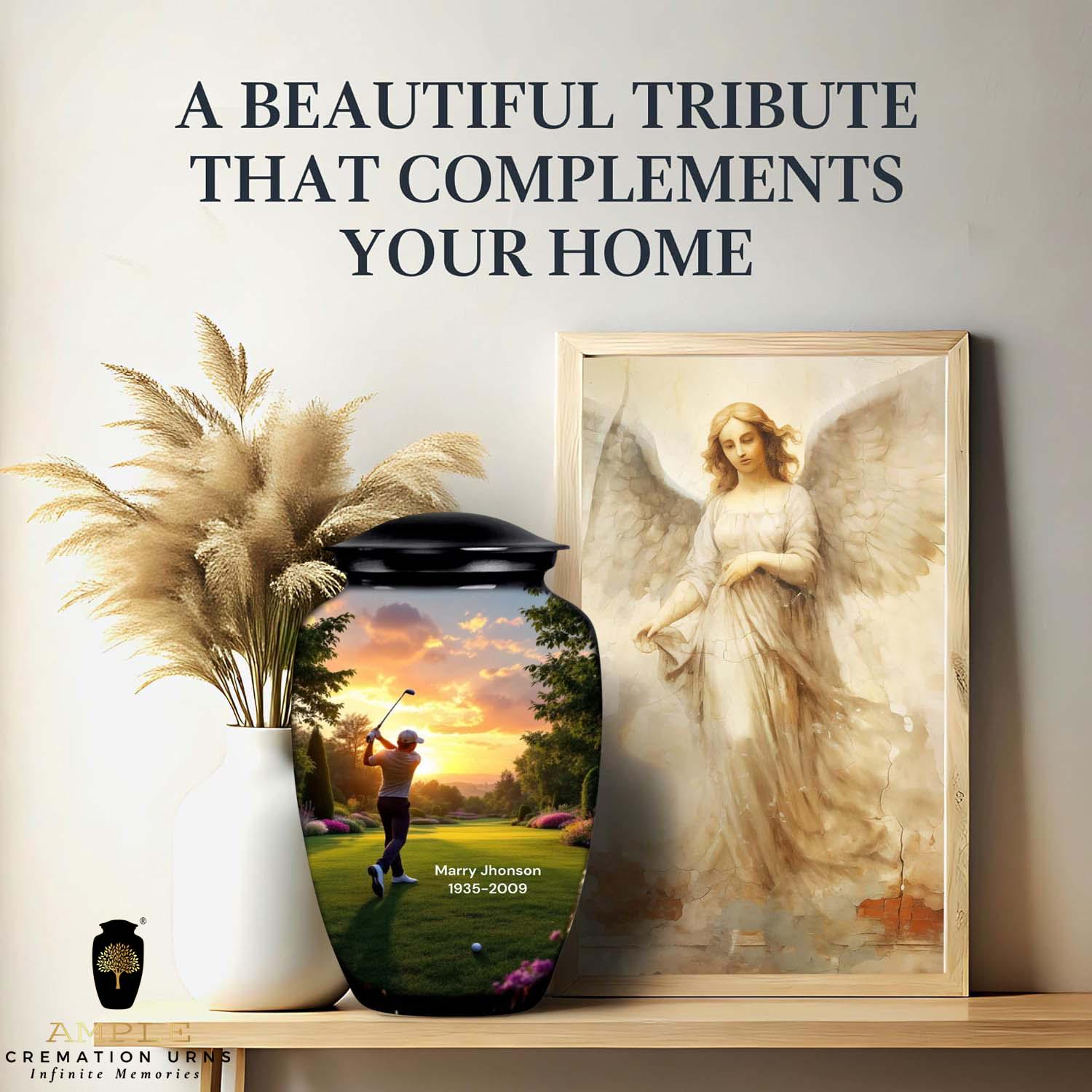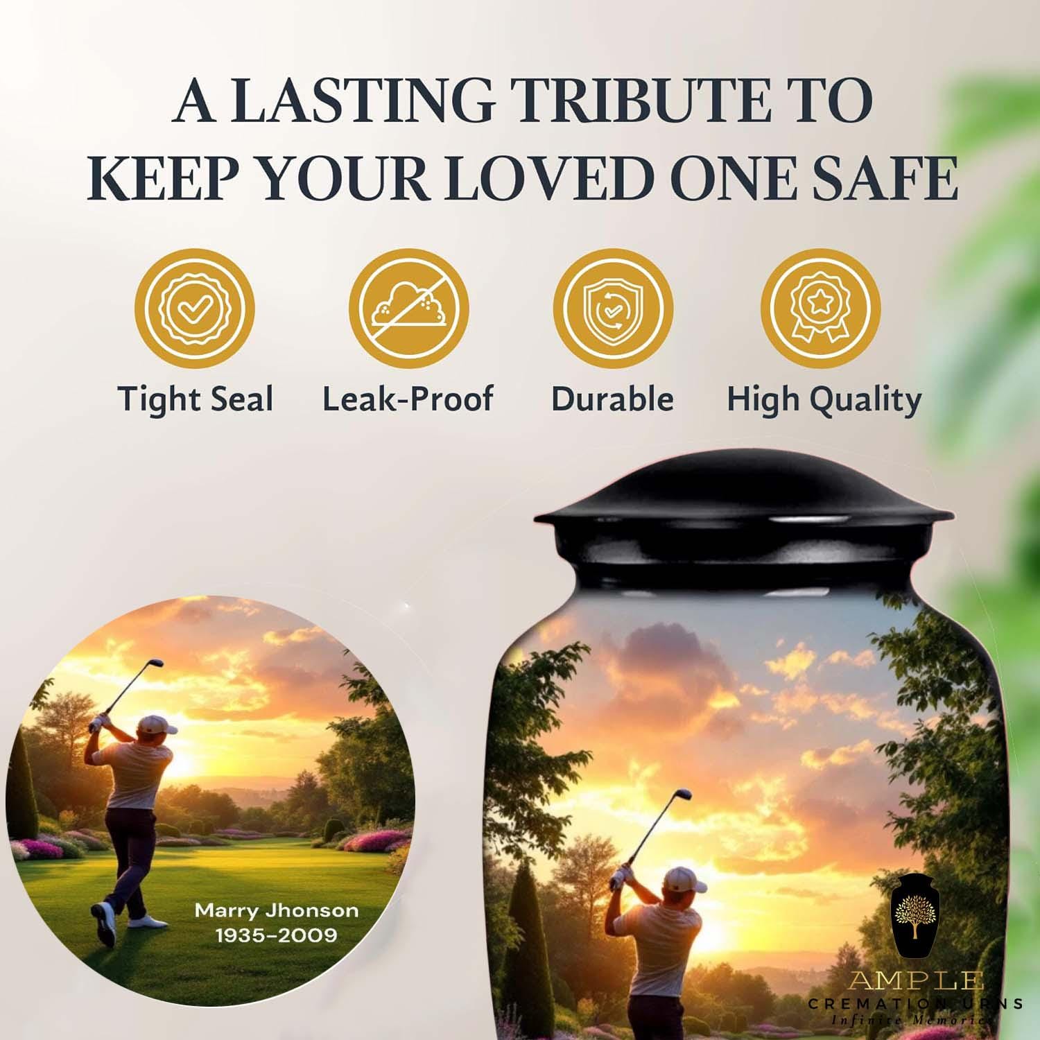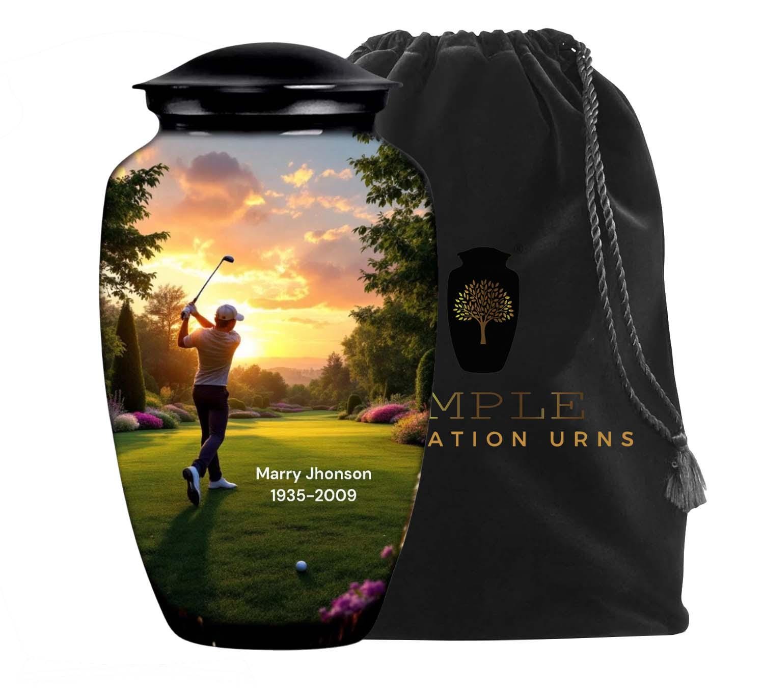 Crafted from premium high-grade metal alloy, the urn is finished with a brilliant high-gloss protective coating that preserves the vibrant colors of the landscape. It serves as a dignified and heartfelt resting place for someone who found their greatest joy and peace on the golf course.