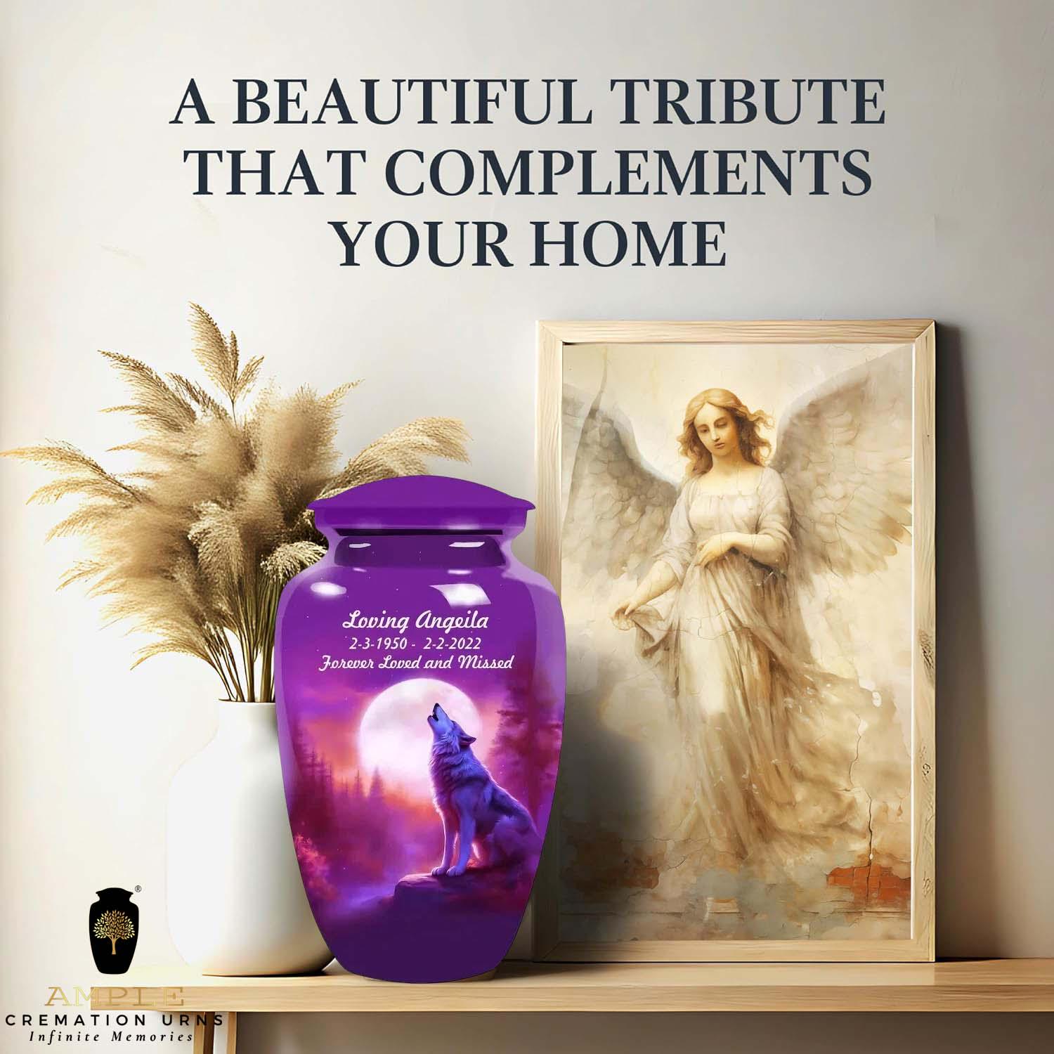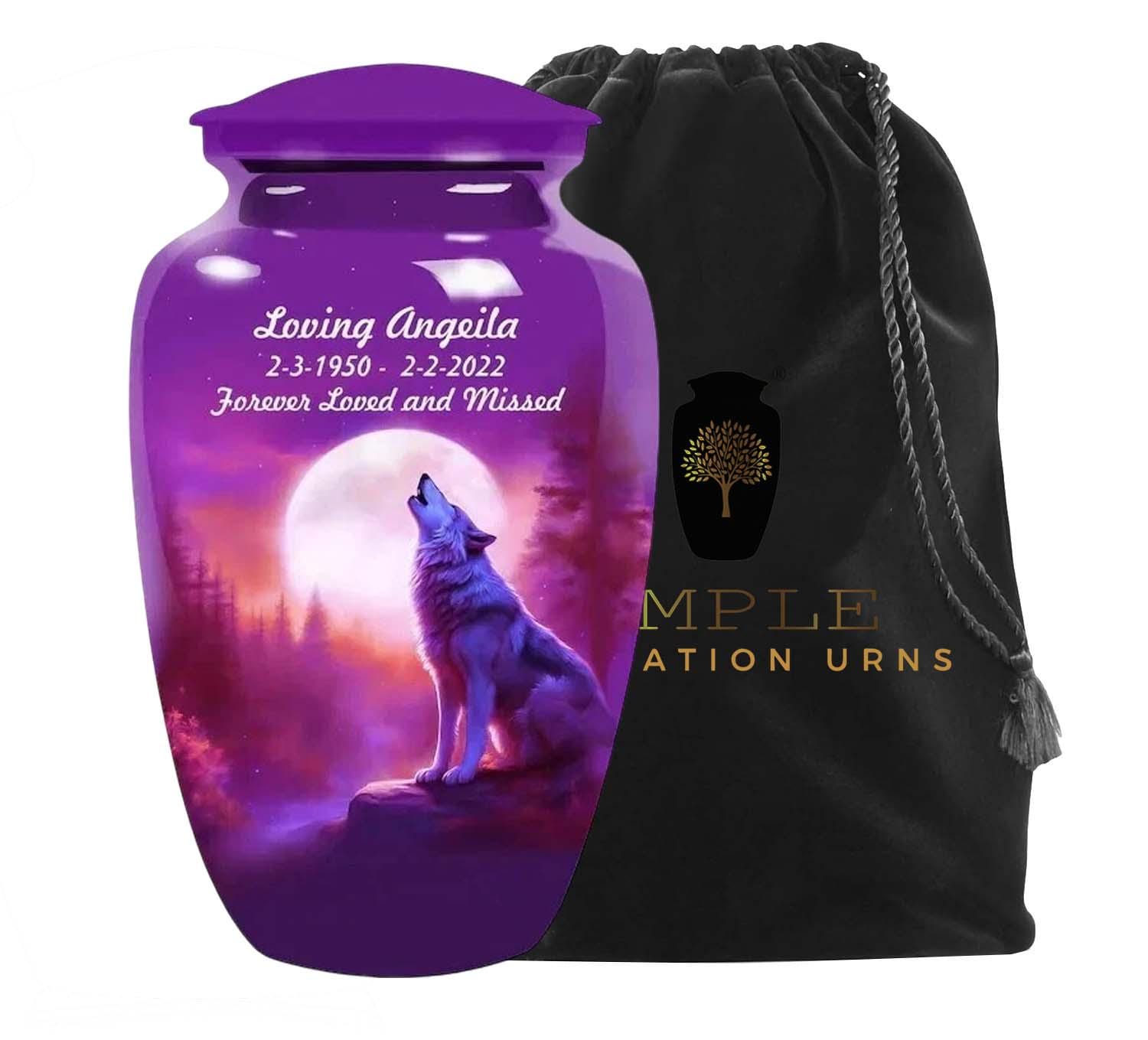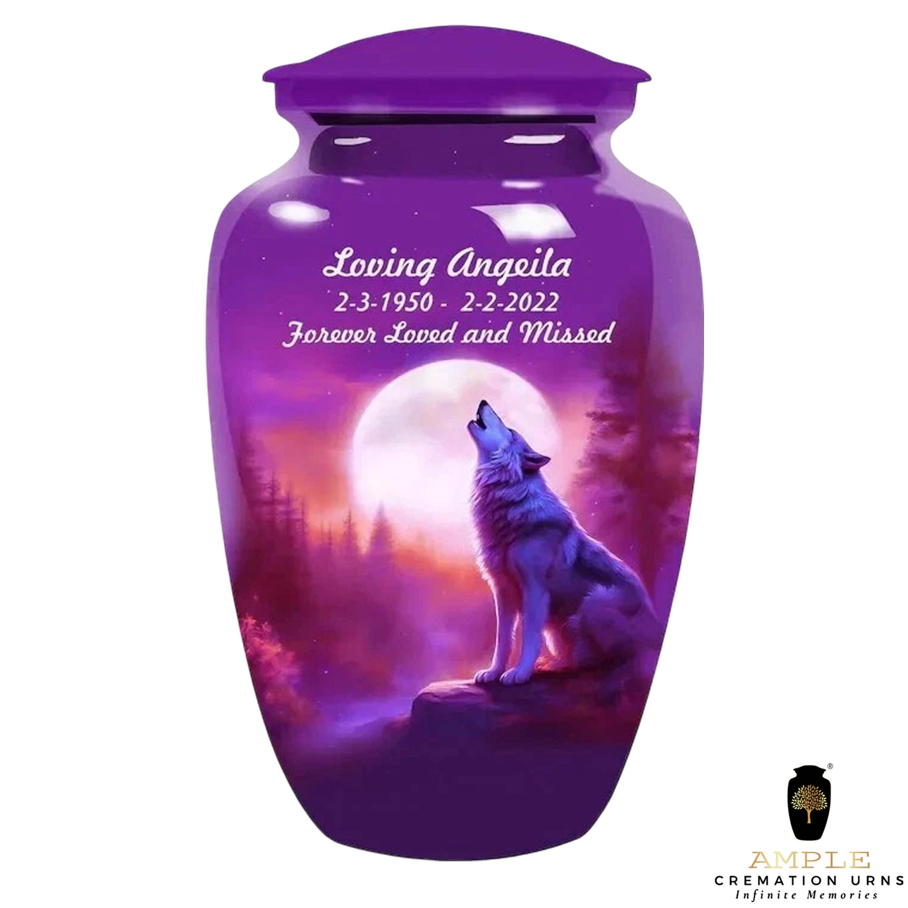 This striking urn features a majestic wolf silhouetted against a brilliant full moon in a deep purple sky. Representing leadership, family, and the wild beauty of nature, the wolf is a powerful symbol for a cherished life. This design allows for custom personalization of a name and dates, making it a unique and lasting tribute.