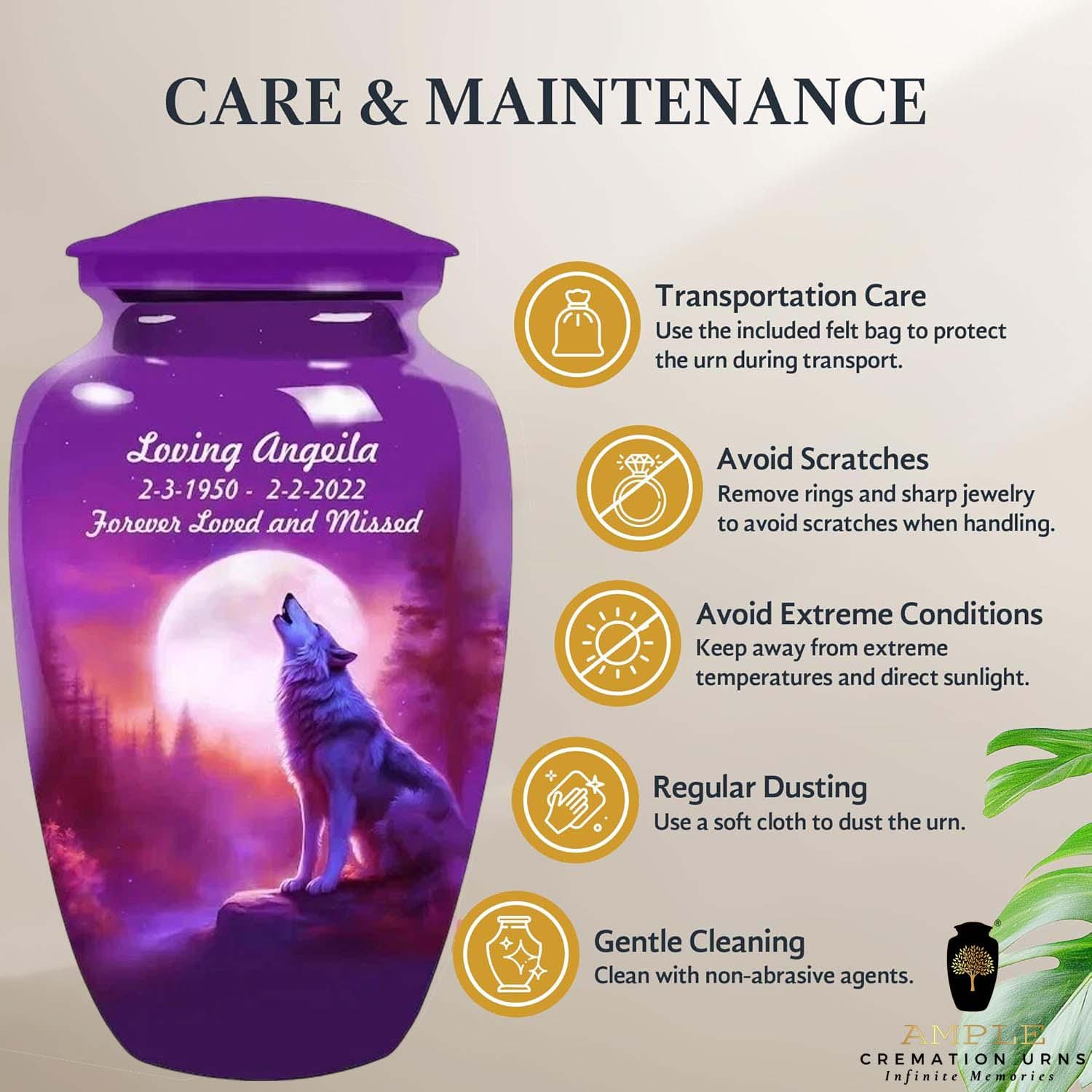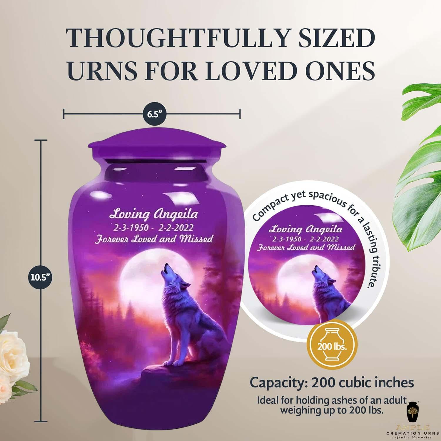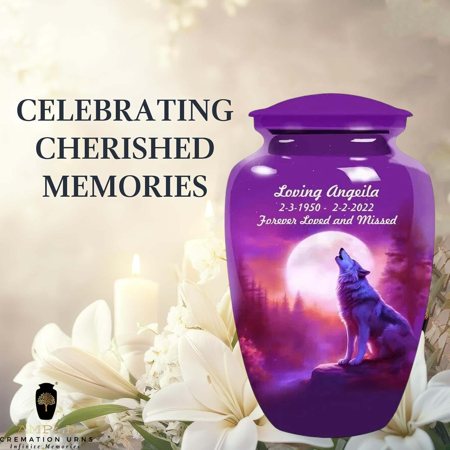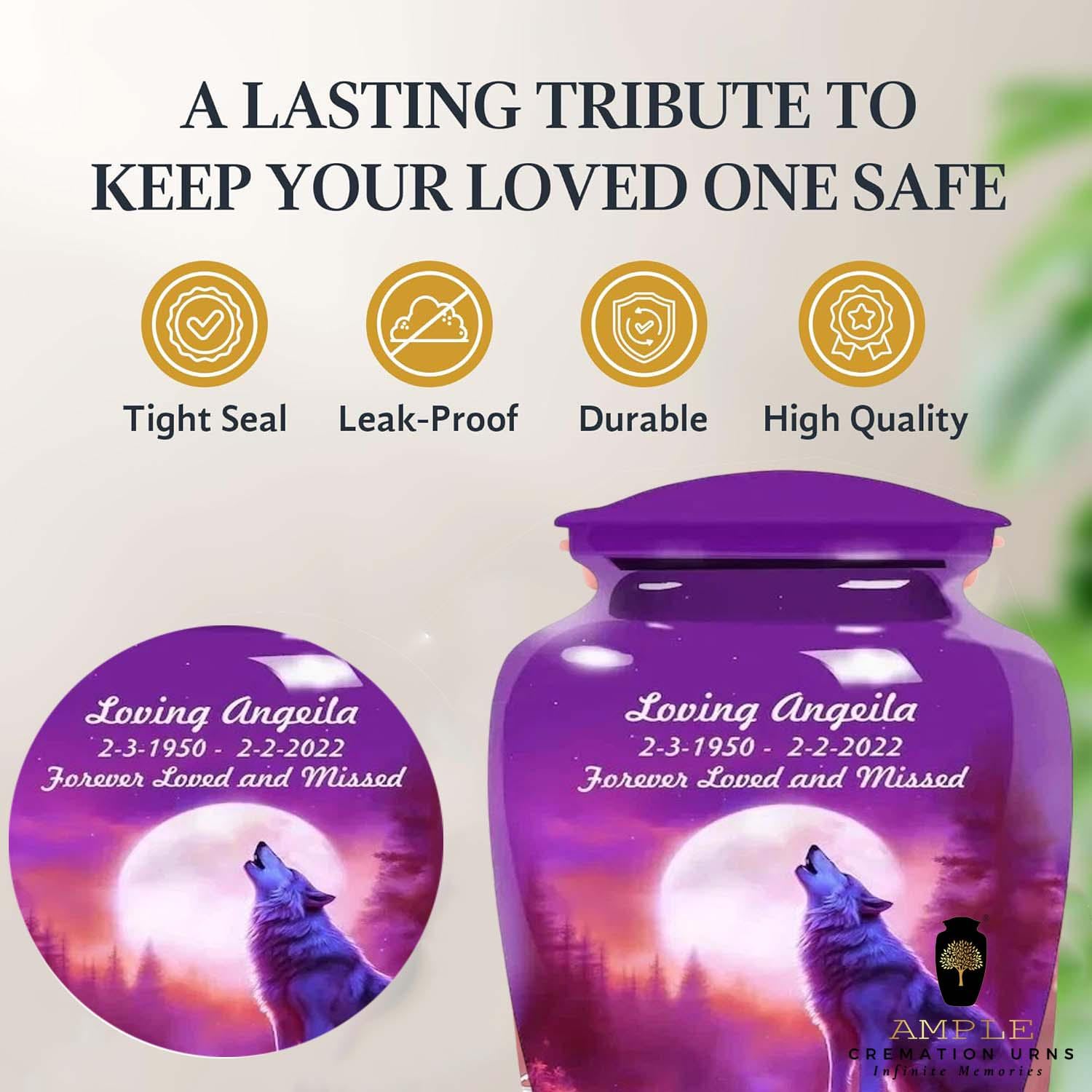 This striking urn features a majestic wolf silhouetted against a brilliant full moon in a deep purple sky. Representing leadership, family, and the wild beauty of nature, the wolf is a powerful symbol for a cherished life. This design allows for custom personalization of a name and dates, making it a unique and lasting tribute.