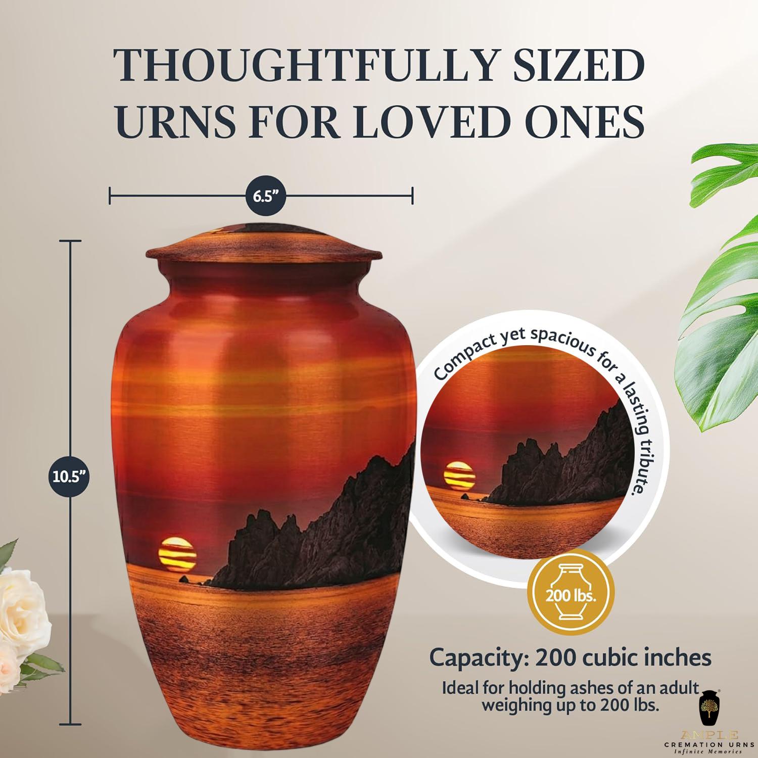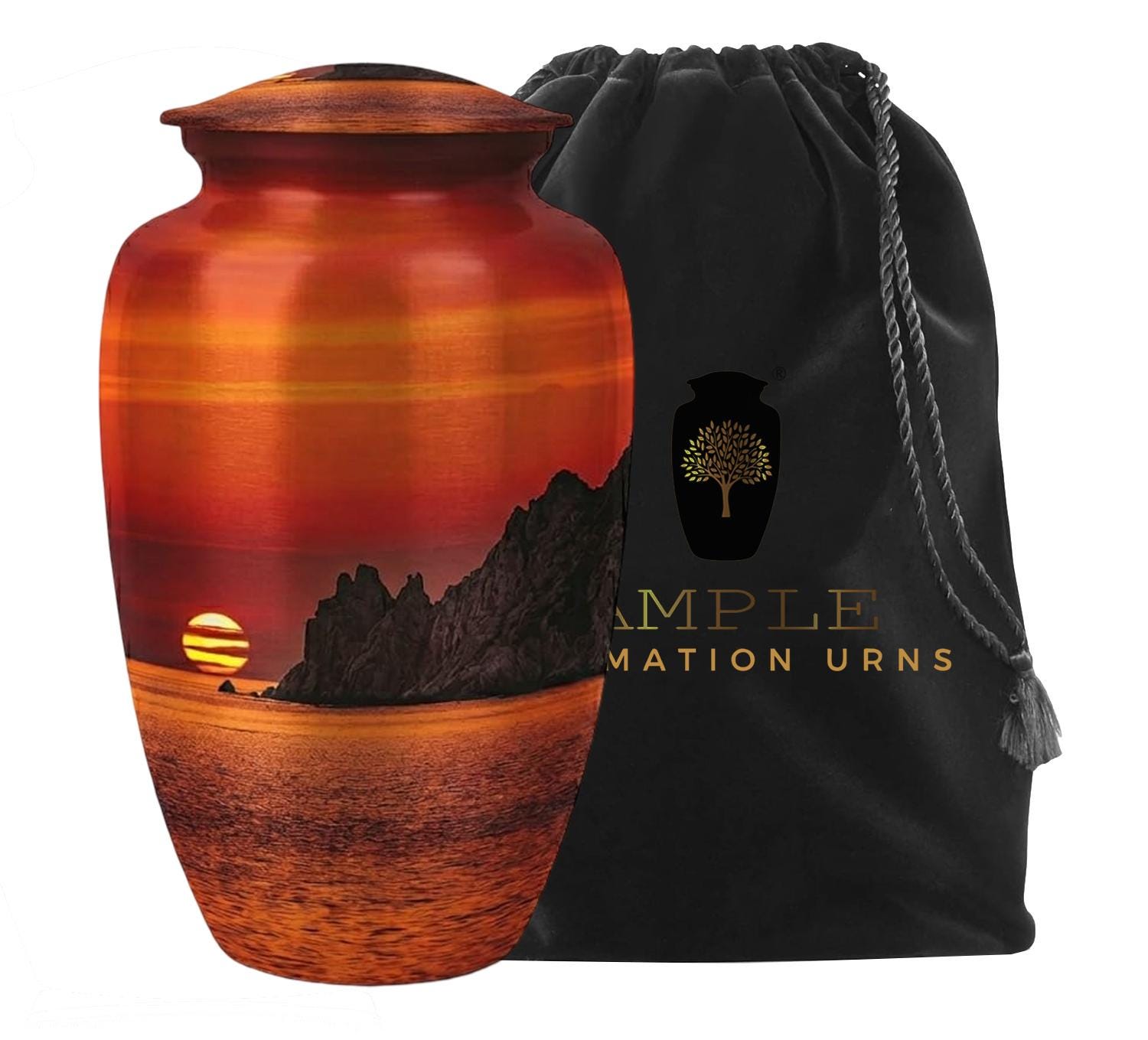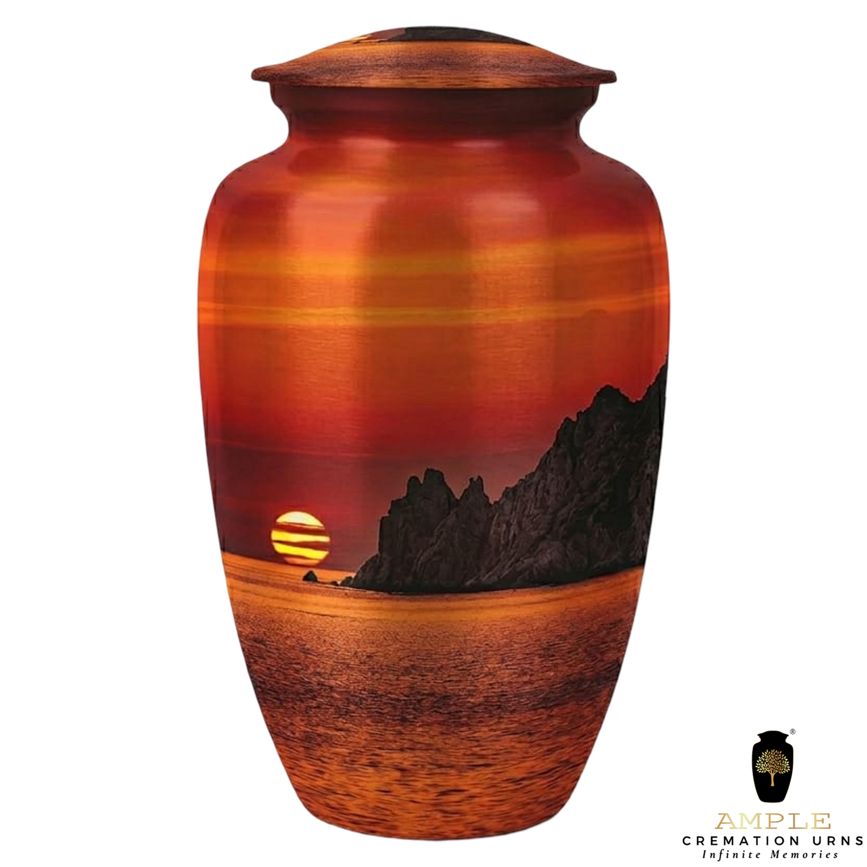 This breathtaking urn captures the final moments of a vibrant sunset over a tranquil ocean, with a radiant sun dipping behind dark coastal rock formations. The deep oranges and warm glows reflected on the water symbolize a peaceful transition and a beautiful legacy. This set includes matching miniature keepsakes, allowing family members to share in this serene coastal tribute by keeping a small token of remembrance close at hand.