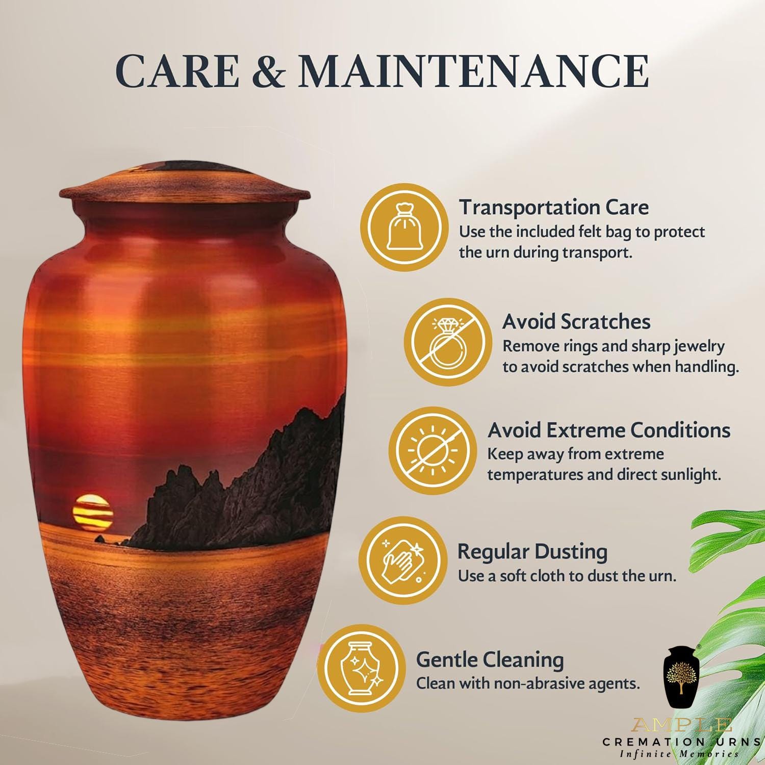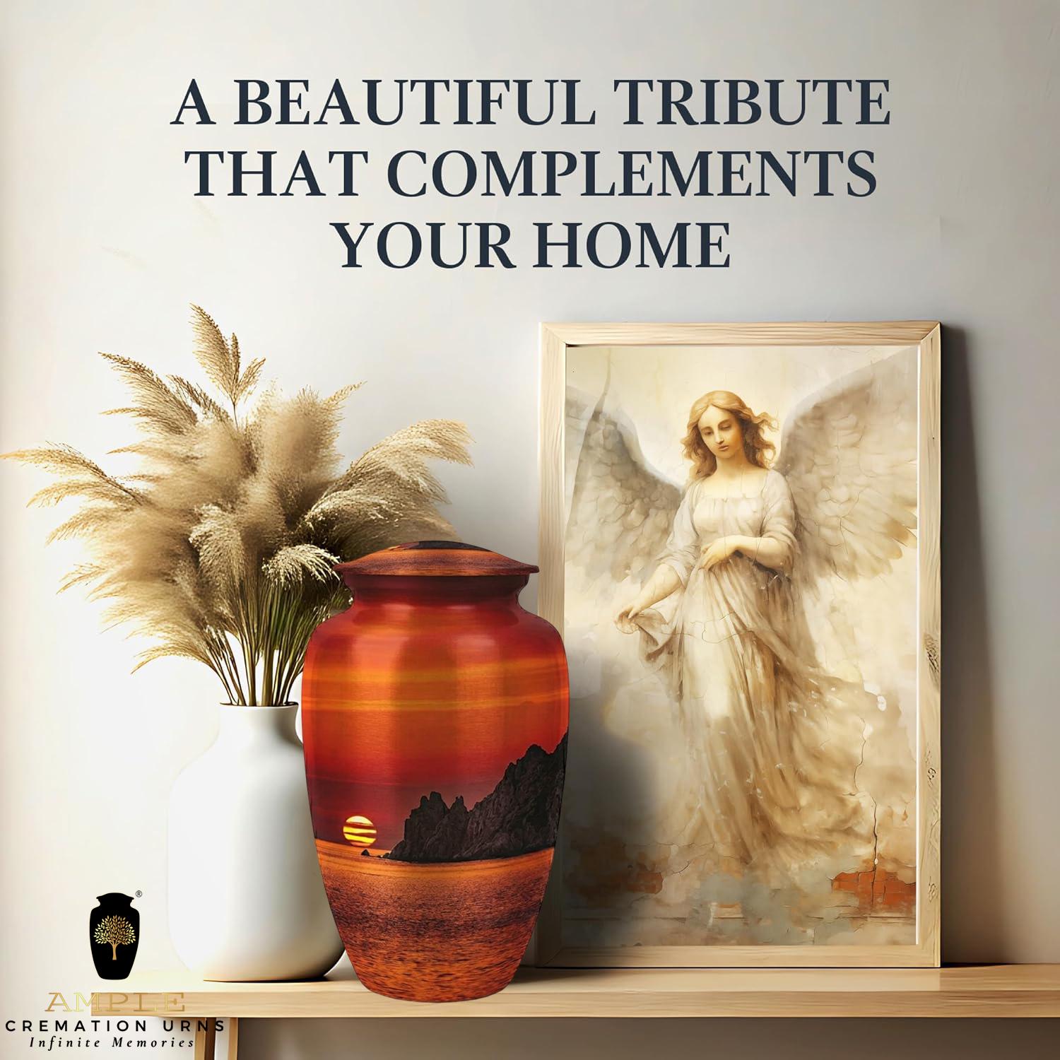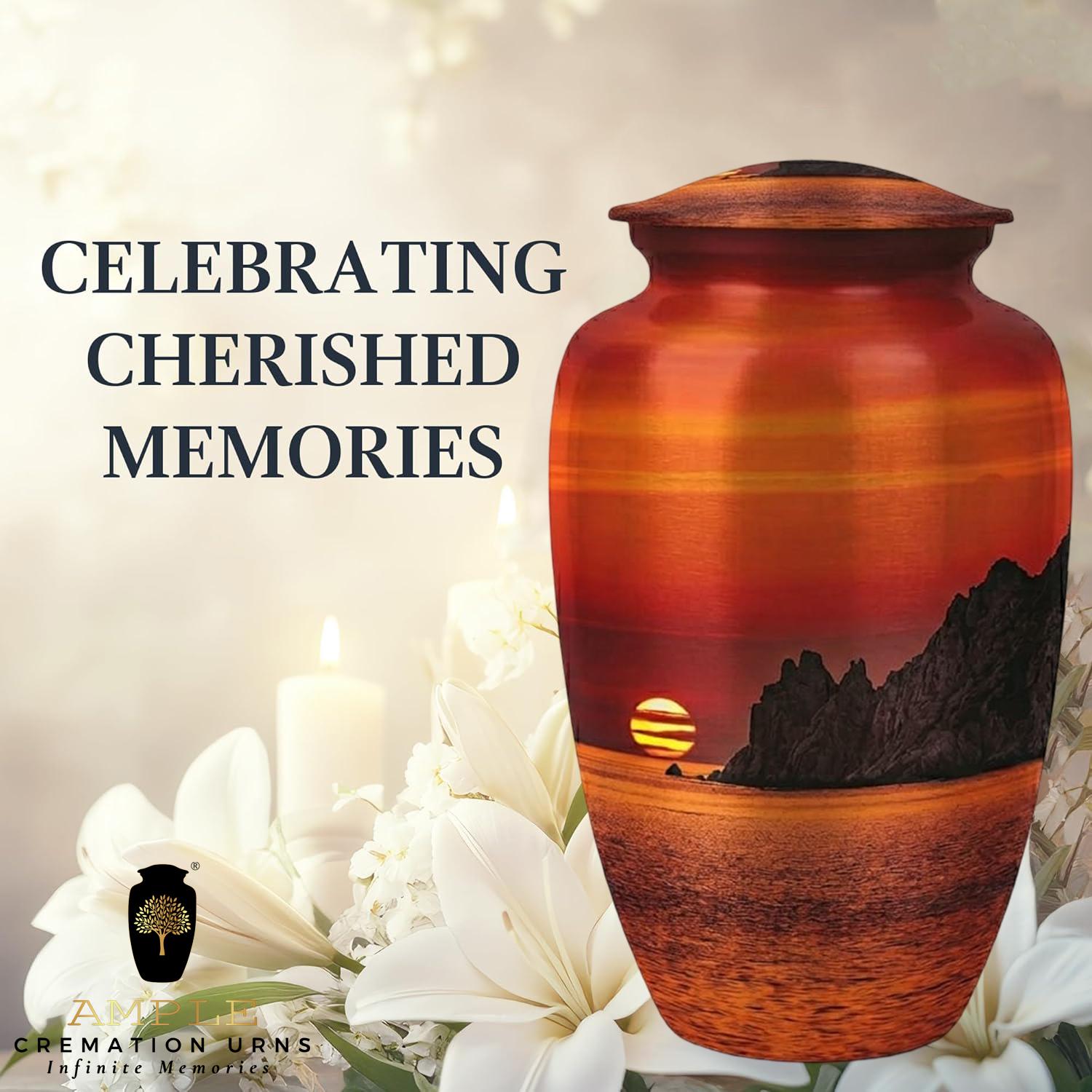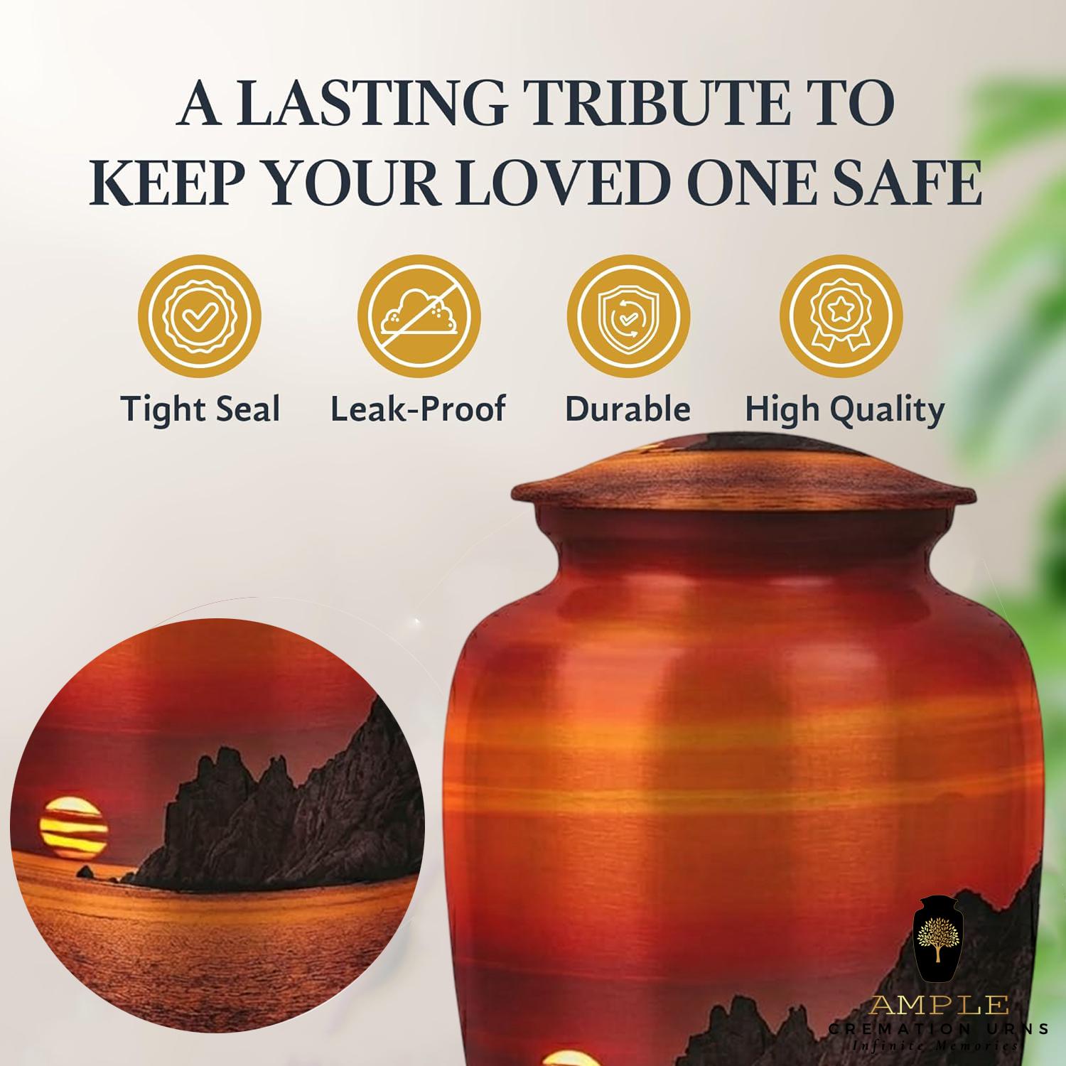 This breathtaking urn captures the final moments of a vibrant sunset over a tranquil ocean, with a radiant sun dipping behind dark coastal rock formations. The deep oranges and warm glows reflected on the water symbolize a peaceful transition and a beautiful legacy. This set includes matching miniature keepsakes, allowing family members to share in this serene coastal tribute by keeping a small token of remembrance close at hand.