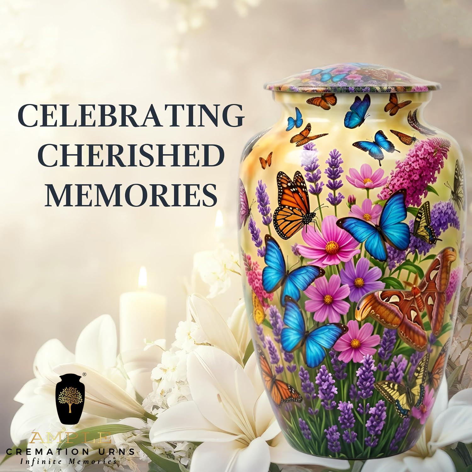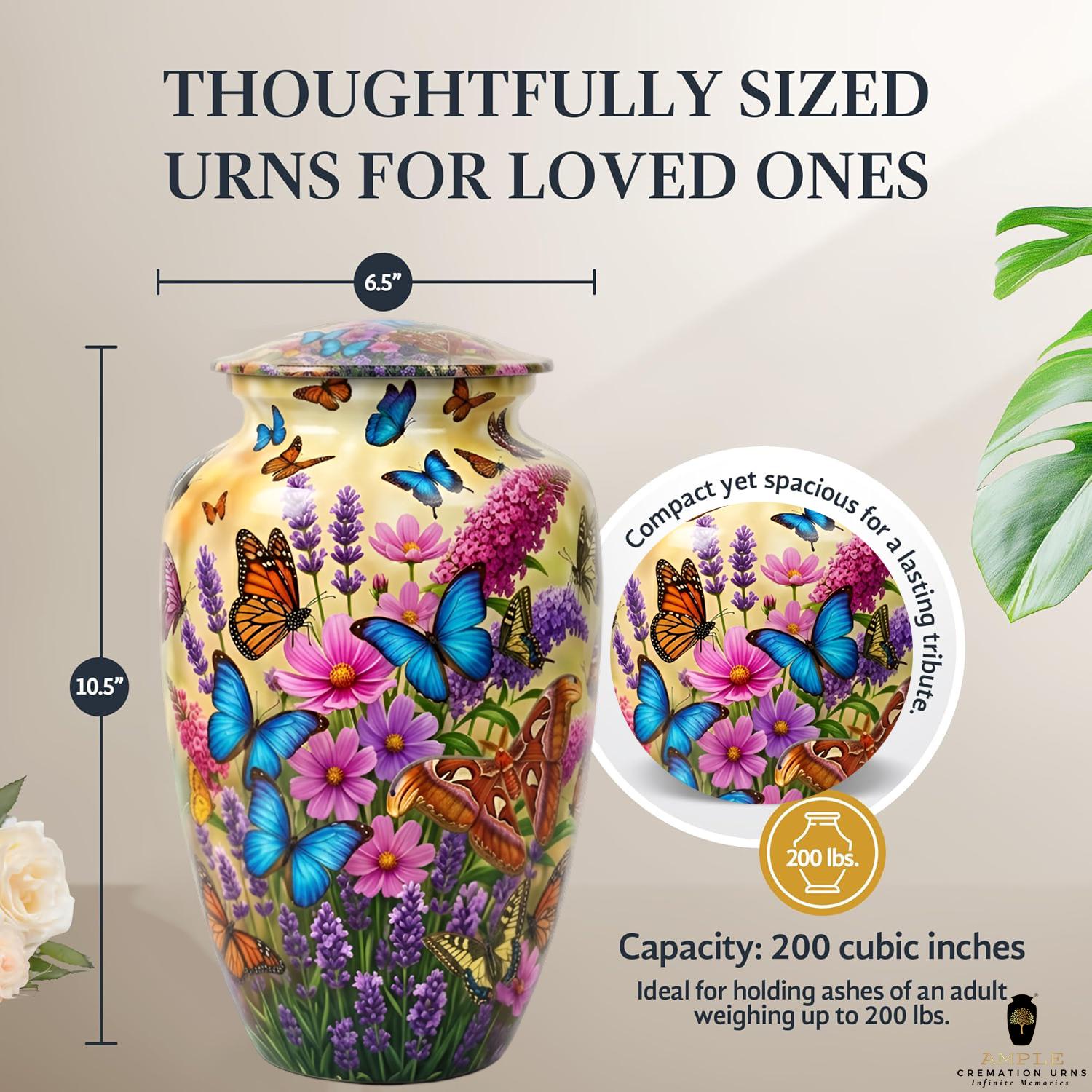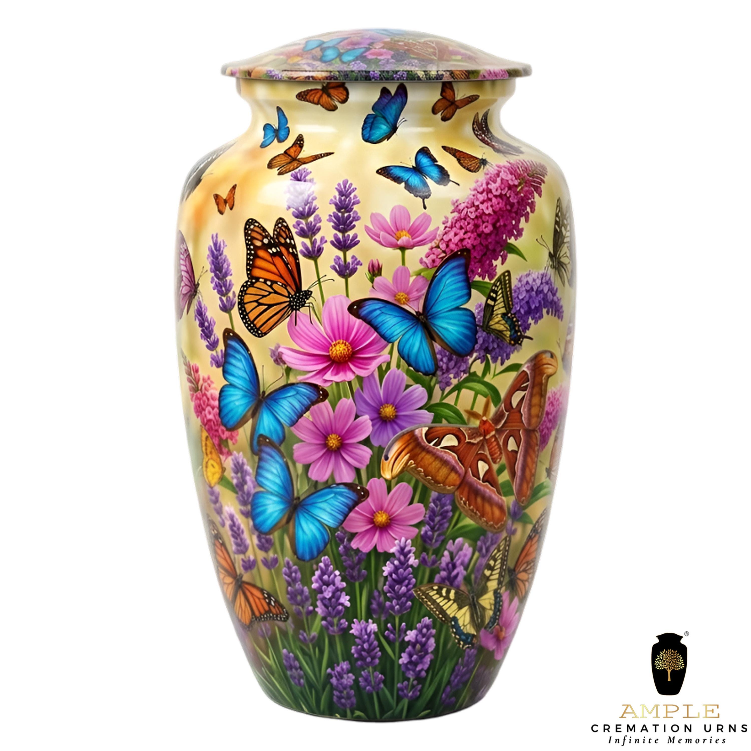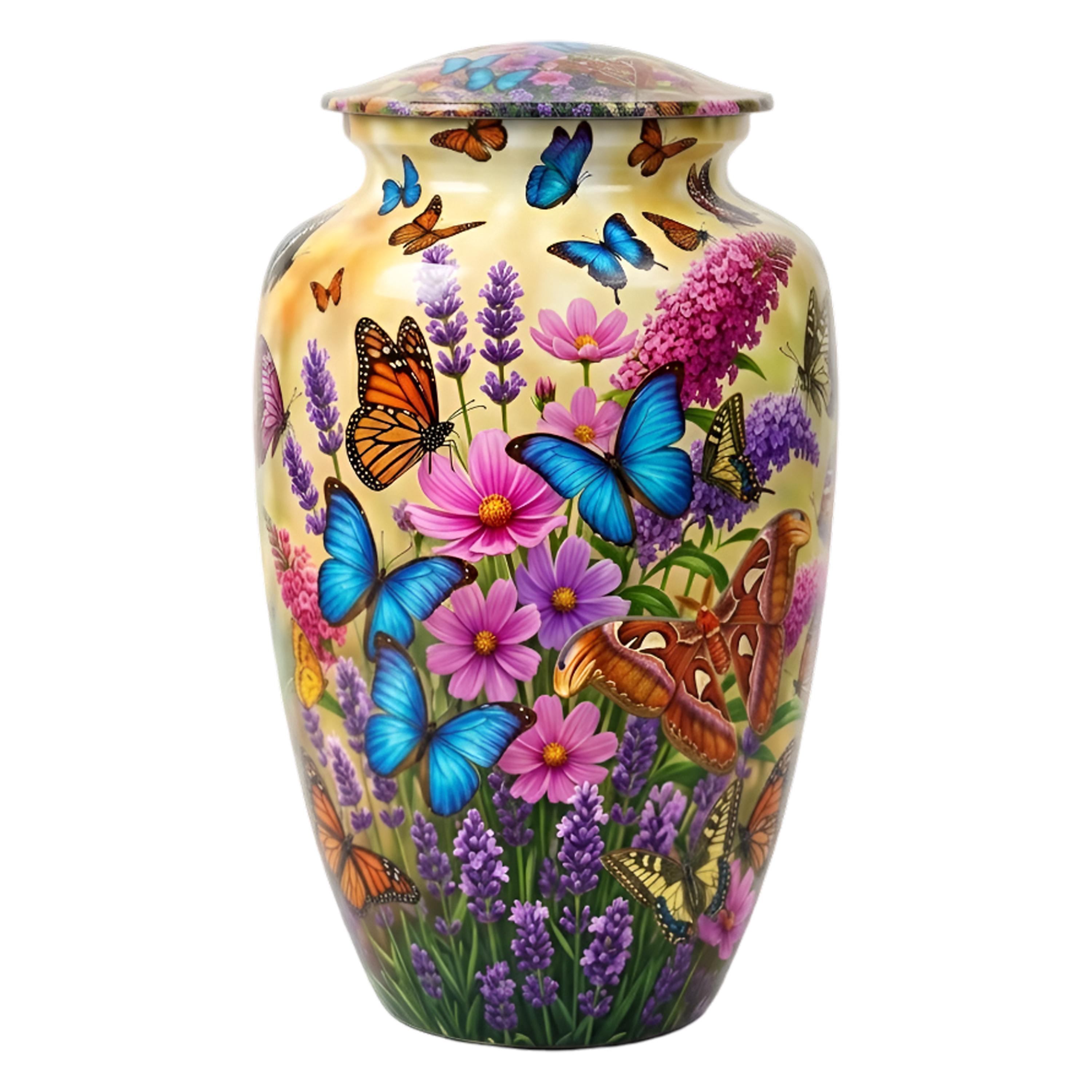 This vibrant urn features a lush garden of purple lavender and pink wildflowers, teeming with a variety of colorful butterflies in mid-flight. The intricate, high-definition imagery symbolizes hope, renewal, and the delicate beauty of a soul in transition. This set includes matching miniature keepsakes, specifically designed to allow multiple family members to find comfort in this blooming garden tribute by keeping a small token of remembrance close at hand.